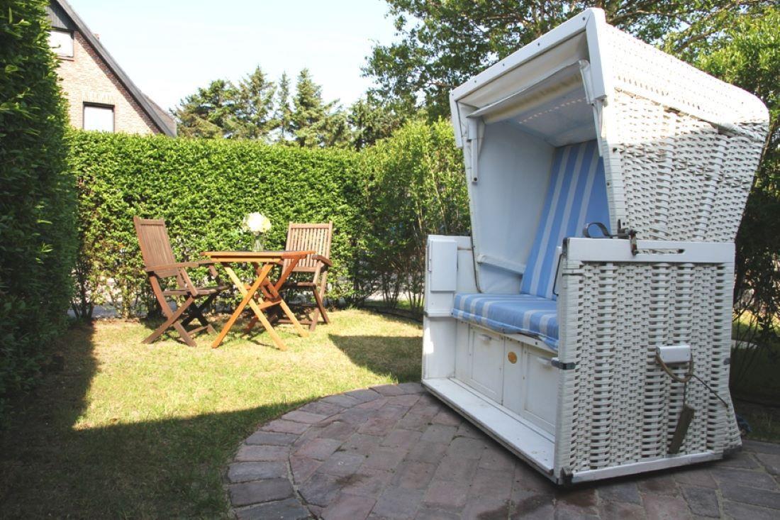 Kleiner Garten mit Strandkorb und Gartenmöbeln.