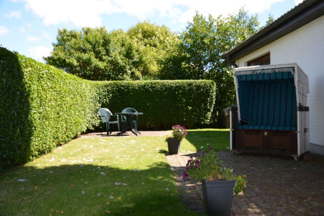 Terrasse mit Strandkorb und Gartenmöbel.