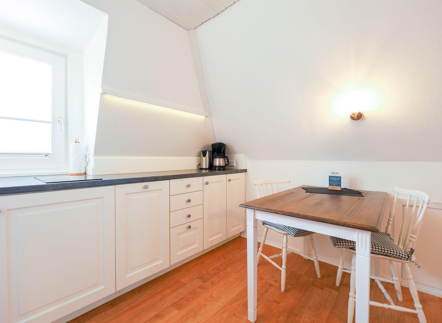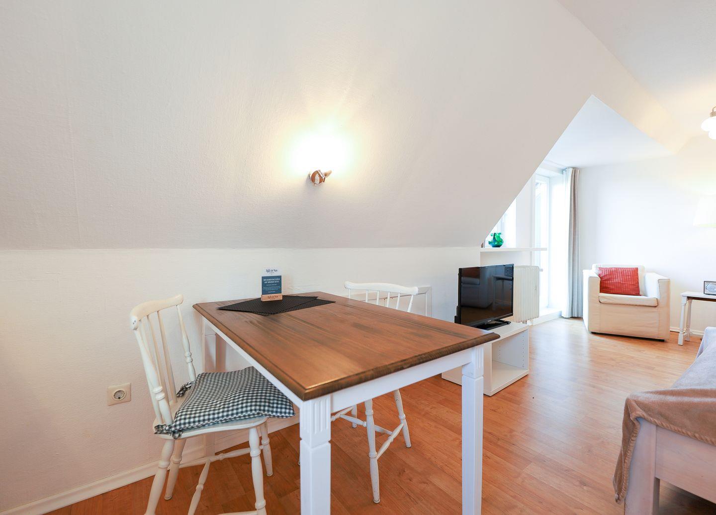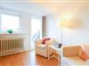 Diese muggelige Komfortzone ist der beste Beweis dafür, dass schlafen, ausspannen, kochen und essen auch in nur einem Raum ganz wunderbar funktionieren. Das komfortable Doppelbett, zwei Sessel, der Esstisch sowie die kleine Küchenzeile bilden eine harmonische Einheit, die nichts vermissen lässt. Bei schönem Wetter bietet der geräumige Nordbalkon eine prima Alternative, um den Tag beginnen oder ausklingen zu lassen.