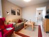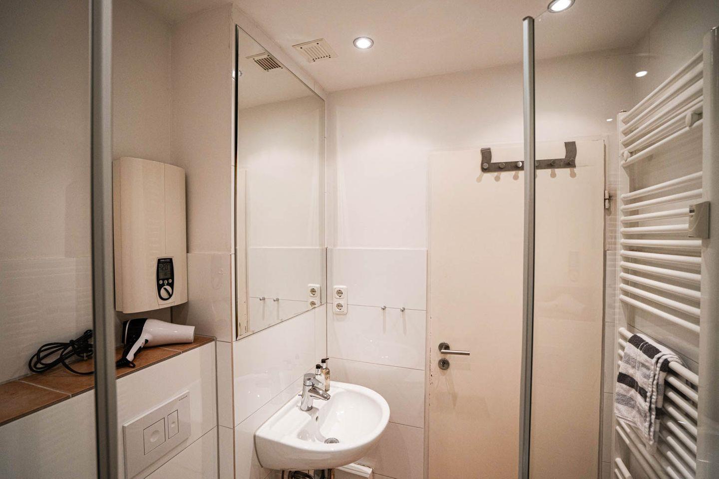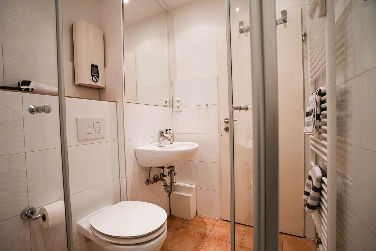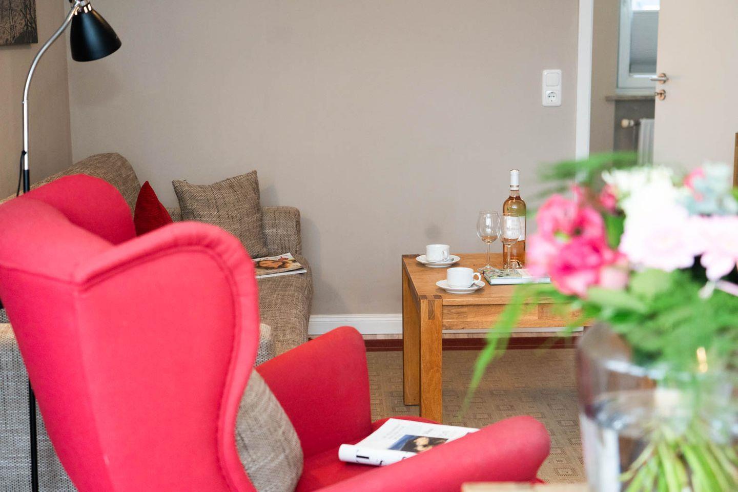 Die Ferien-Wohnung ist liebevoll in aktuellem Greige mit roten Farbtupfern eingerichtet und über das Standardmaß hinaus ausgestattet, was Küchenutensilien an geht. Auch steht eine Waschmaschine samt Trockner zur gemeinschaftlichen Nutzung im Appartementhaus parat. Das Haus hat einen Fahrstuhl, die Wohnung liegt im zweiten Stock.
