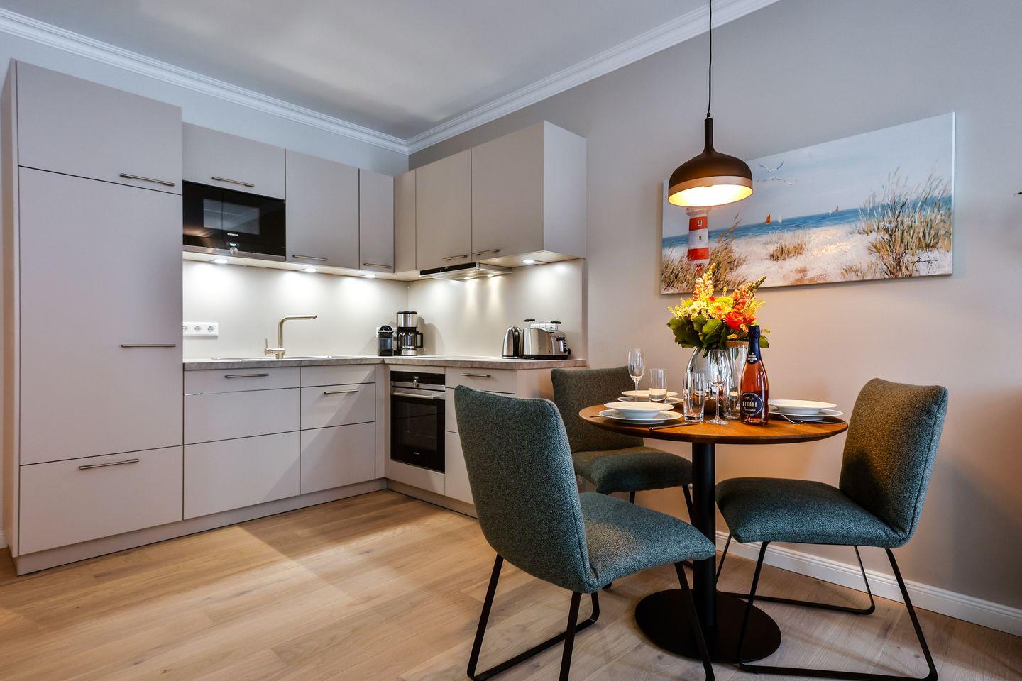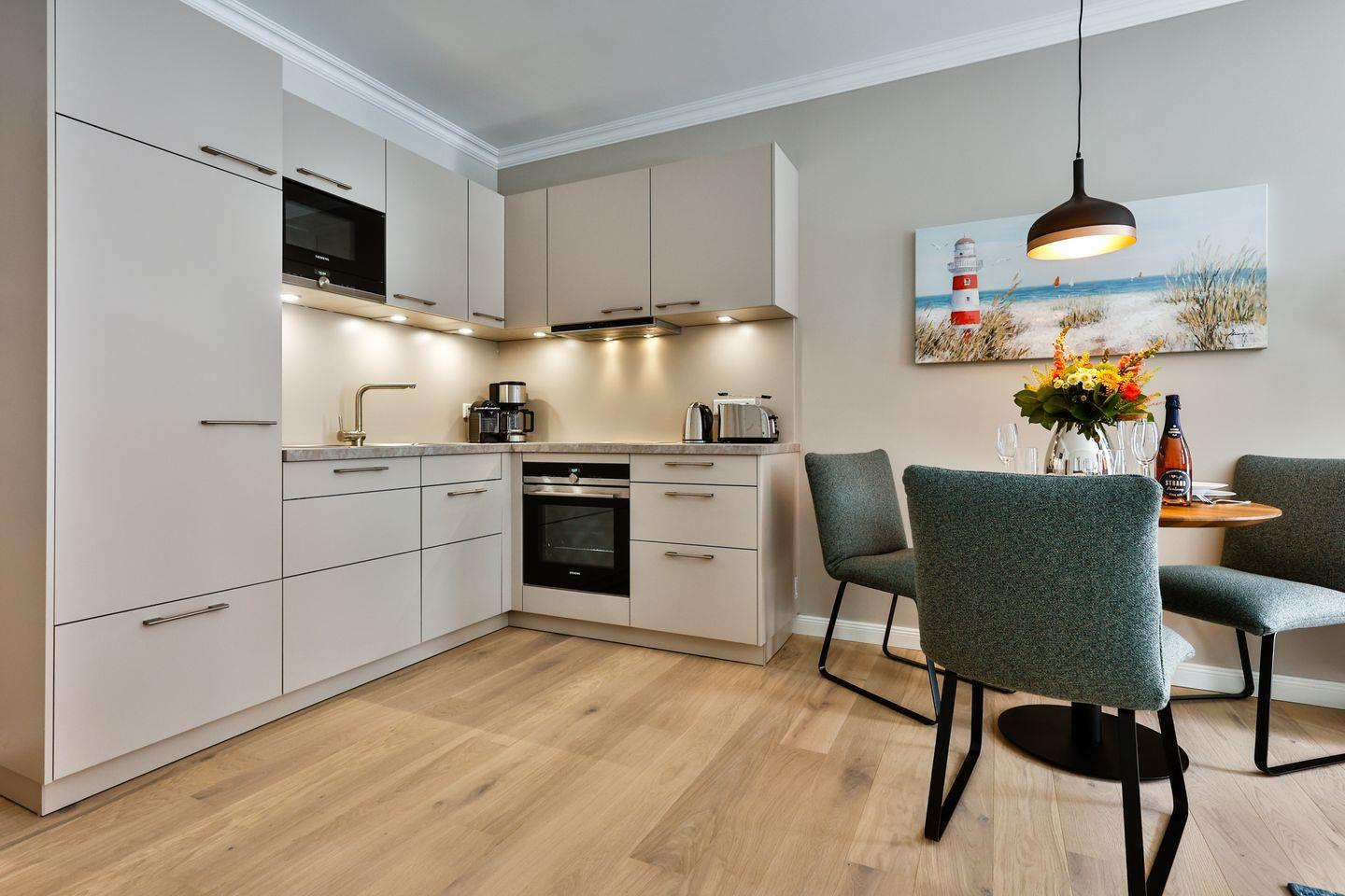 Die offene Küche bietet alles, was Sie in einer Küche erwarten. Hochwertige Elektrogeräte und eine umfangreiche Ausstattung machen das Kochen und Zubereiten zum Genuss. Genießen Sie gemeinsame Mahlzeiten oder entspannte Kaffeepausen im angrenzenden Essbereich.