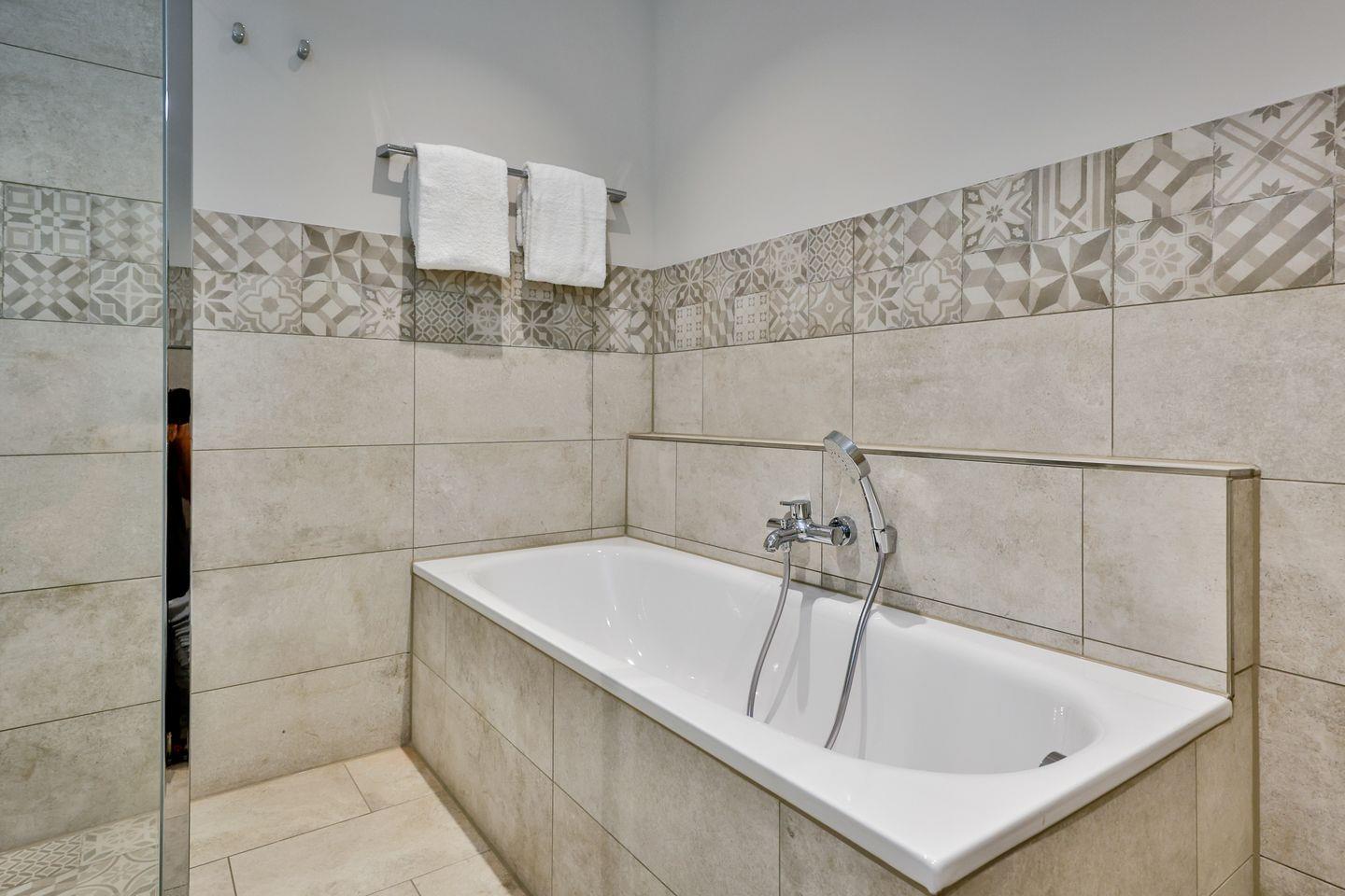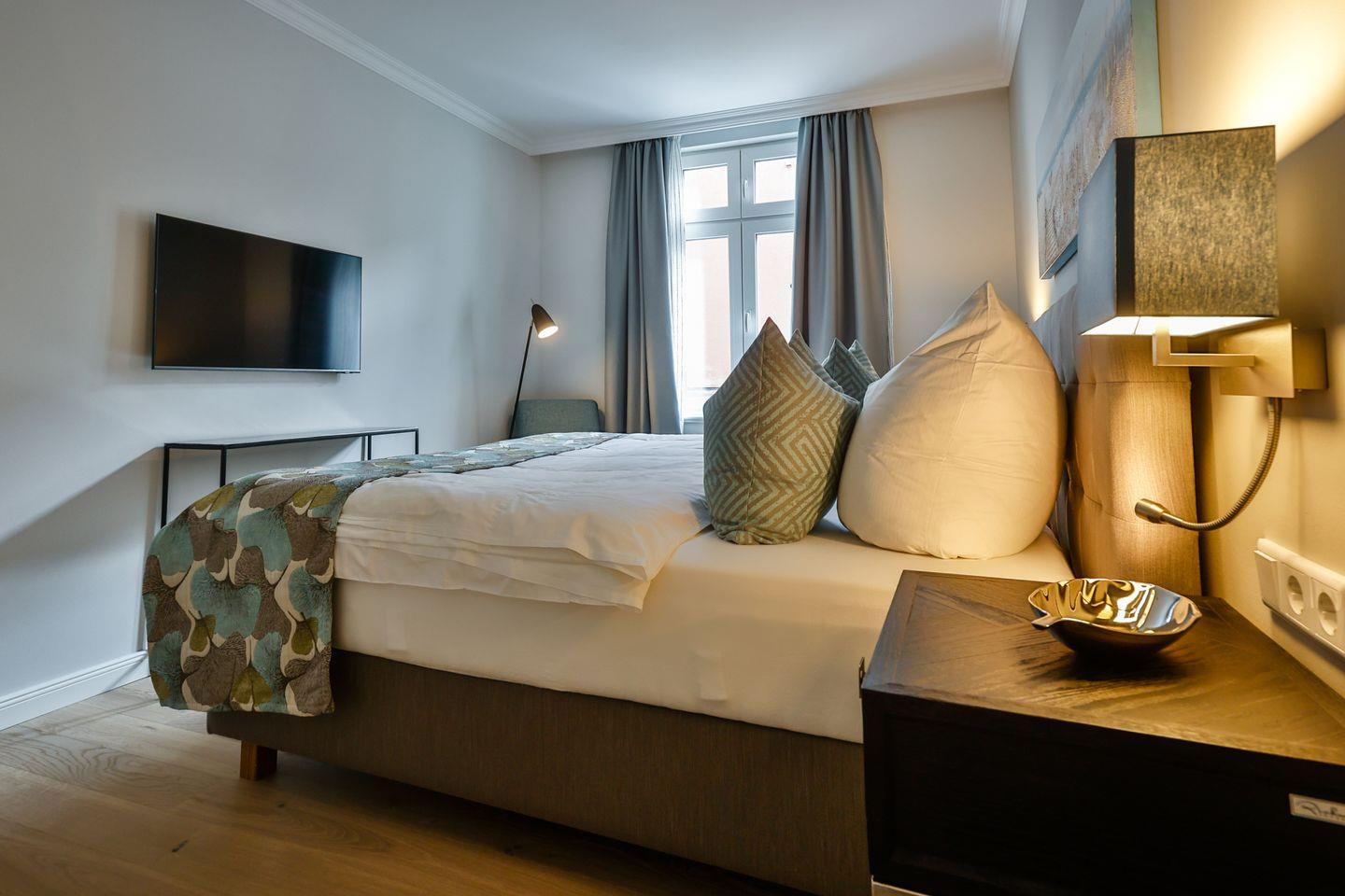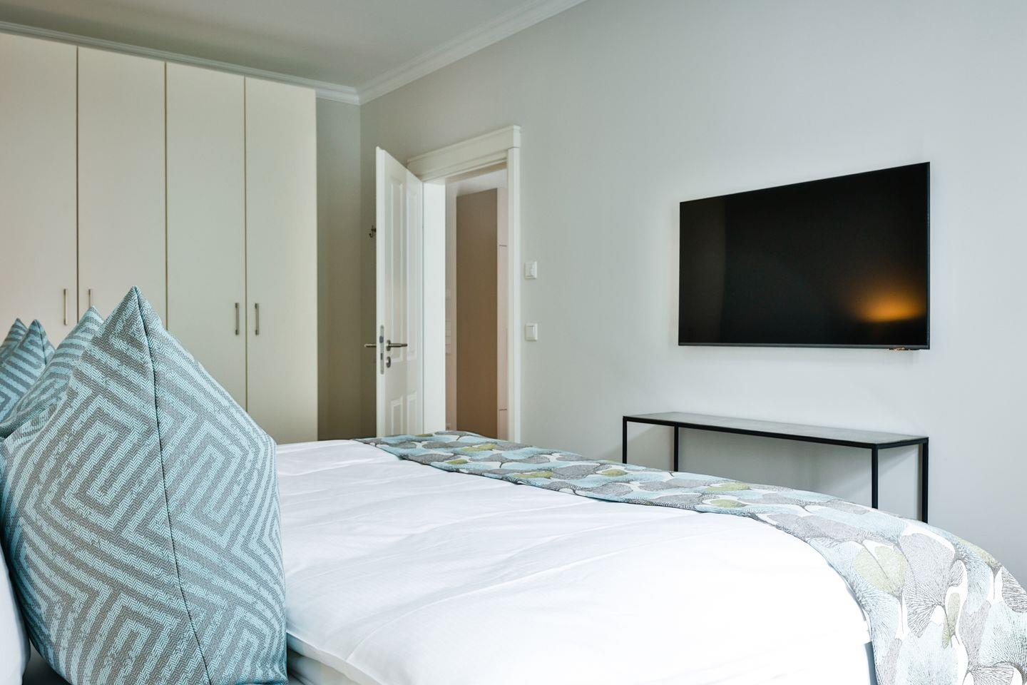 Das Schlafzimmer ist mit einem komfortablen Boxspringbett (180x200 cm) und TV ausgestattet und sorgt mit geschmackvollem Ambiente für erholsame Nächte. Die Wohnung bietet ein modernes Badezimmer mit ebenerdiger Dusche, WC, Fön und einer Badewanne zum Entspannen und Wohlfühlen.