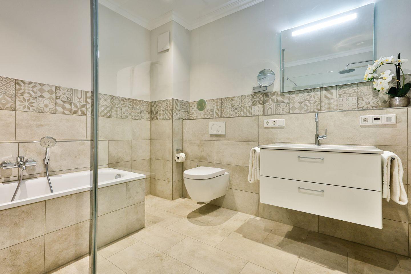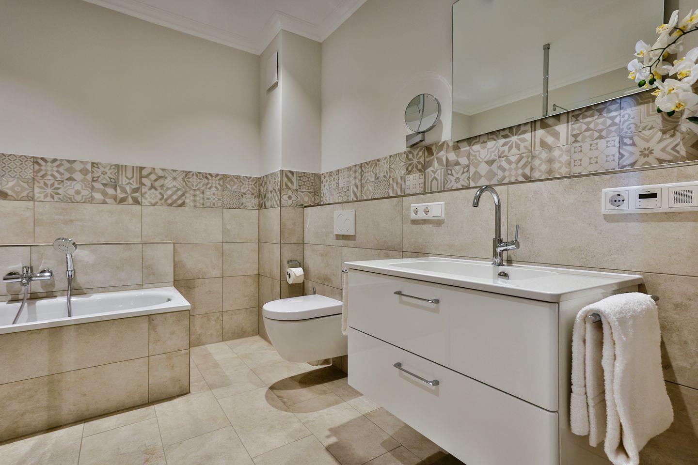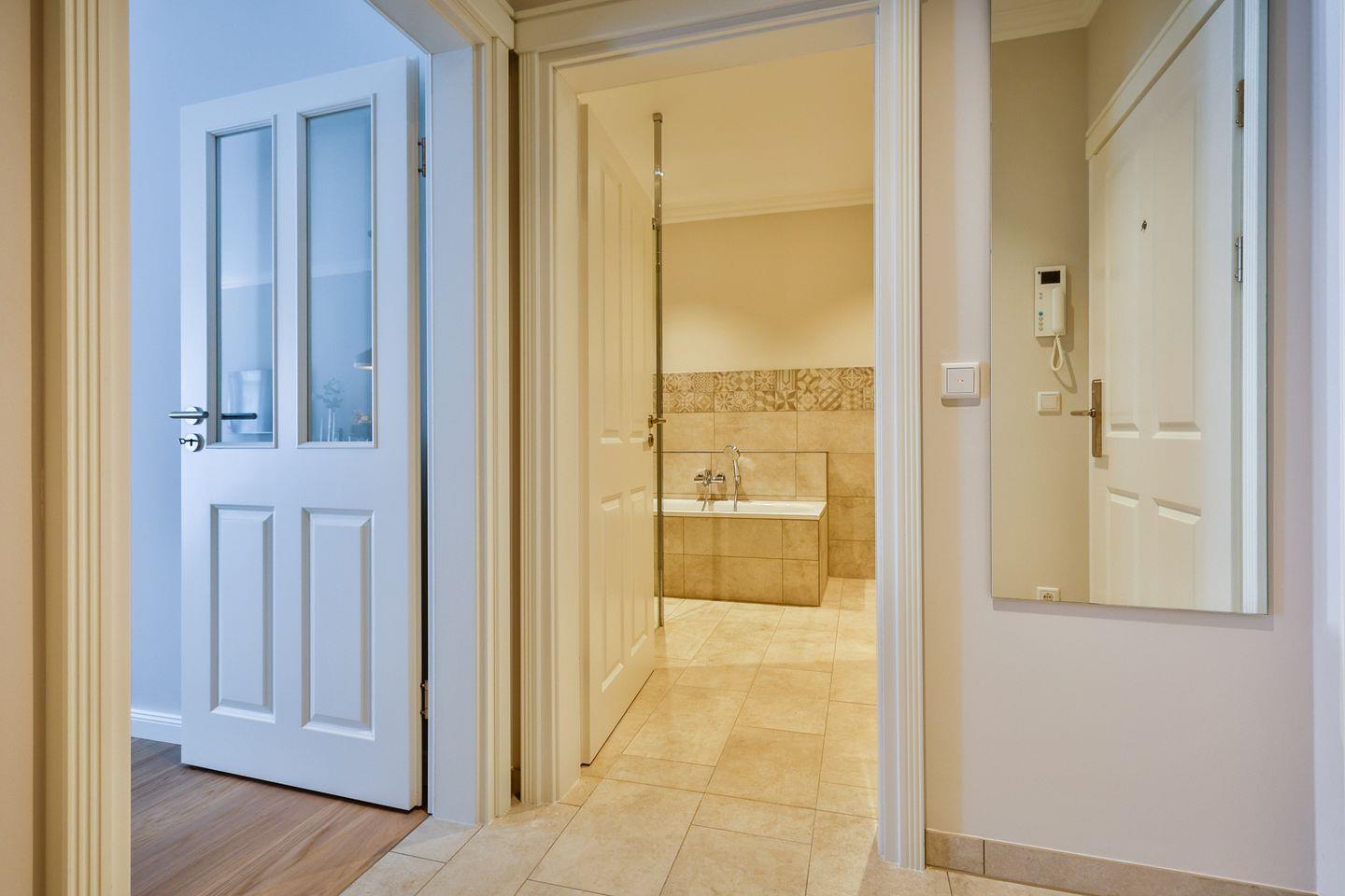 Das Schlafzimmer ist mit einem komfortablen Boxspringbett (180x200 cm) und TV ausgestattet und sorgt mit geschmackvollem Ambiente für erholsame Nächte. Die Wohnung bietet ein modernes Badezimmer mit ebenerdiger Dusche, WC, Fön und einer Badewanne zum Entspannen und Wohlfühlen.