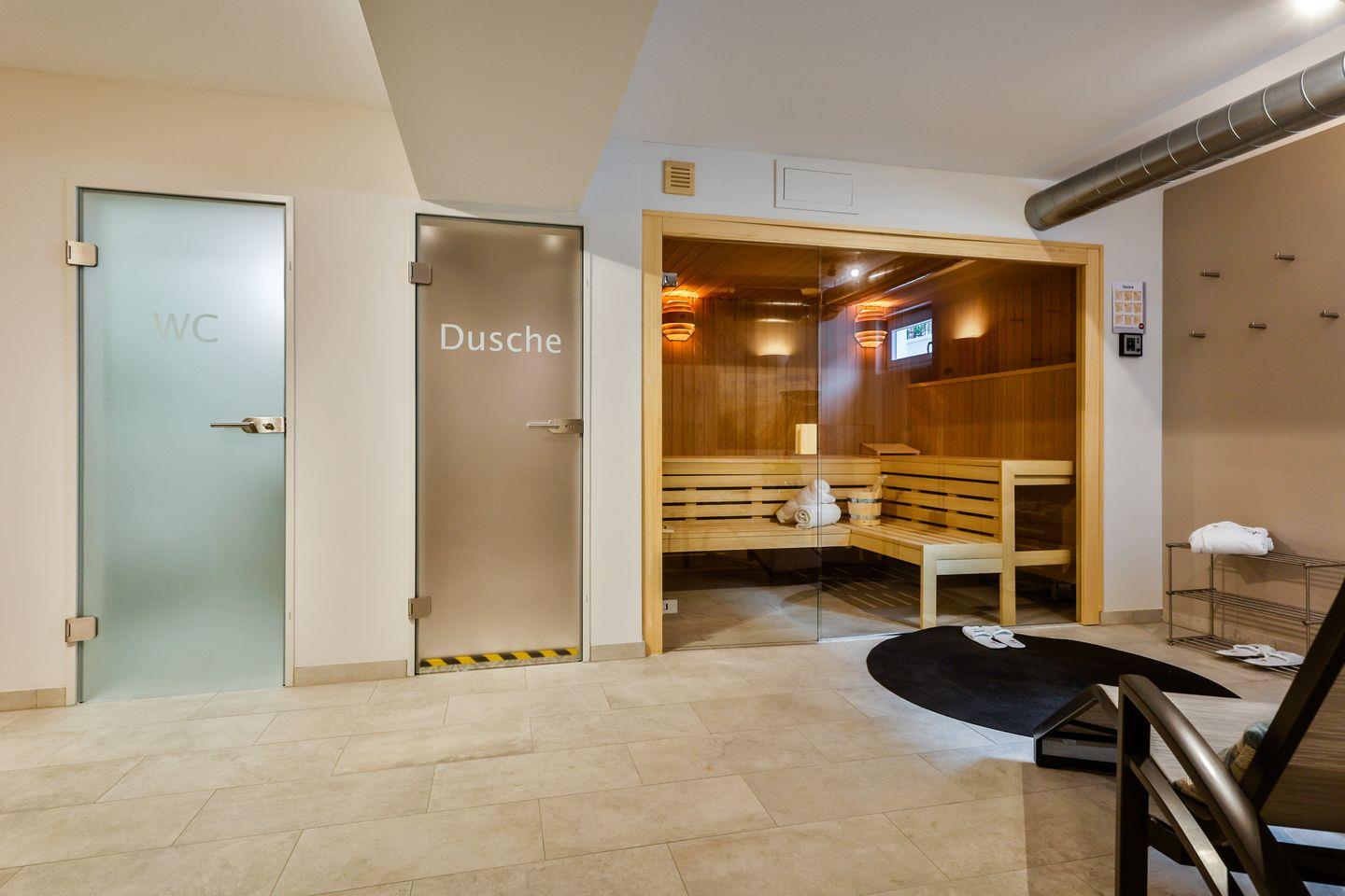Der gemeinschaftliche Wellnessbereich im Untergeschoss steht Ihnen täglich zwischen 16:00 und 20:00 Uhr zur Verfügung und bietet einen Sauna- und Ruhebereich für Ihre Erholung.