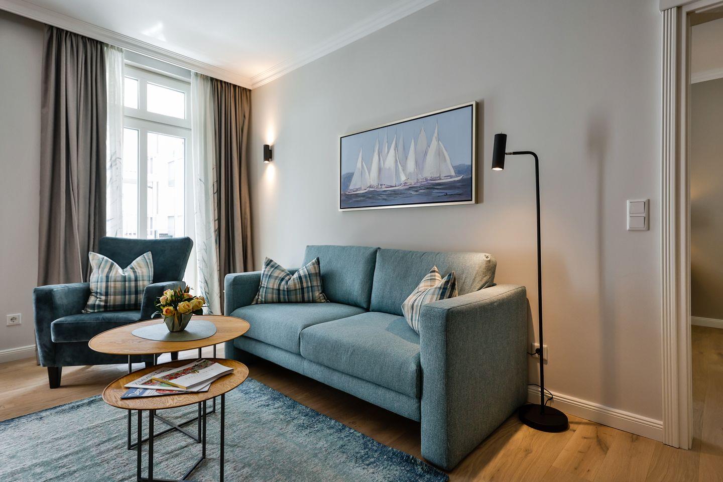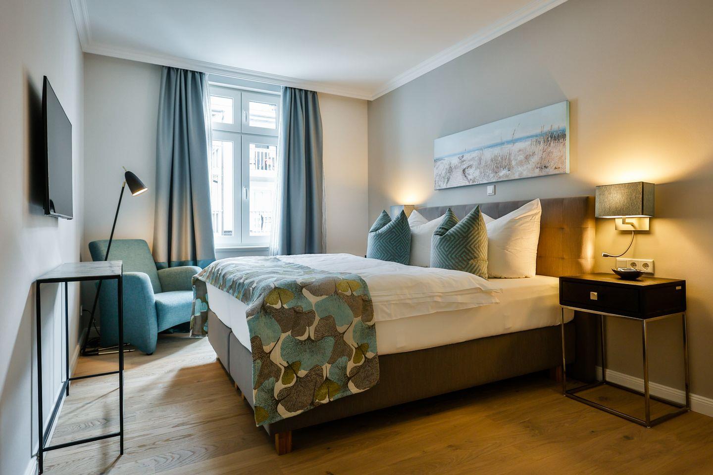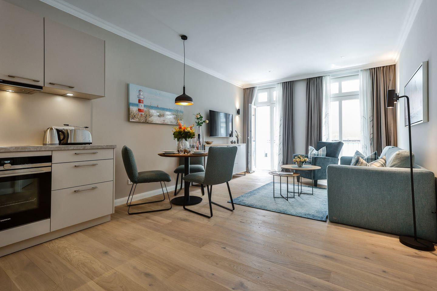 Diese moderne 2-Zimmer-Ferienwohnung im ersten Obergeschoss des Logierhauses Jonna bietet auf ca. 56 m² großzügigen Raum für bis zu 2 Personen. Verbringen Sie entspannte Urlaubstage auf Sylt in zentraler Lage von Westerland. Die Einkaufsmeile Friedrichstraße ist nur wenige Schritte entfernt und die Strandpromenade erreichen Sie fußläufig in ein paar Minuten. Genießen Sie die ruhige Atmosphäre dieser stilvollen Ferienwohnung mit Fußbodenheizung, sonnigem Südbalkon und einem gemeinschaftlichen Wellnessbereich.