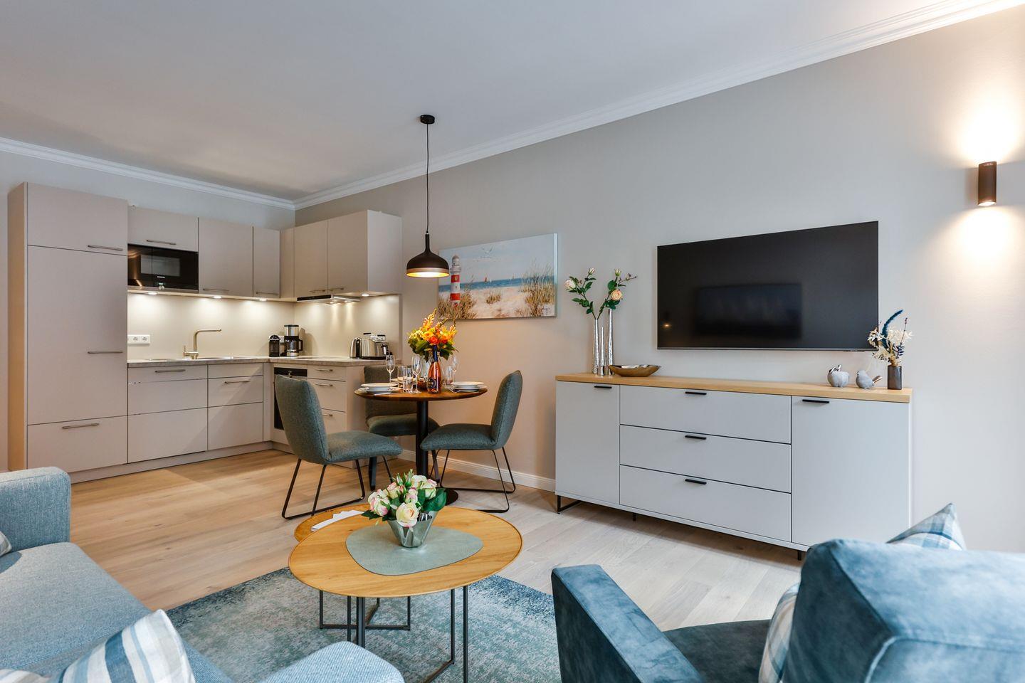 1 Schlafzimmer, 1 Badezimmer mit Dusche und Badewanne, offene Küche zum Wohn/Essbereich, Wohnzimmer mit Zugang zum Balkon (Südausrichtung), gemeinschaftlicher Wellnessbereich mit Sauna, Waschtrockner (Kombigerät), WLAN (ohne Gewähr) vorhanden, kostenpflichtiger Pkw-Stellplatz in Tiefgarage (maximale Einfahrtshöhe beträgt 2m) und Ladestation für E-Autos und E-Bikes verfügbar. Haustiere nicht gestattet.