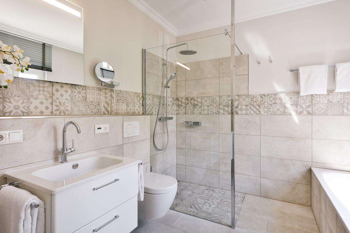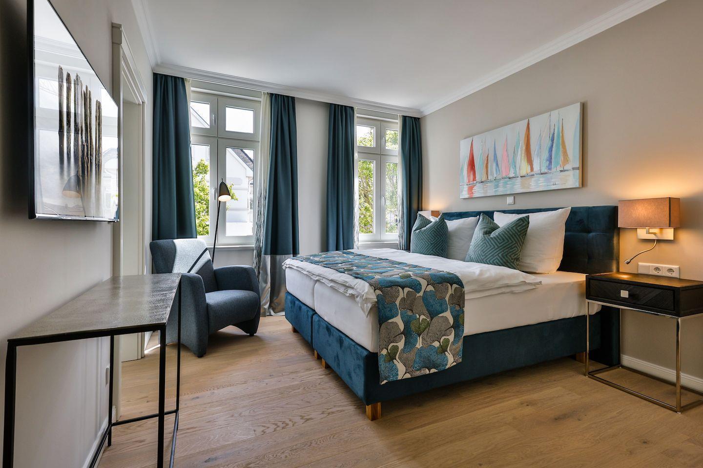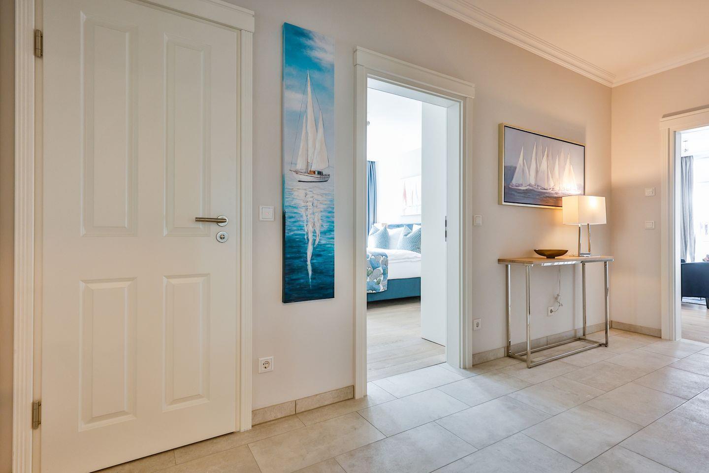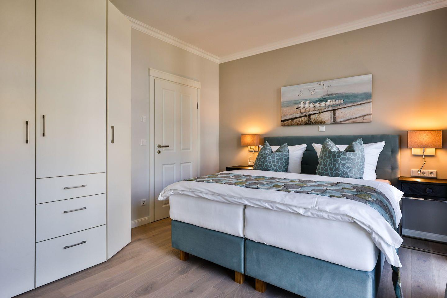 Beide Schlafzimmer sind sehr geschmackvoll eingerichtet und bieten höchsten Schlafkomfort. Das Hauptschlafzimmer ist mit einem Boxspringbett (180x200 cm) und TV ausgestattet. Das zweite Schlafzimmer ist ebenfalls mit einem Boxspringbett (160x200 cm) und TV eingerichtet. Beide Zimmer haben ein ruhiges Ambiente für erholsame Nächte. Die Wohnung bietet zwei moderne Badezimmer, die mit ebenerdigen Duschen, WC und Fön ausgestattet sind; ein Badezimmer hat zusätzlich eine Badewanne zum Entspannen und Wohlfühlen. Abgerundet wird der Bereich durch ein separates Gäste-WC.