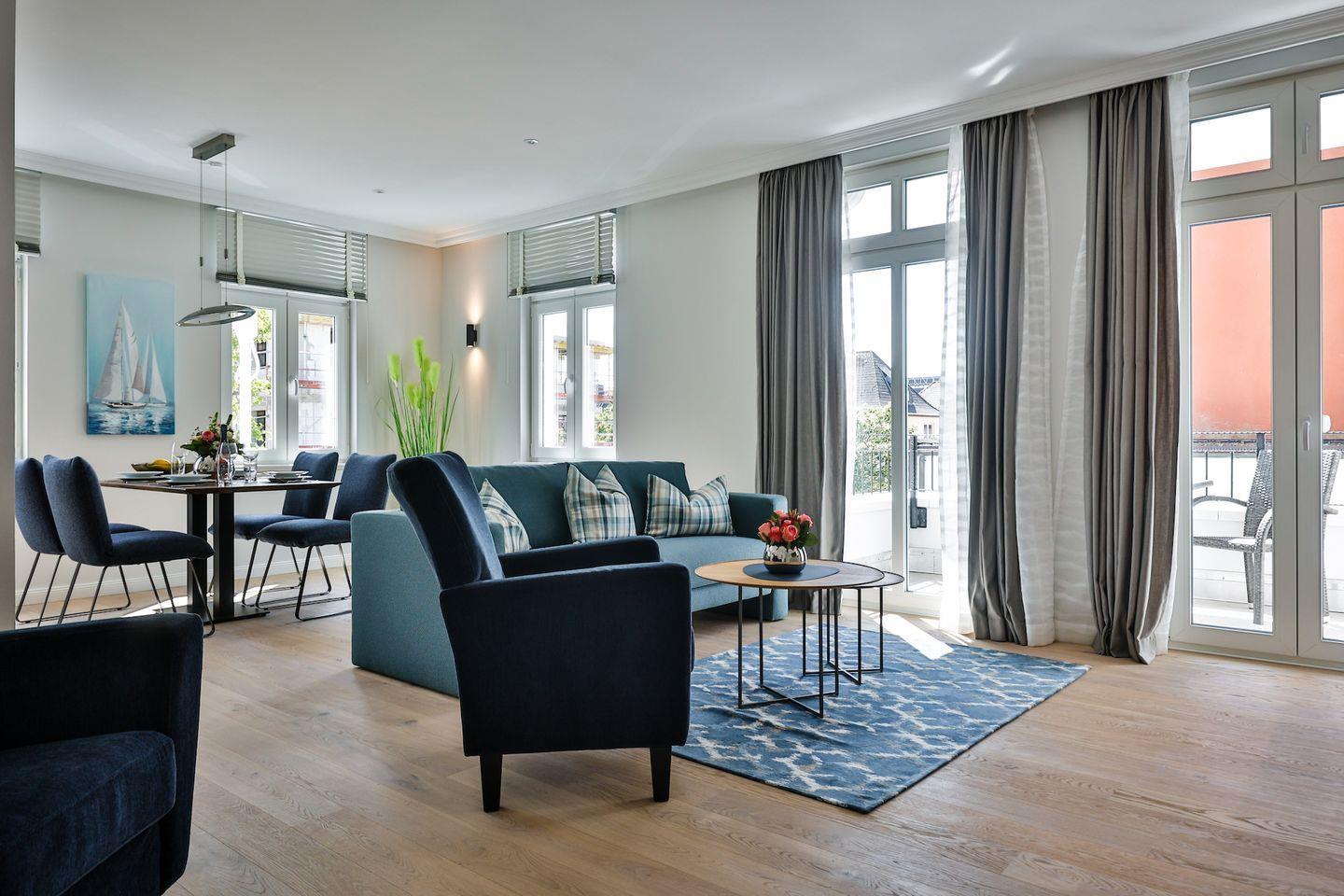 Der lichtdurchflutete Wohn- und Essbereich lädt zum Verweilen ein und hat einen direkten Zugang zum Südbalkon. Hier scheint die Sonne zu fast jeder Tageszeit. Lassen Sie dort den Abend ausklingen. Den Nordbalkon begehen Sie von einem der Schlafzimmer aus. Die hochwertige Loewe klang s3-Anlage sorgt für ein exklusives Klangerlebnis und verfügt über Digital-Radio, Bluetooth, CD-Player und USB-Anschlüsse. Mit dem großzügigen Raumangebot und der modernen Einrichtung wird das Wohnzimmer zum idealen Ort der Entspannung und Erholung.