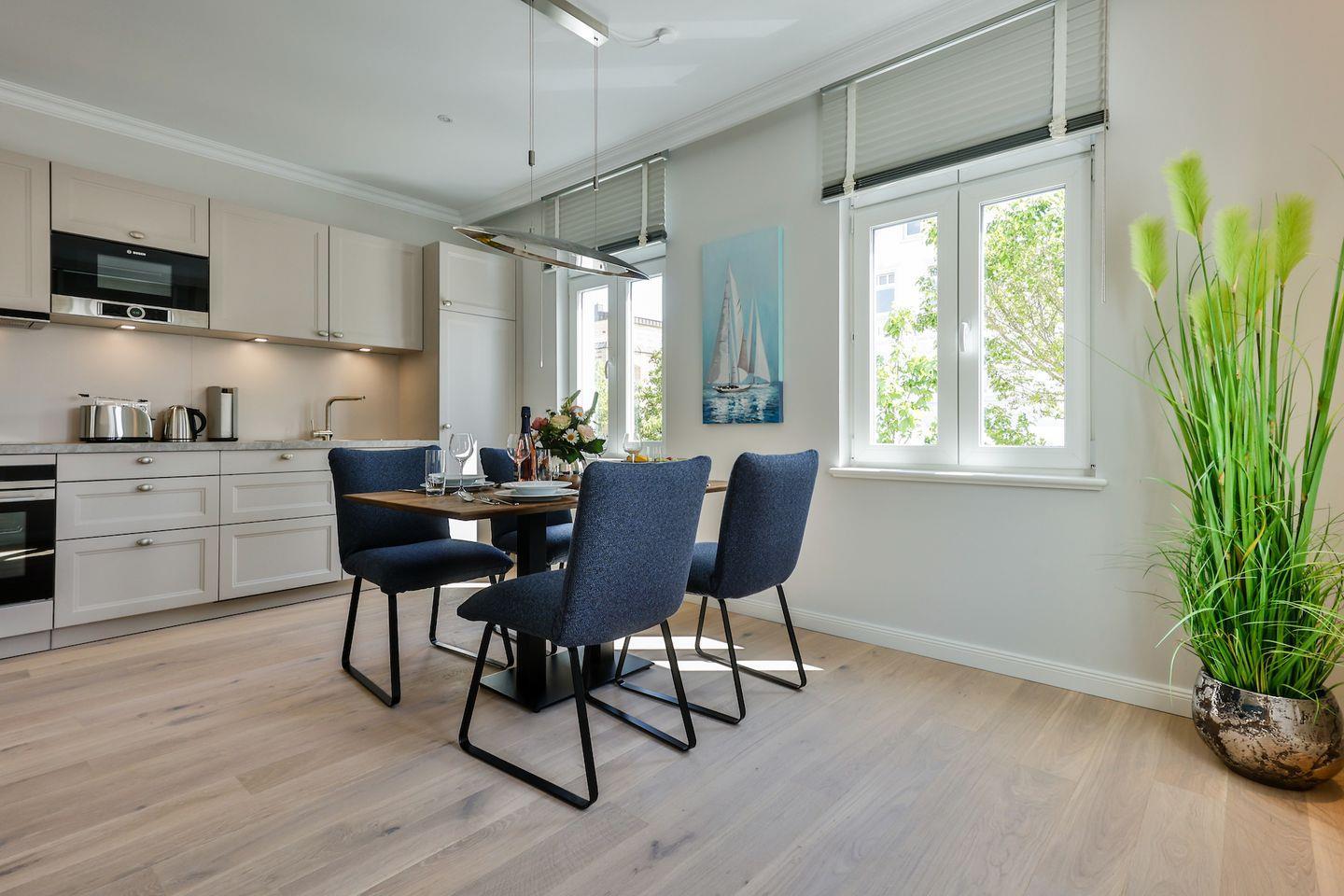 Die offene Küche ist voll ausgestattet und bietet alles, was Sie in einer Küche erwarten. Hochwertige Elektrogeräte und eine umfangreiche Ausstattung machen das Kochen und Zubereiten zum Genuss Im angrenzenden Essbereich finden Sie einen gemütlichen Platz für gemeinsame Mahlzeiten und gesellige Runden.