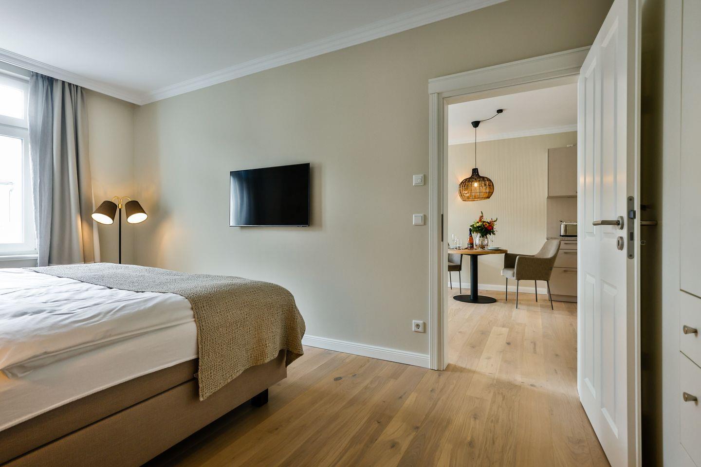 Das großzügige Schlafzimmer ist geschmackvoll eingerichtet und mit einem komfortablen Boxspringbett (180x200 cm) und TV ausgestattet. Ein ruhiges Ambiente sorgt für erholsame Nächte. Im hellen Badezimmer wählen Sie zwischen einer ebenerdigen Dusche für einen guten Start in den Tag und einer Badewanne zum Entspannen und Wohlfühlen. WC und Fön runden die Ausstattung ab.