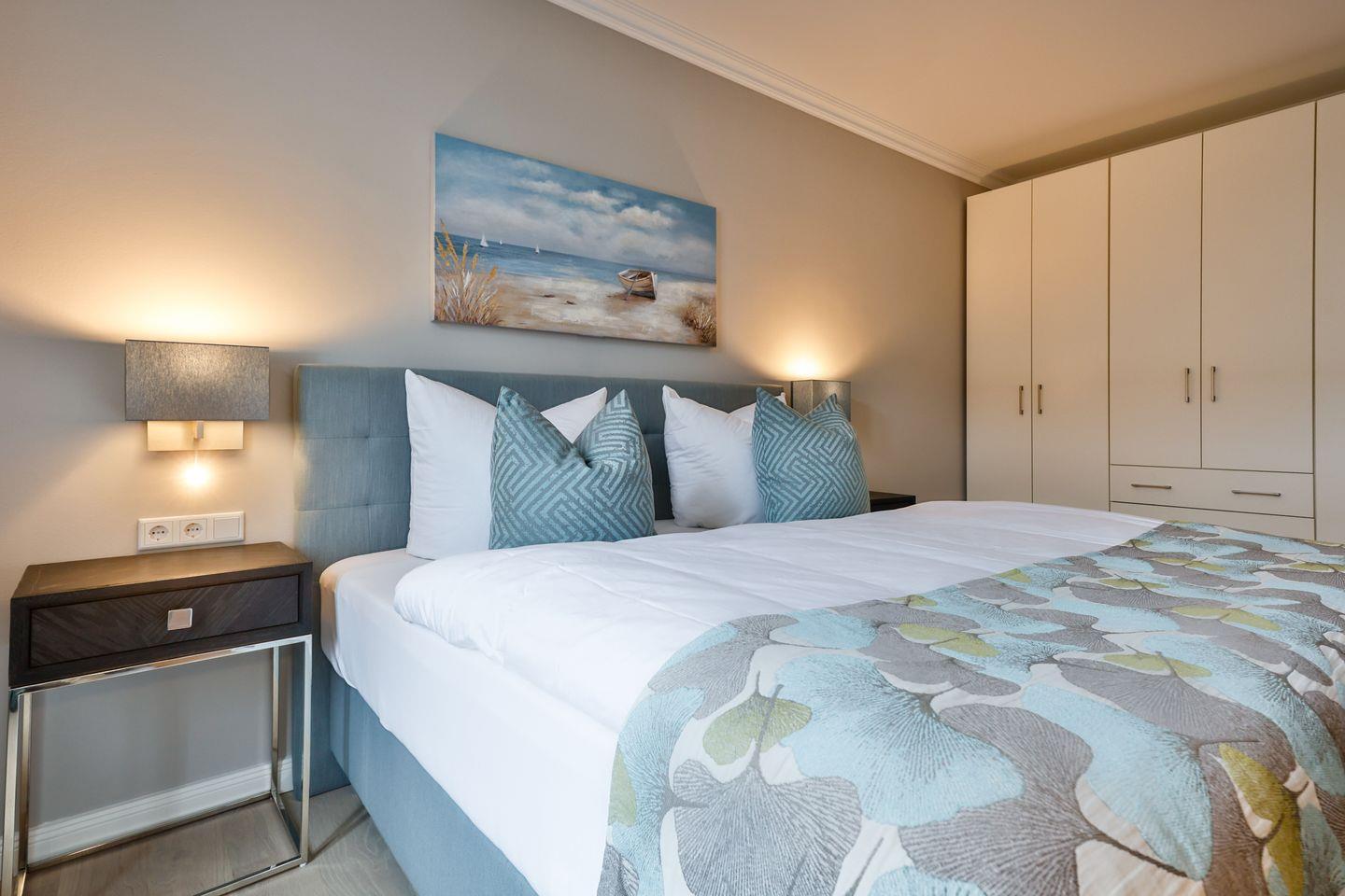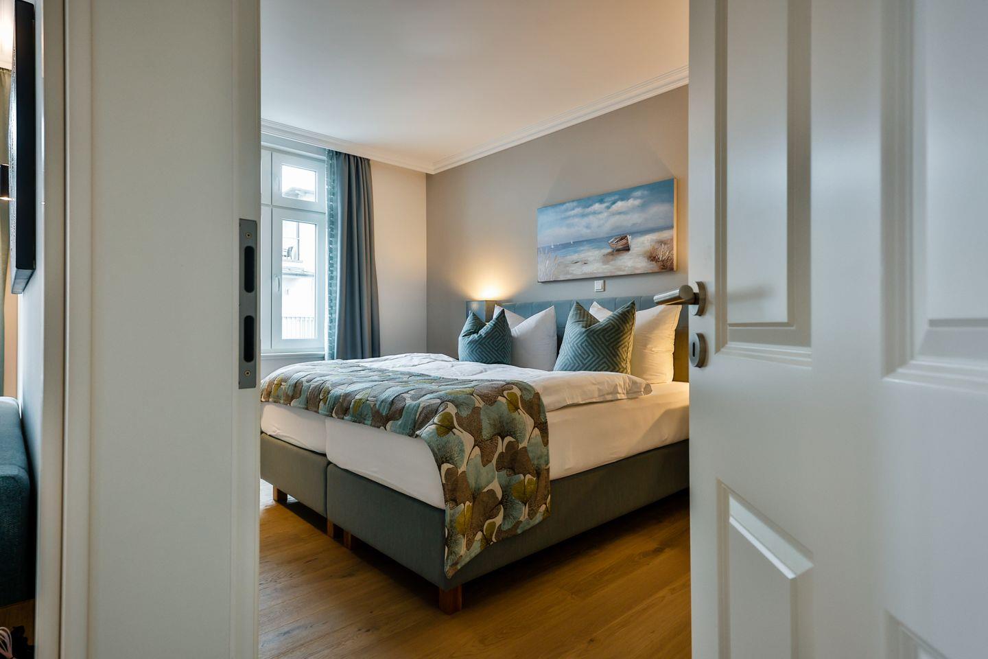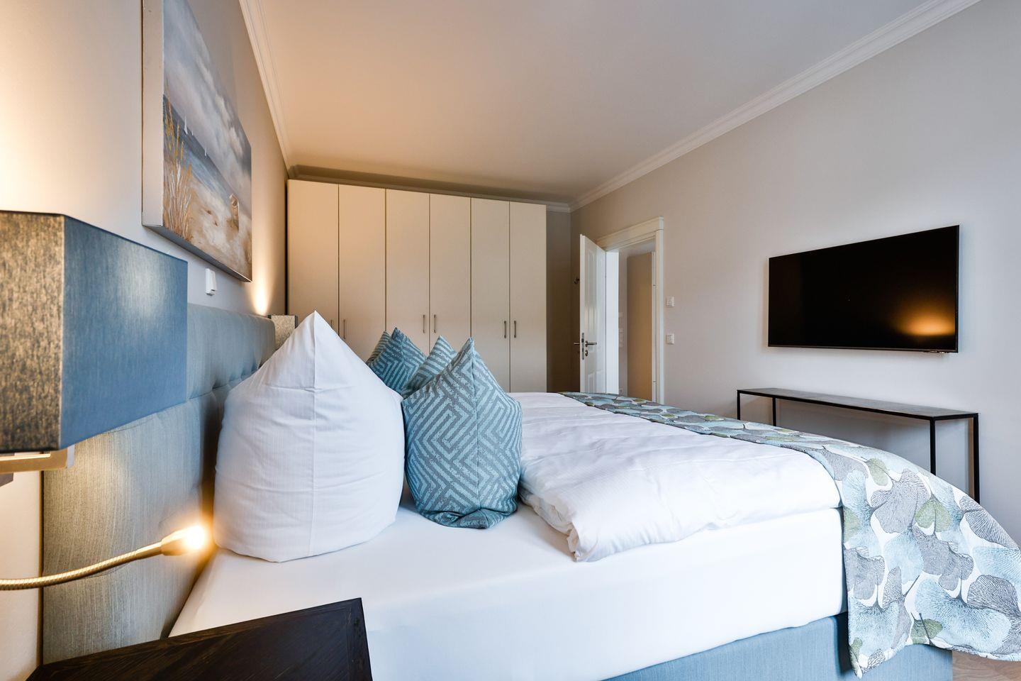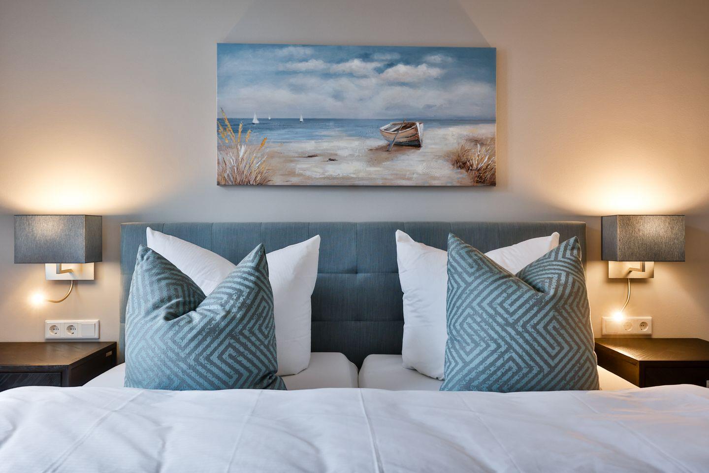 Das Schlafzimmer ist geschmackvoll eingerichtet und bietet höchsten Schlafkomfort mit einem hochwertigen Boxspringbett (180x200 cm) und TV. Das Badezimmer hat eine ebenerdige Dusche, WC und Fön sowie zusätzlich eine Badewanne zum Entspannen und Wohlfühlen.