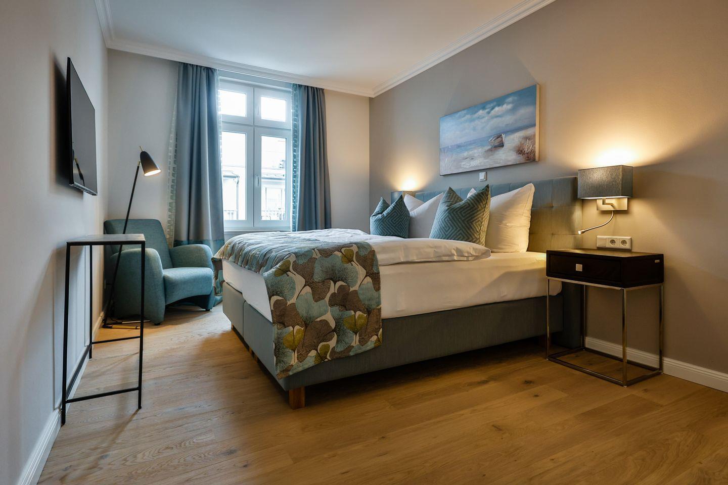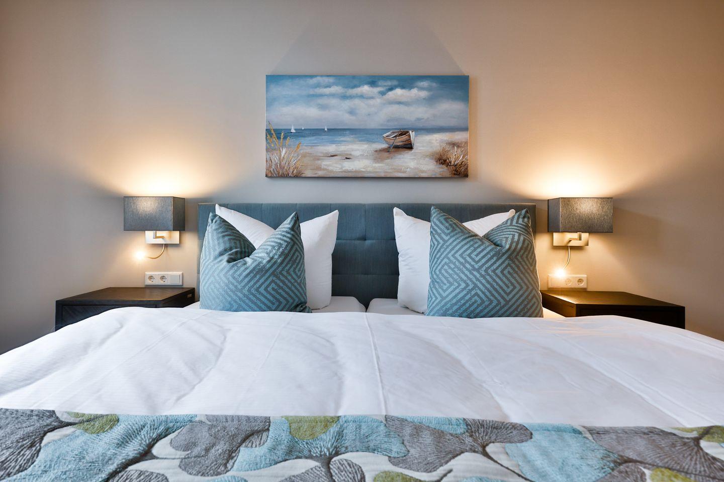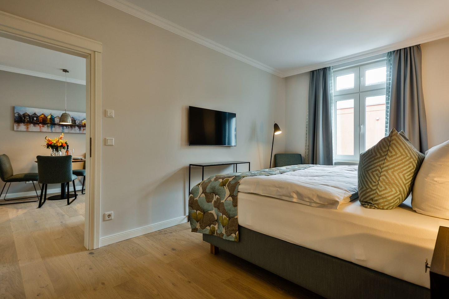Das Schlafzimmer ist geschmackvoll eingerichtet und bietet höchsten Schlafkomfort mit einem hochwertigen Boxspringbett (180x200 cm) und TV. Das Badezimmer hat eine ebenerdige Dusche, WC und Fön sowie zusätzlich eine Badewanne zum Entspannen und Wohlfühlen.