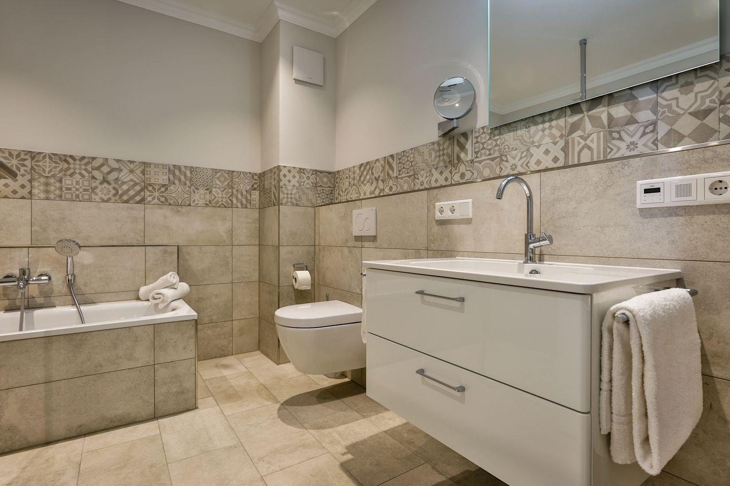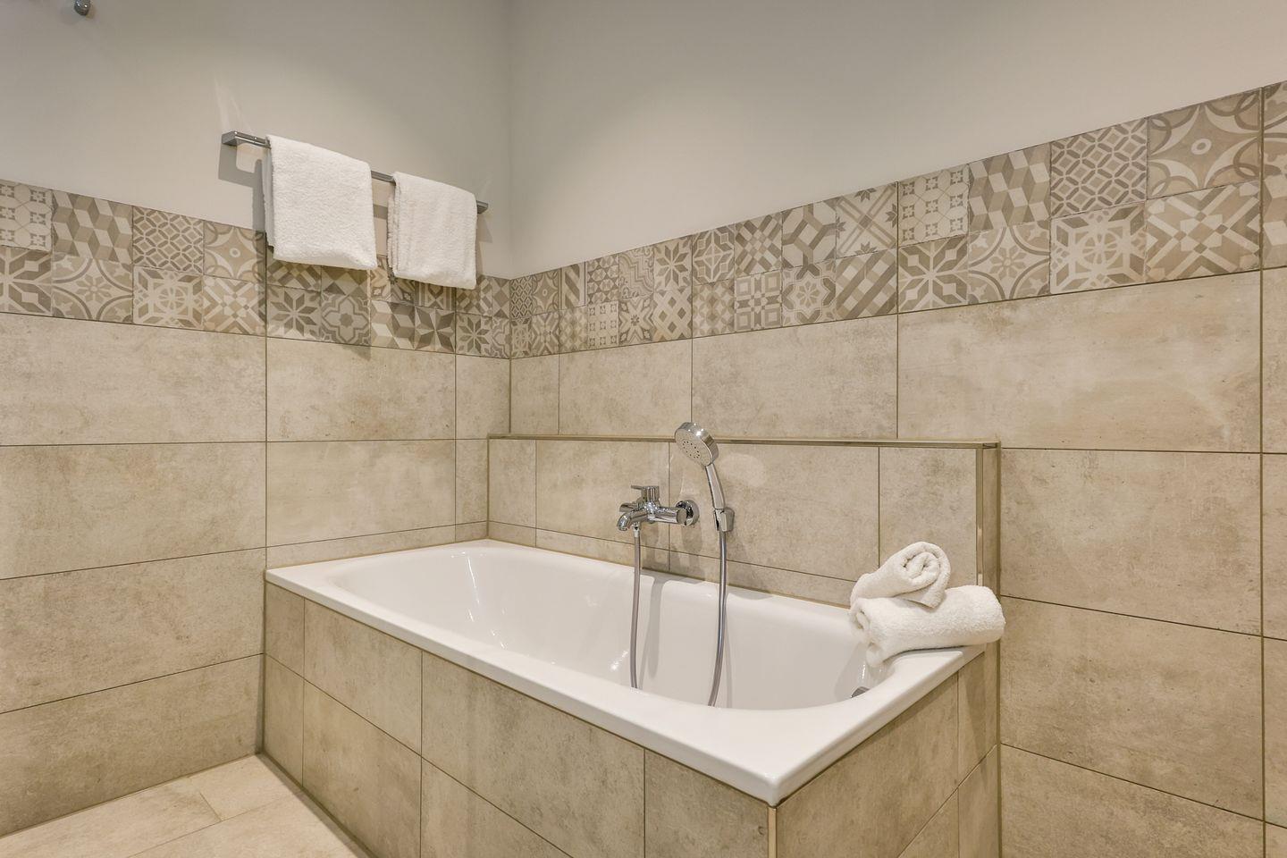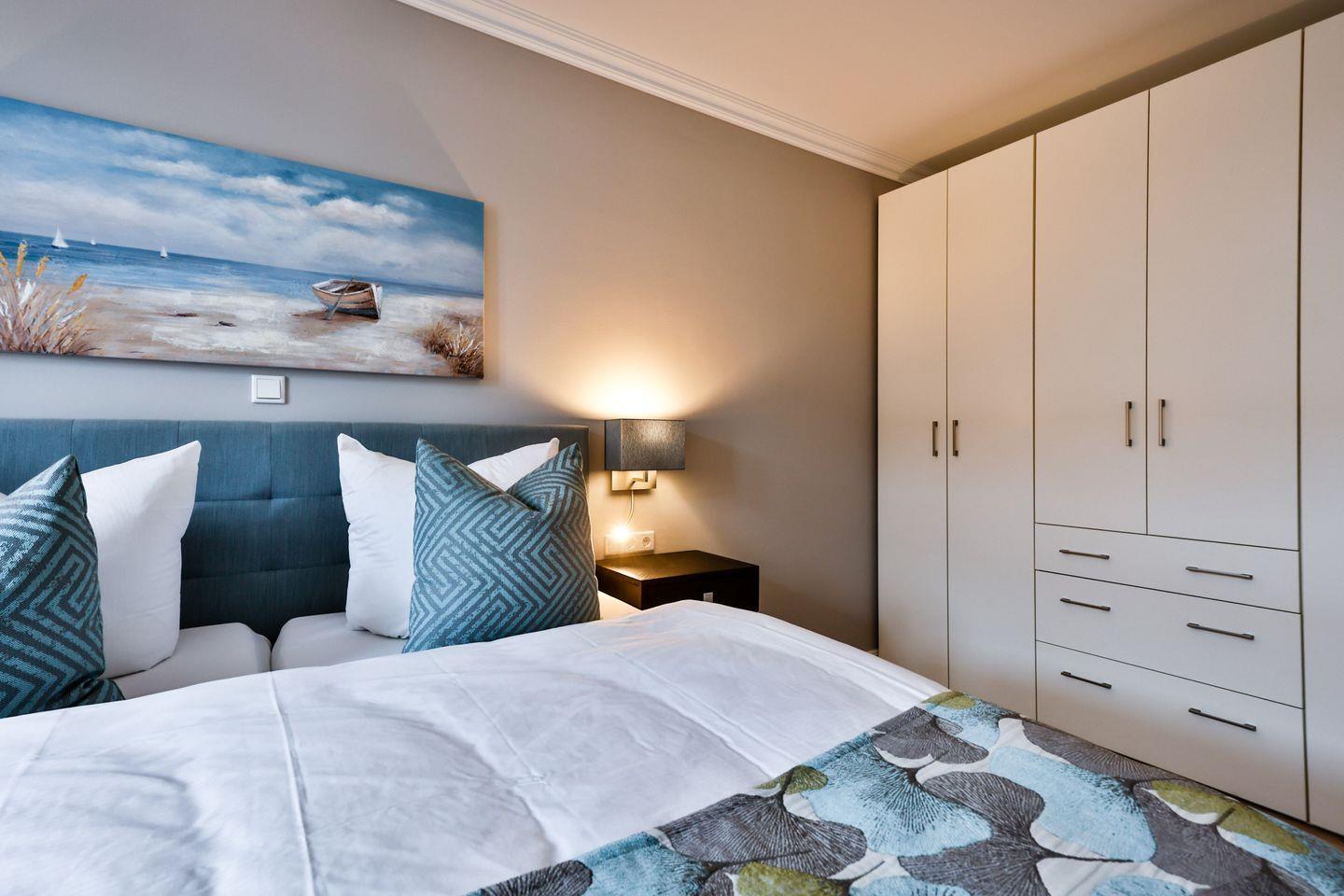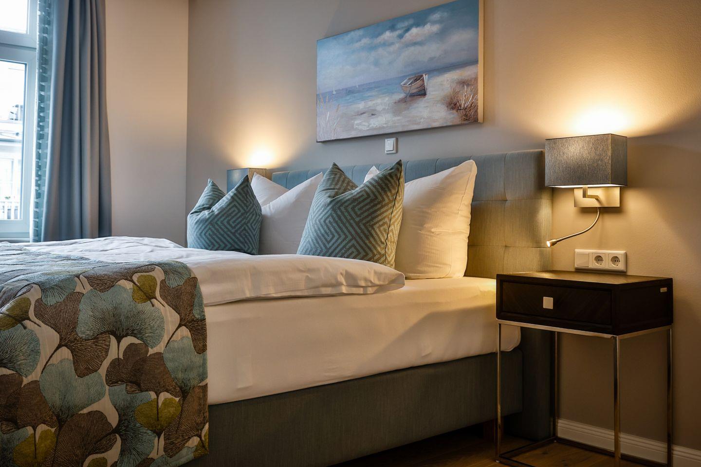 Das Schlafzimmer ist geschmackvoll eingerichtet und bietet höchsten Schlafkomfort mit einem hochwertigen Boxspringbett (180x200 cm) und TV. Das Badezimmer hat eine ebenerdige Dusche, WC und Fön sowie zusätzlich eine Badewanne zum Entspannen und Wohlfühlen.