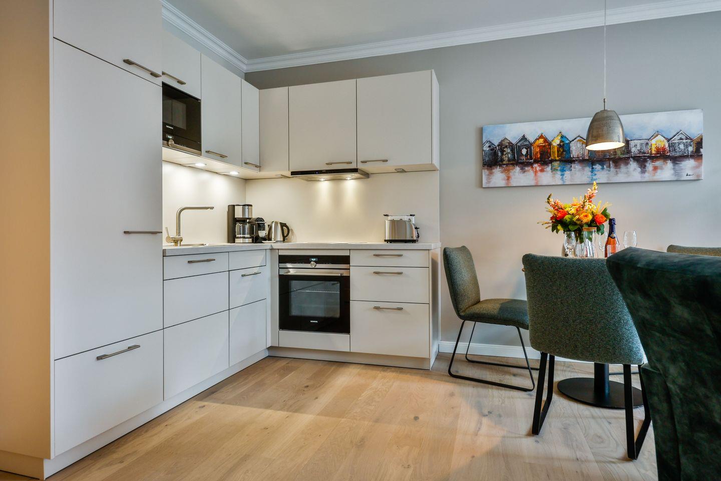 Die offene Küche bietet alles, was Sie in einer Küche erwarten. Hochwertige Elektrogeräte und eine umfangreiche Ausstattung machen das Kochen und die Zubereitung zum Genuss. Im angrenzenden Essbereich finden Sie einen gemütlichen Platz für gemeinsame Mahlzeiten und gesellige Runden.