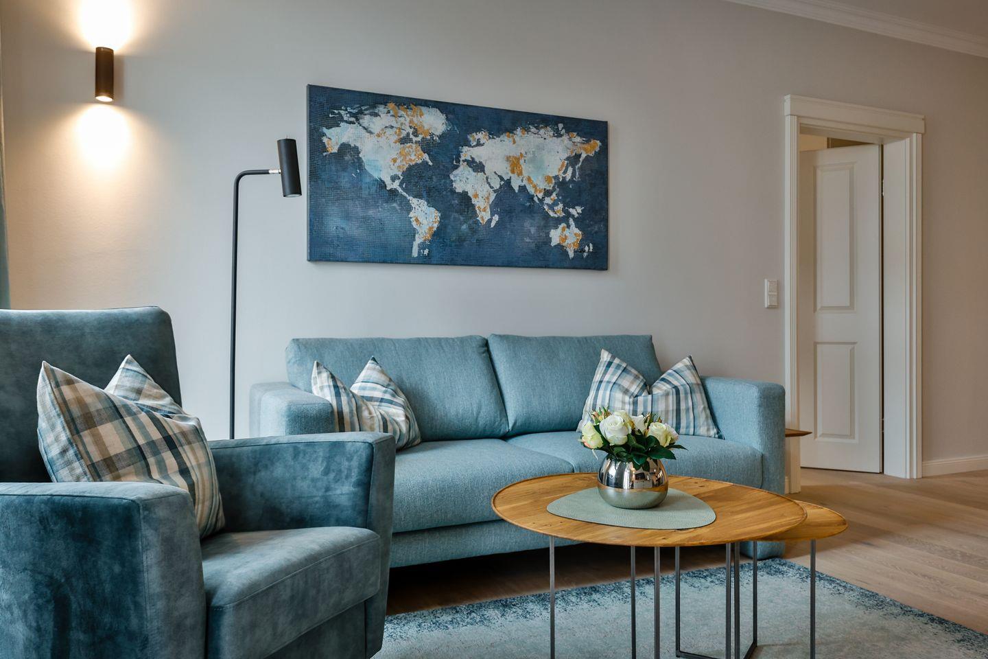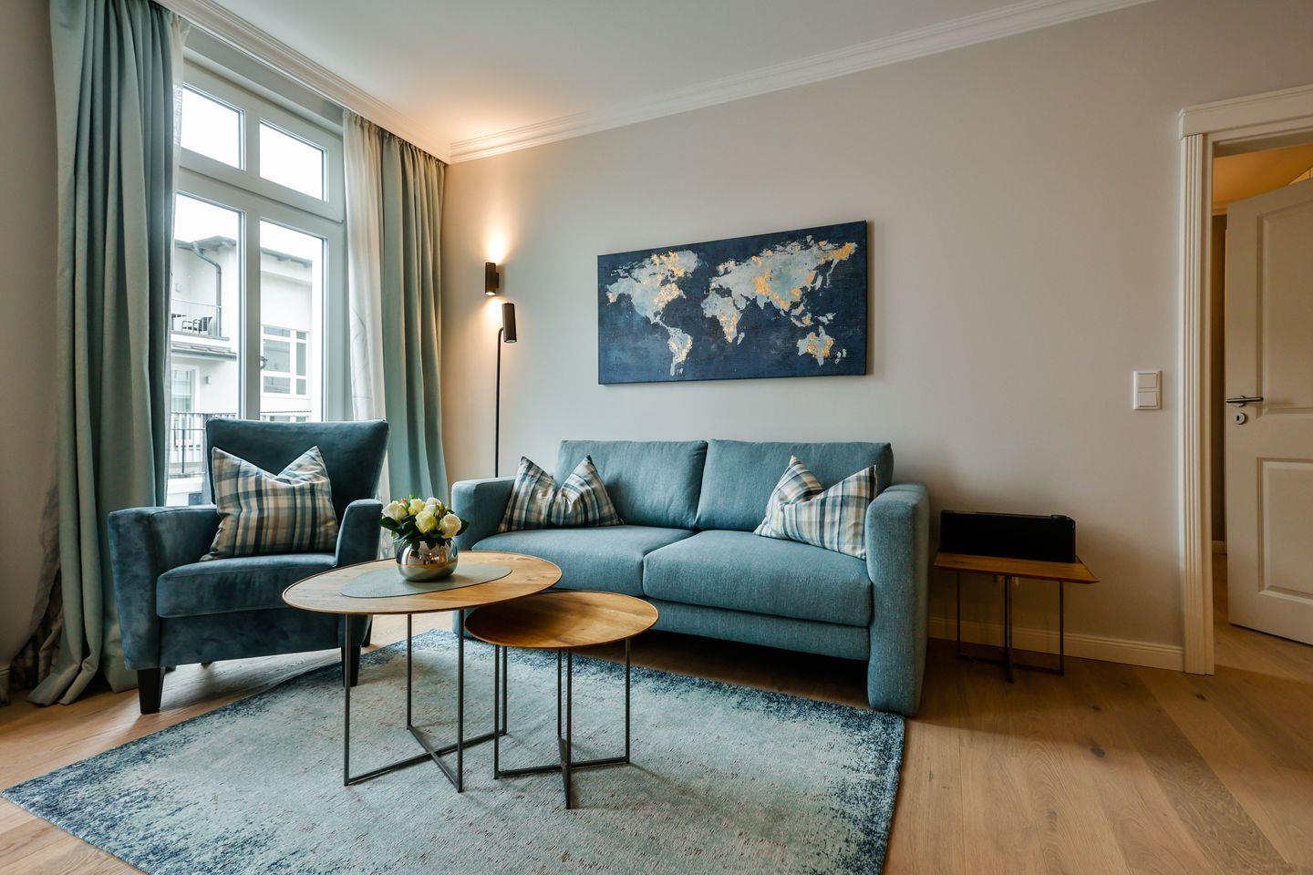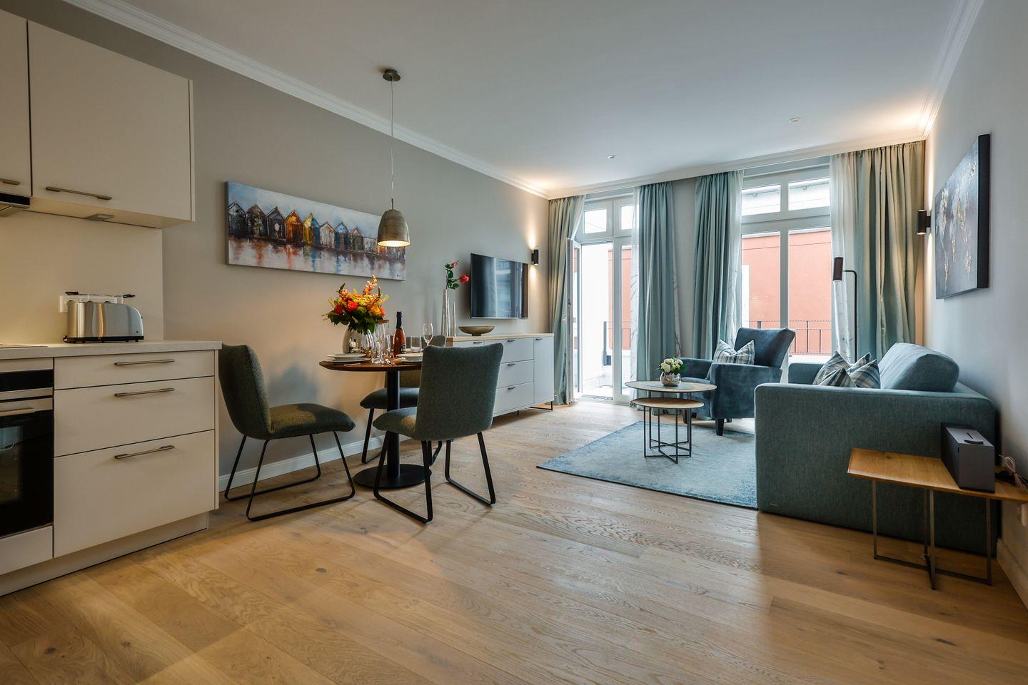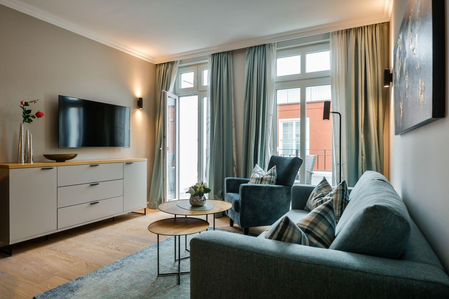 Der lichtdurchflutete Wohnbereich lädt mit seiner stilvollen Einrichtung zum Verweilen ein und hat direkten Zugang zum Südbalkon. Hier scheint die Sonne zu fast jeder Tageszeit. Lassen Sie dort den Abend gemütlich ausklingen. Die hochwertige Loewe klang s3-Anlage sorgt für ein exklusives Klangerlebnis und verfügt über Digital-Radio, Bluetooth, CD-Player und USB-Anschlüsse. Eine moderne Einrichtung und das großzügige Raumangebot machen diesen Bereich zu einem Ort der Entspannung und Erholung.