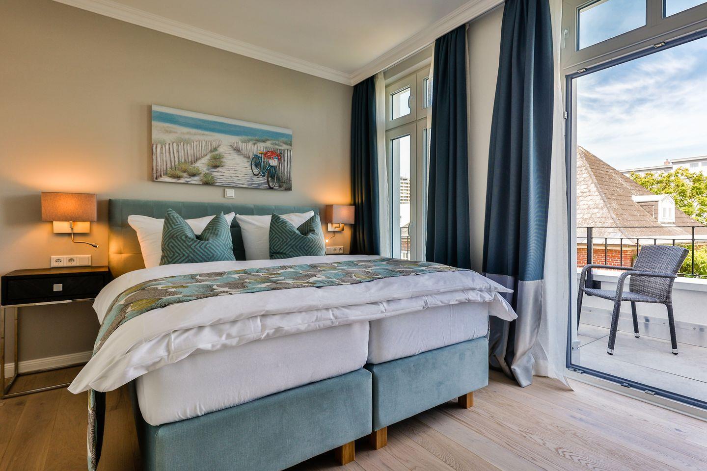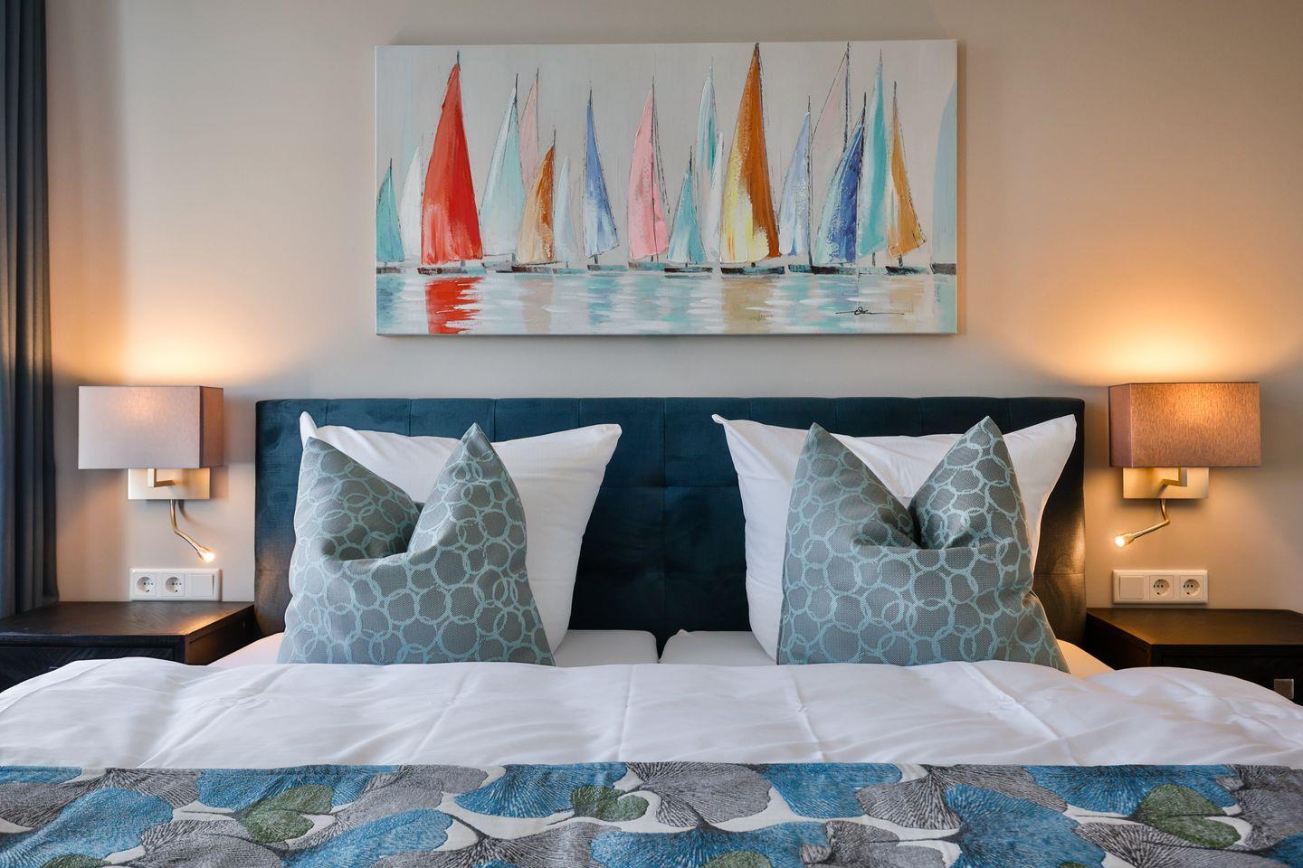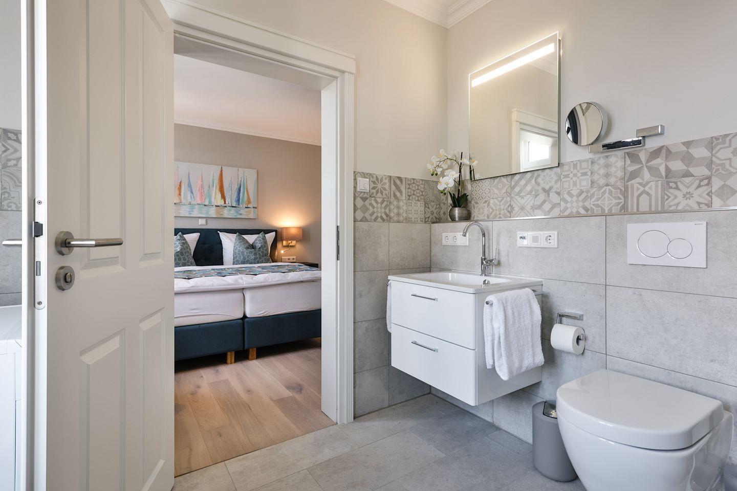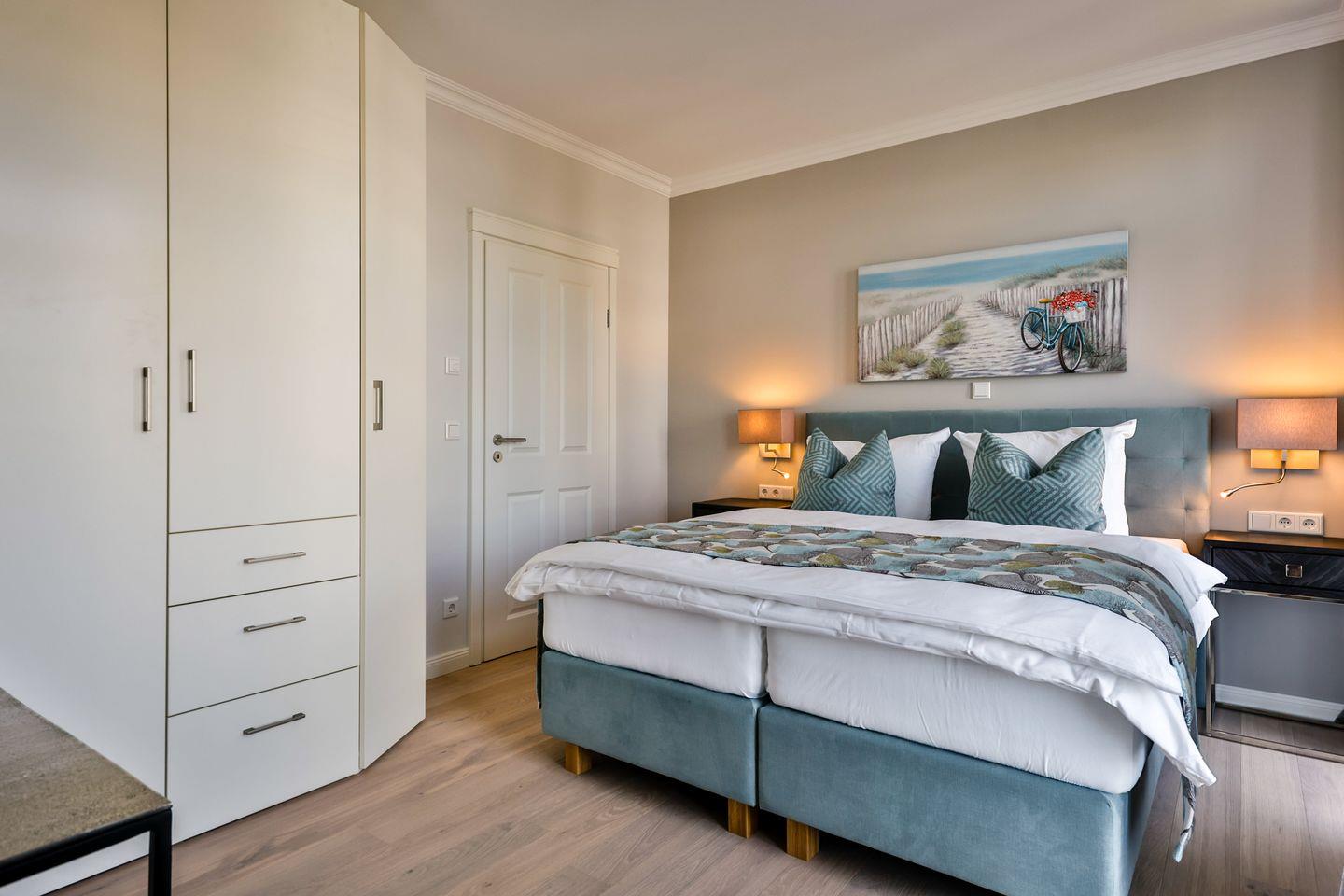 Beide Schlafzimmer sind sehr geschmackvoll eingerichtet und bieten höchsten Schlafkomfort. Das Hauptschlafzimmer ist mit einem Boxspringbett (180x200 cm) und TV ausgestattet. Das zweite Schlafzimmer ist ebenfalls mit einem Boxspringbett (160x200 cm) und TV eingerichtet. Beide Zimmer haben ein ruhiges Ambiente für erholsame Nächte. Die Wohnung bietet zwei moderne Badezimmer, die mit ebenerdigen Duschen, WC und Fön ausgestattet sind; ein Badezimmer hat zusätzlich eine Badewanne zum Entspannen und Wohlfühlen. Abgerundet wird der Bereich durch ein zusätzliches Gäste-WC.