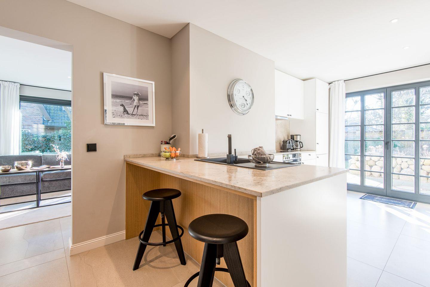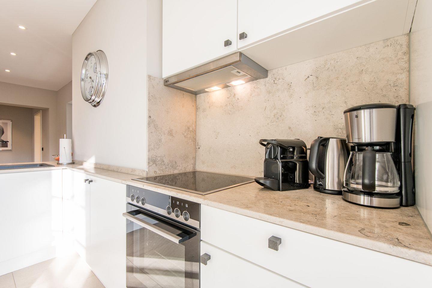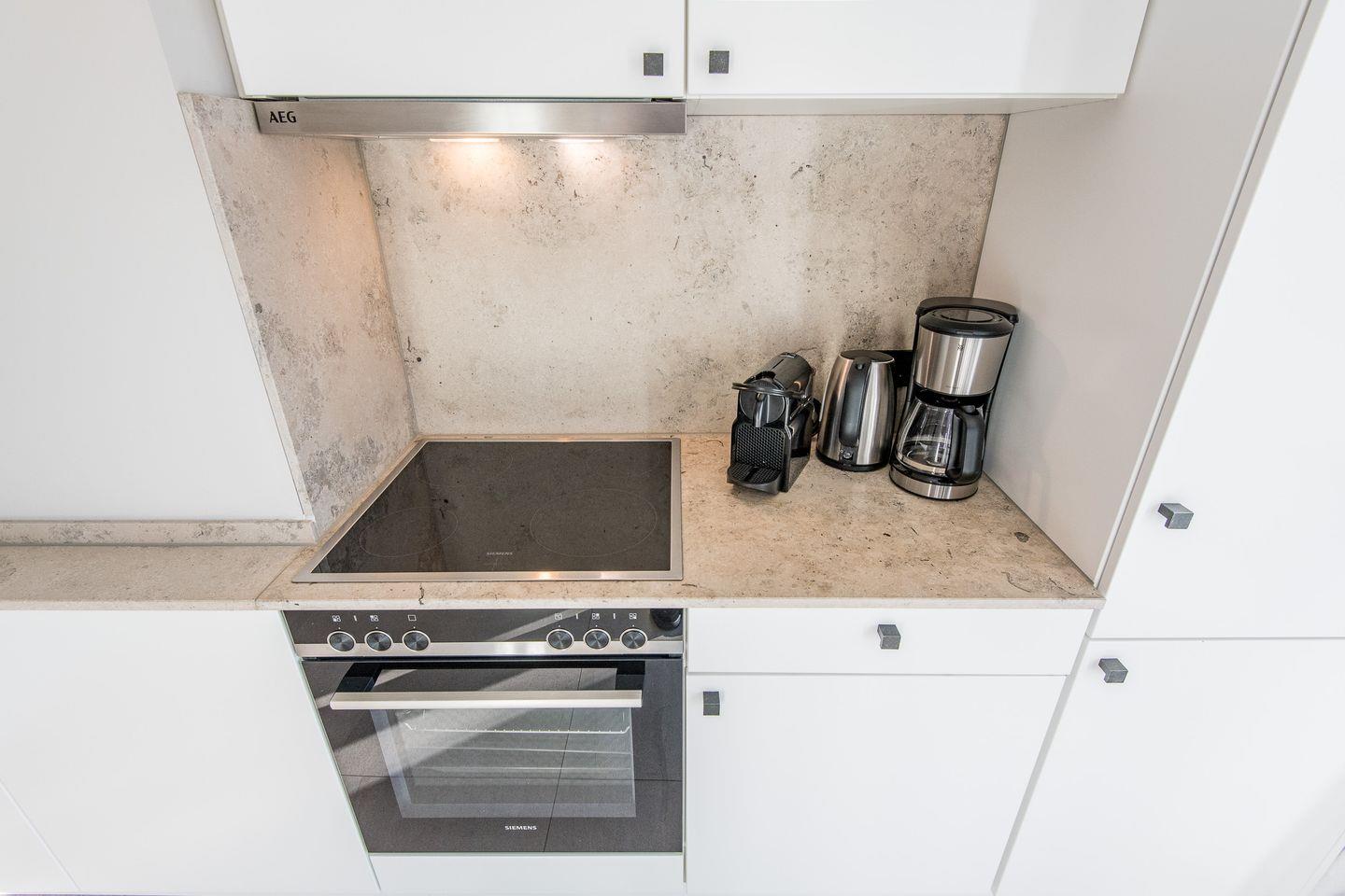 Die moderne, offene Küche ist mit einem Backofen, Geschirrspüler, Filterkaffeemaschine und Nespresso-Maschine ausgestattet und bietet jeden Komfort für Ihre Selbstversorgung. Der angrenzende Essbereich lädt zu gemeinsamen Mahlzeiten ein und ist der ideale Ort für gemütliche Stunden mit Familie oder Freunden.
