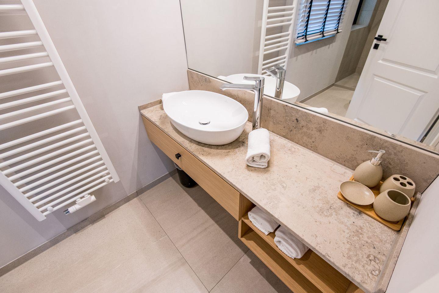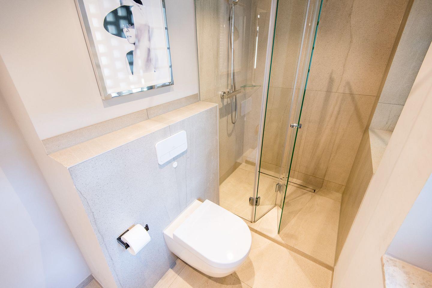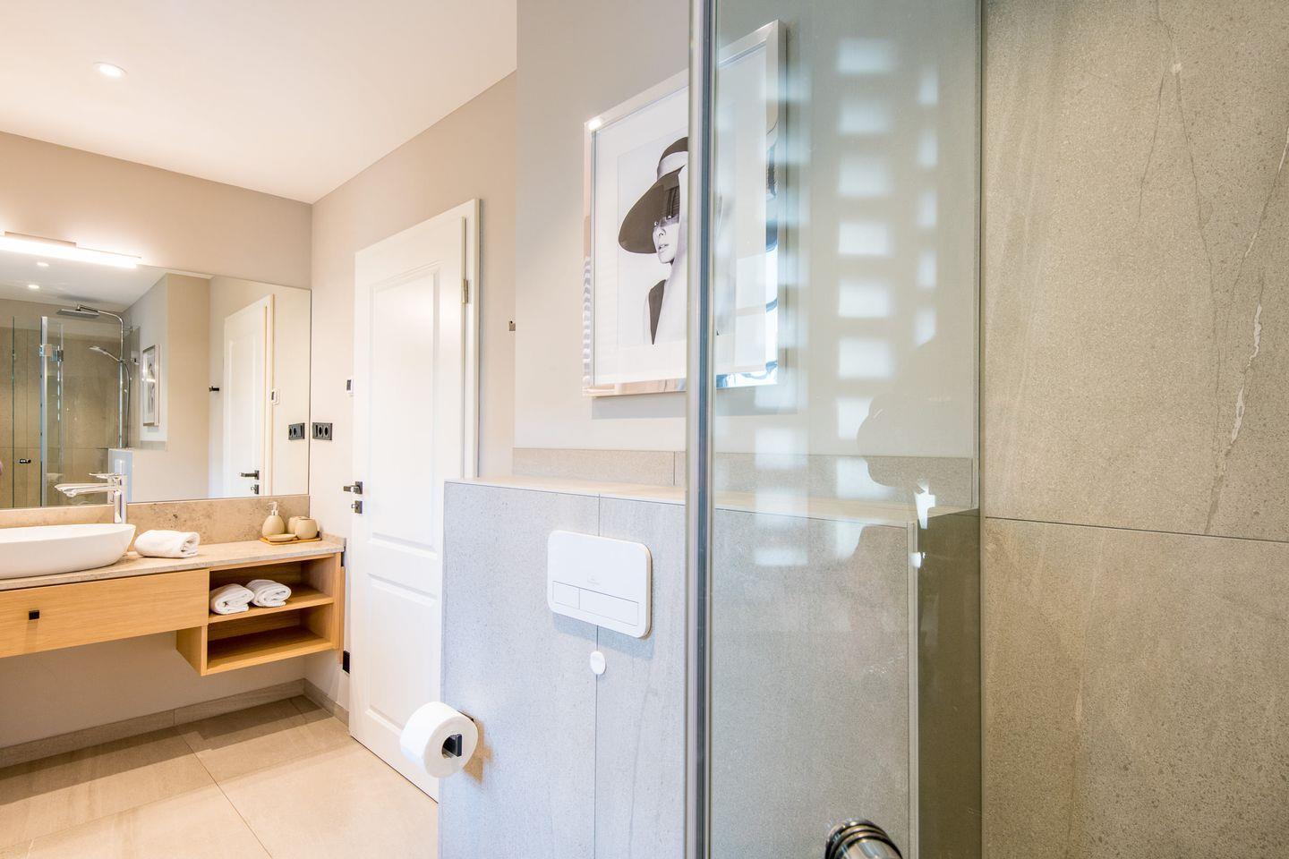 Das Badezimmer ist stilvoll eingerichtet und verfügt über eine ebenerdige Dusche, ein WC, einen Föhn und einen Handtuchwärmer – ideal für einen erfrischenden Start in den Tag.
