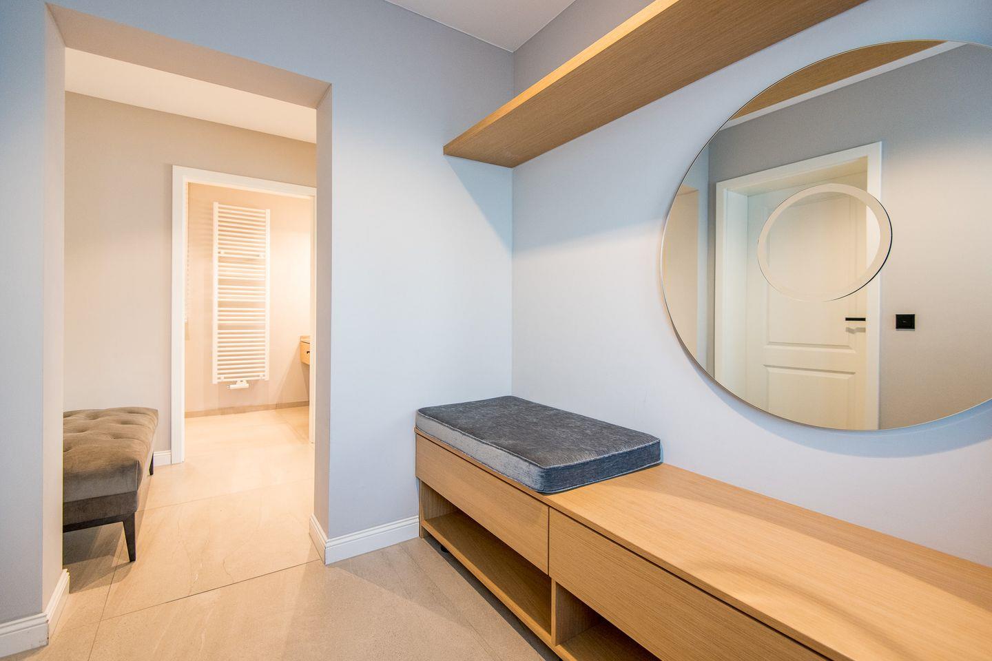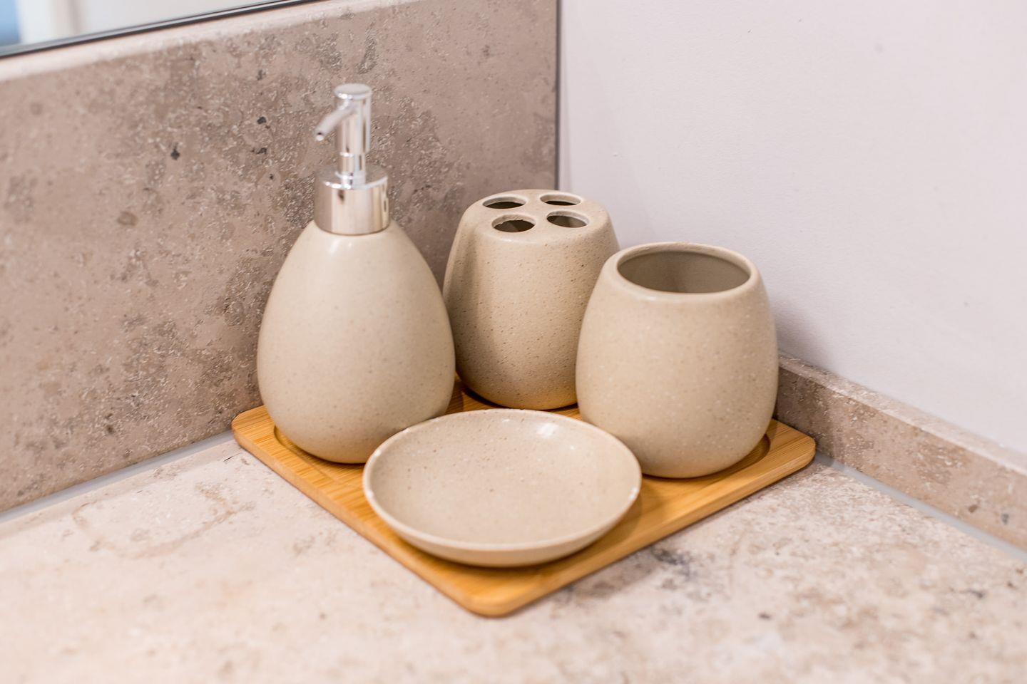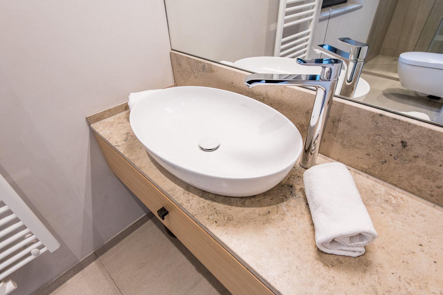 Das Badezimmer ist stilvoll eingerichtet und verfügt über eine ebenerdige Dusche, ein WC, einen Föhn und einen Handtuchwärmer – ideal für einen erfrischenden Start in den Tag.