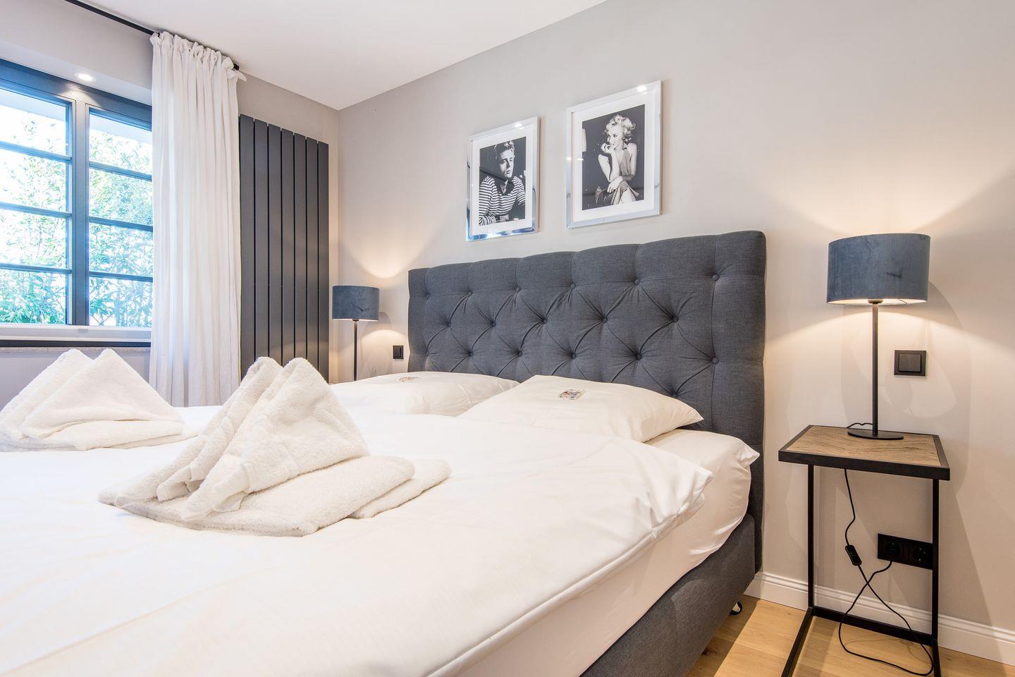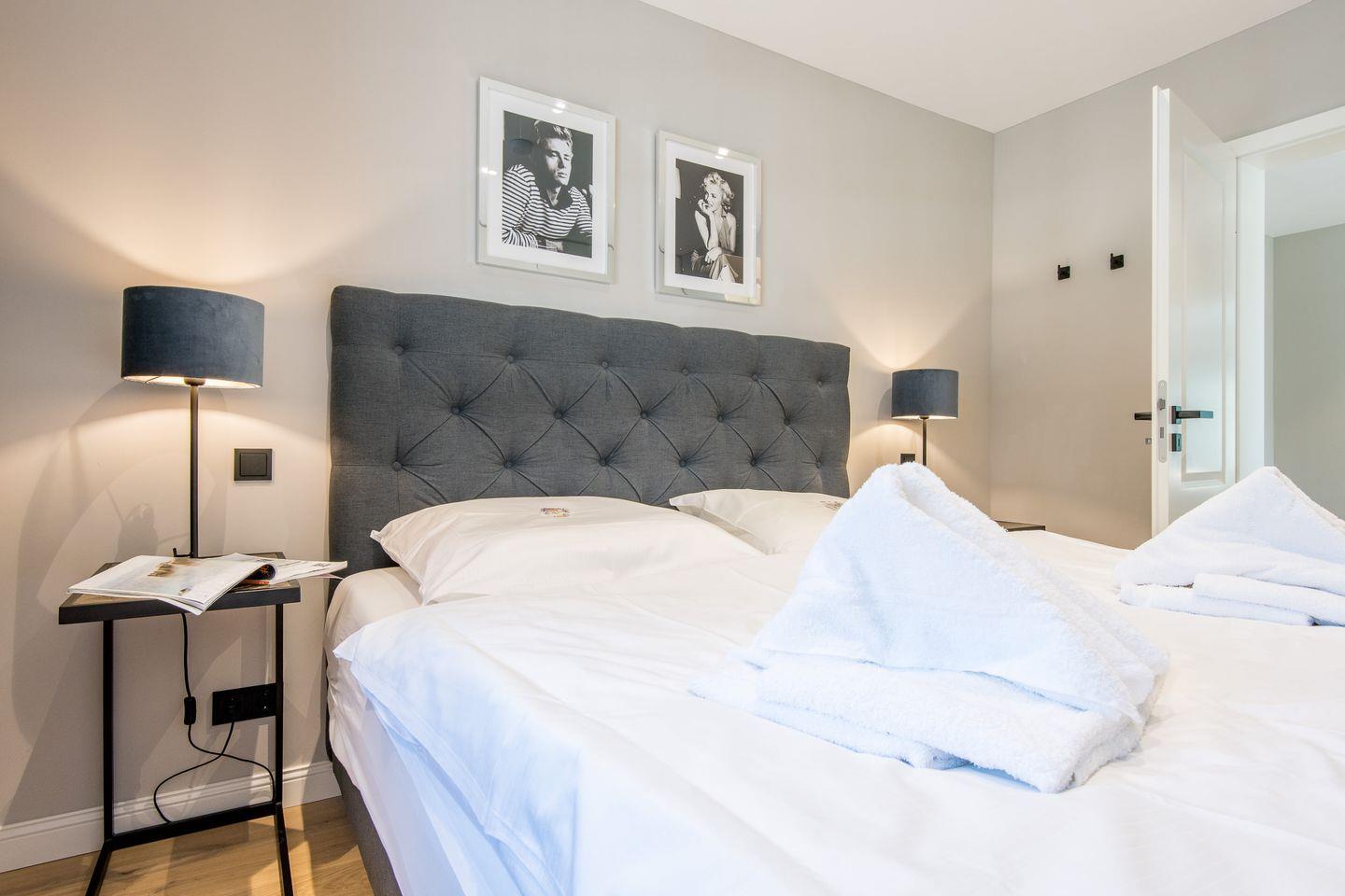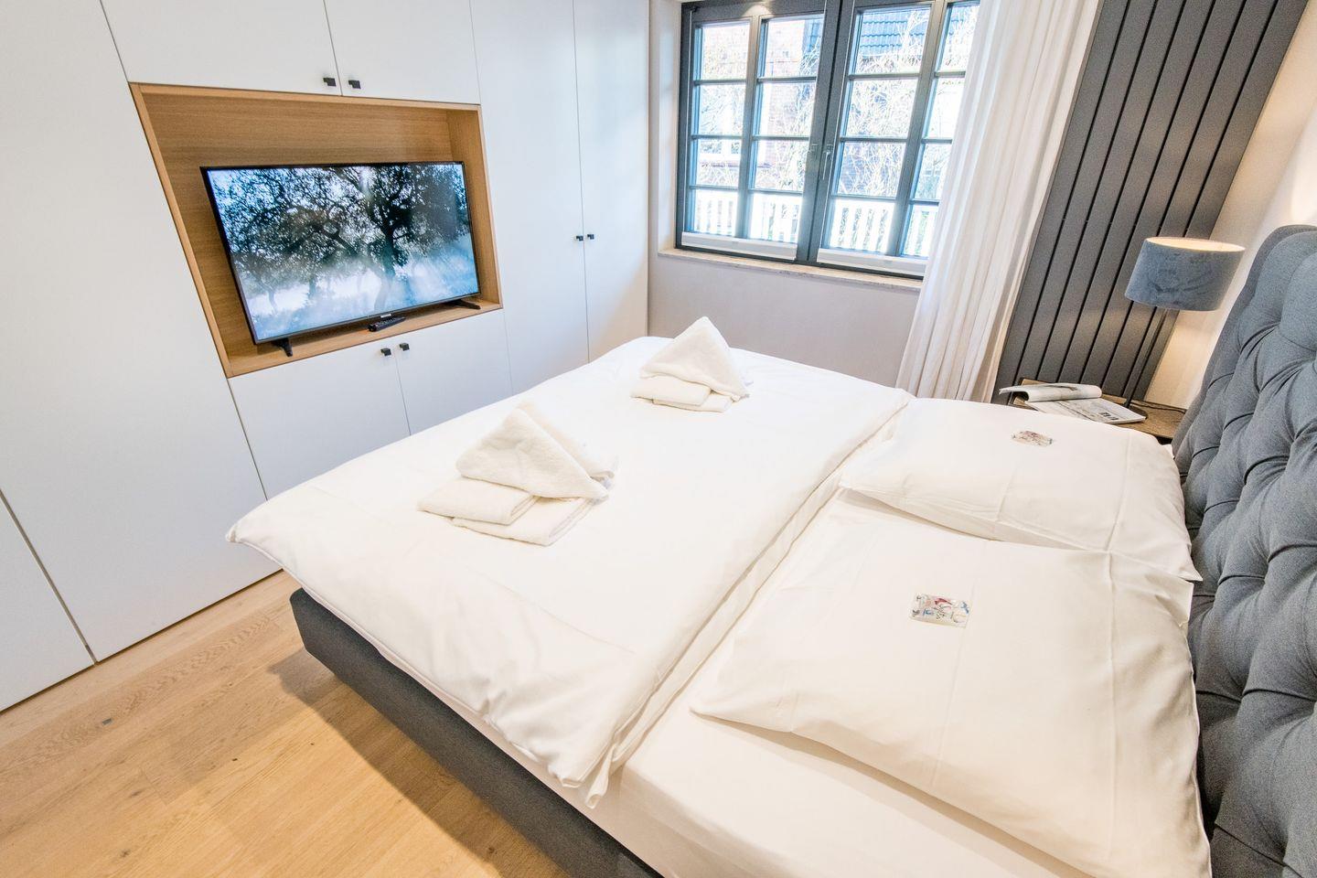 Die zwei großzügigen Schlafzimmer sind jeweils mit Boxspringbetten (180x200 cm) und Flatscreen-TVs ausgestattet, sodass Sie sich in einer angenehmen und komfortablen Atmosphäre ausruhen können. Beide Schlafzimmer bieten Ihnen reichlich Stauraum und sorgen für eine ruhige Rückzugsmöglichkeit.