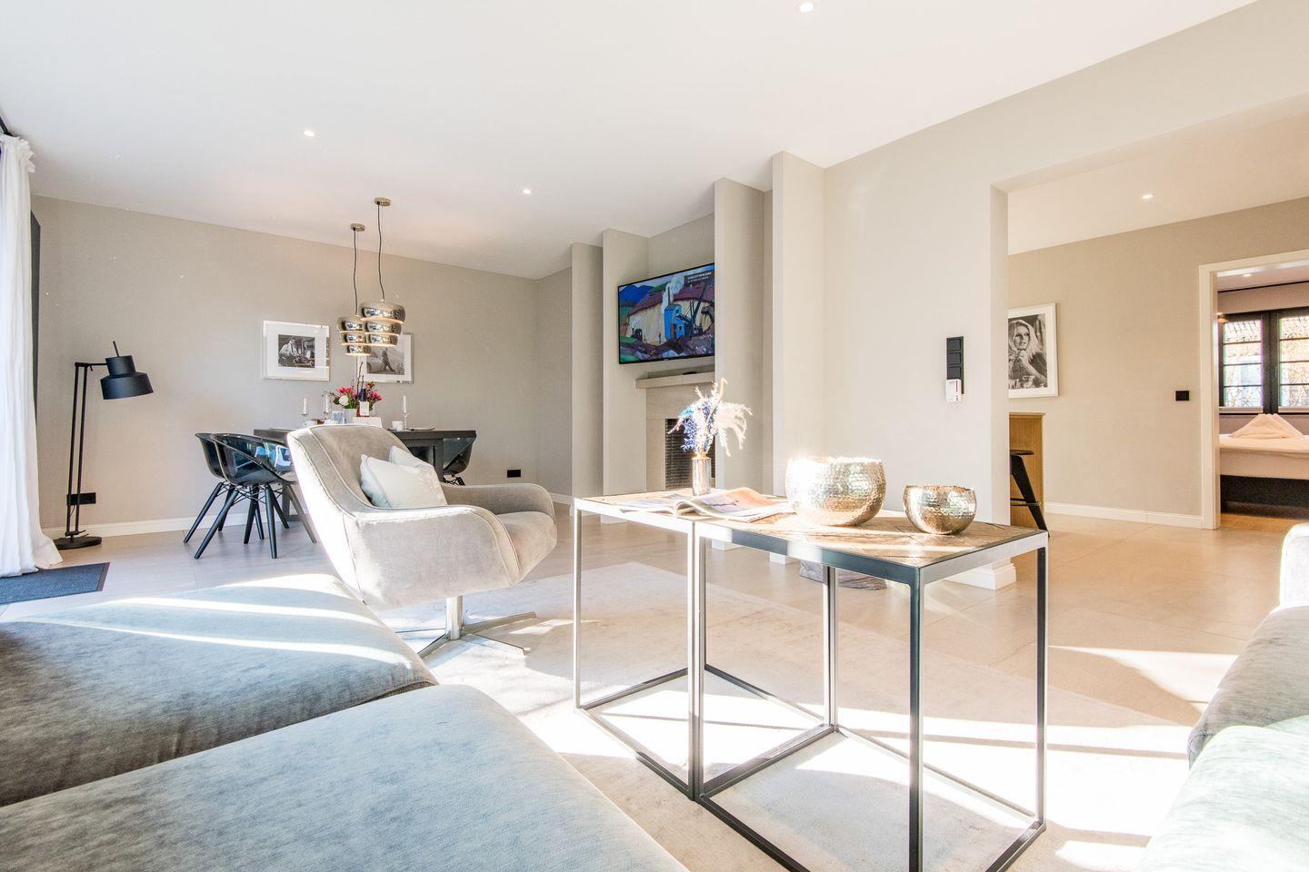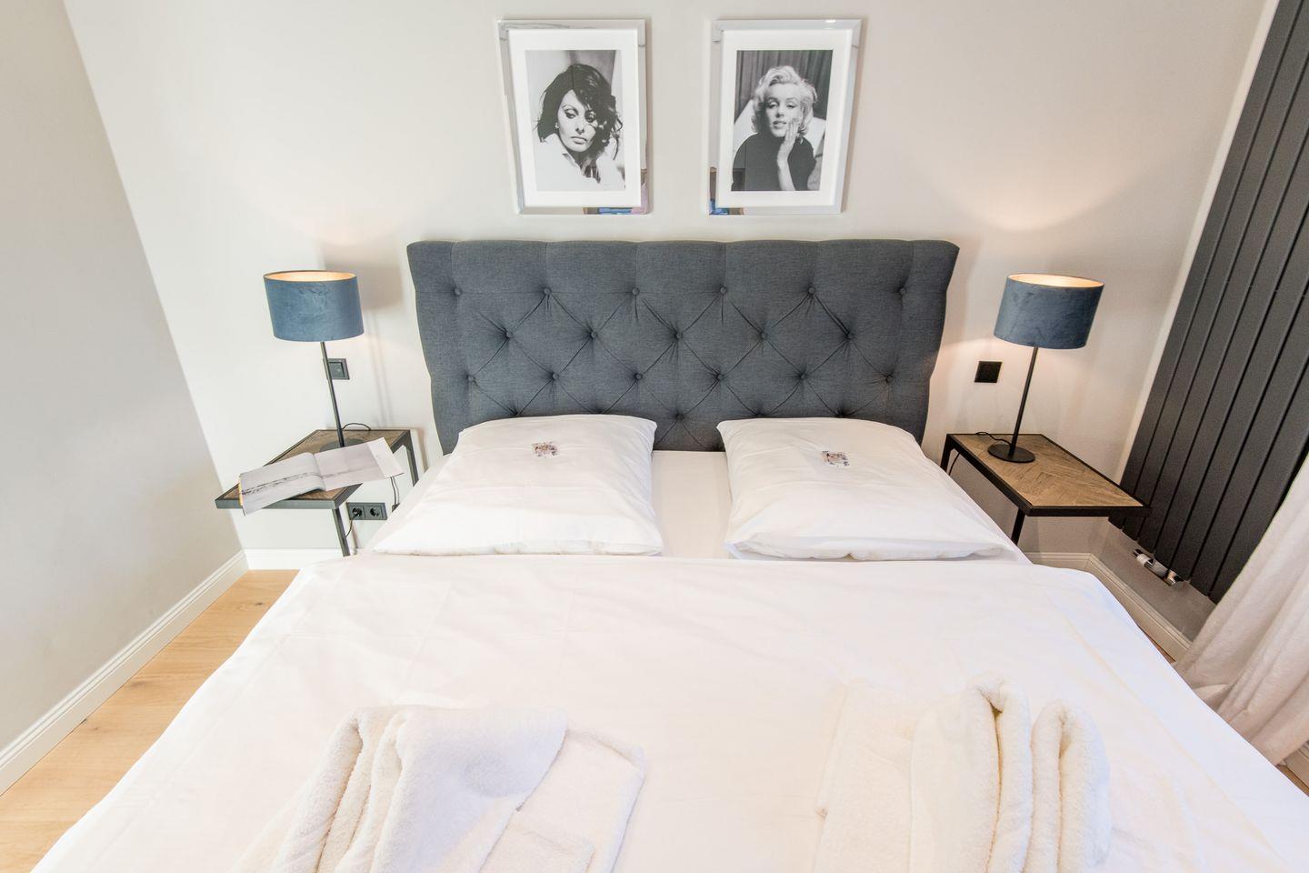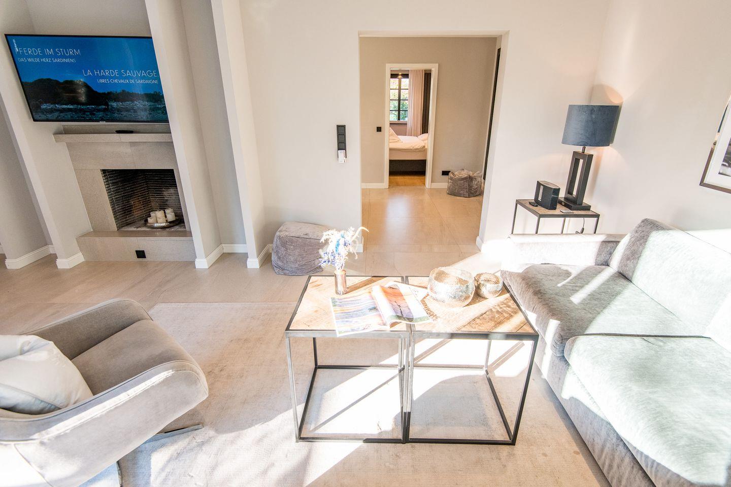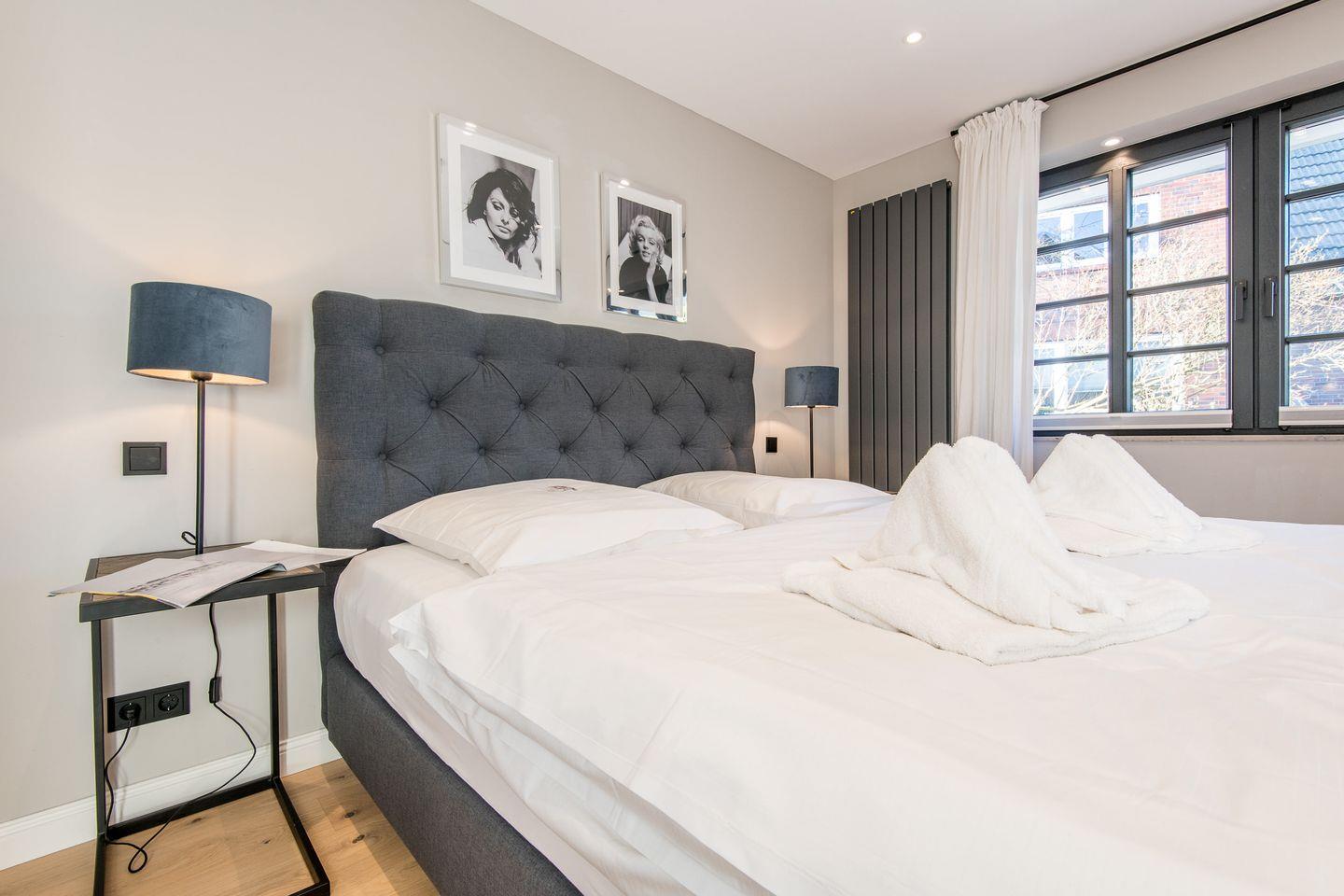 Die zwei großzügigen Schlafzimmer sind jeweils mit Boxspringbetten (180x200 cm) und Flatscreen-TVs ausgestattet, sodass Sie sich in einer angenehmen und komfortablen Atmosphäre ausruhen können. Beide Schlafzimmer bieten Ihnen reichlich Stauraum und sorgen für eine ruhige Rückzugsmöglichkeit.