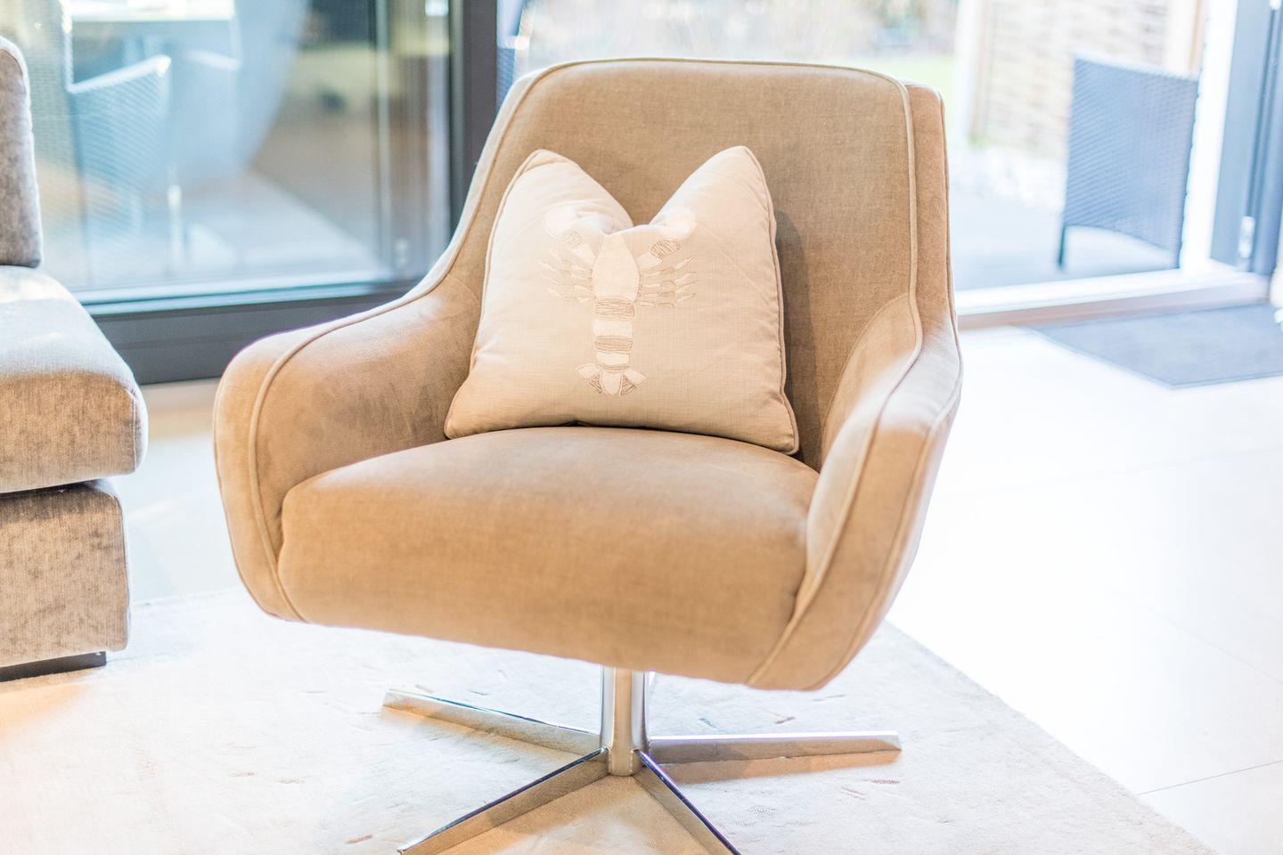 Der helle Wohnbereich lädt mit einem bequemen Sofa und einem Flatscreen-TV zu entspannten Stunden ein. In den Sommermonaten genießen Sie den privaten Außenbereich mit Terrasse und Strandkorb, ideal für erholsame Momente in der frischen Sylter Luft.