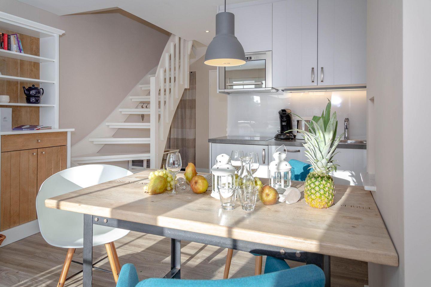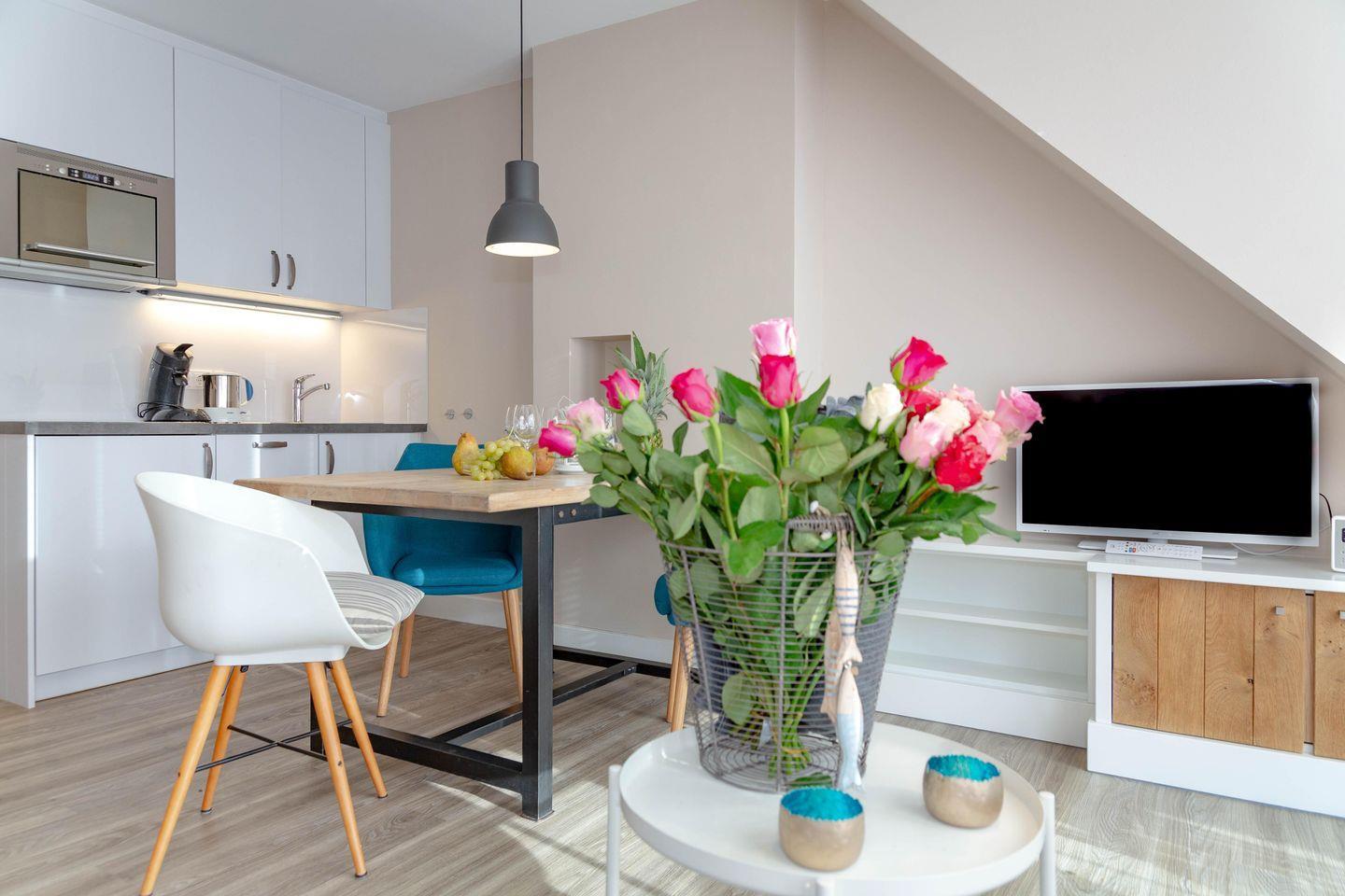Vor kurzem renovierte 3-Zimmer-Maisonette-Ferienwohnung (Nichtraucher) ca. 48 qm, in der 1. Etage zur Südseite für max. 4 Personen mit Südbalkon. Durch die Eingangstür gelangt man in das Wohnzimmer mit Pantry und in das Duschbad/WC. Der Wohnraum besteht aus einer Sitzecke, einem Essplatz, einem Flachbild-TV und einer Pantryküche, Sonoro Audio-System mit Bluetooth, W-Lan. Die Küche ist ausgestattet mit einem Ceranfeld, einem Geschirrspüler und einem Kühlschrank. Kaffeemaschine, Toaster und Wasserkocher gehören zur Grundausstattung. Im Duschbad befinden sich eine Dusche, ein WC und ein Waschtisch. Im OG befinden sich ein Doppelbett auf der offenen Empore und ein separates Schlafzimmer mit zwei Einzelbetten und einem weiteren Fachbild-TV. Einen kostenlosen Stellplatz finden Sie am Haus. Waschmaschine im Keller zur allg. Nutzung. Haustiere sind hier nicht erlaubt. Die hier genannten Preise beziehen sich auf eine 2er Belegung. Jede weitere Person (bis max. 4 Personen) kostet + € 5,- / Tag.