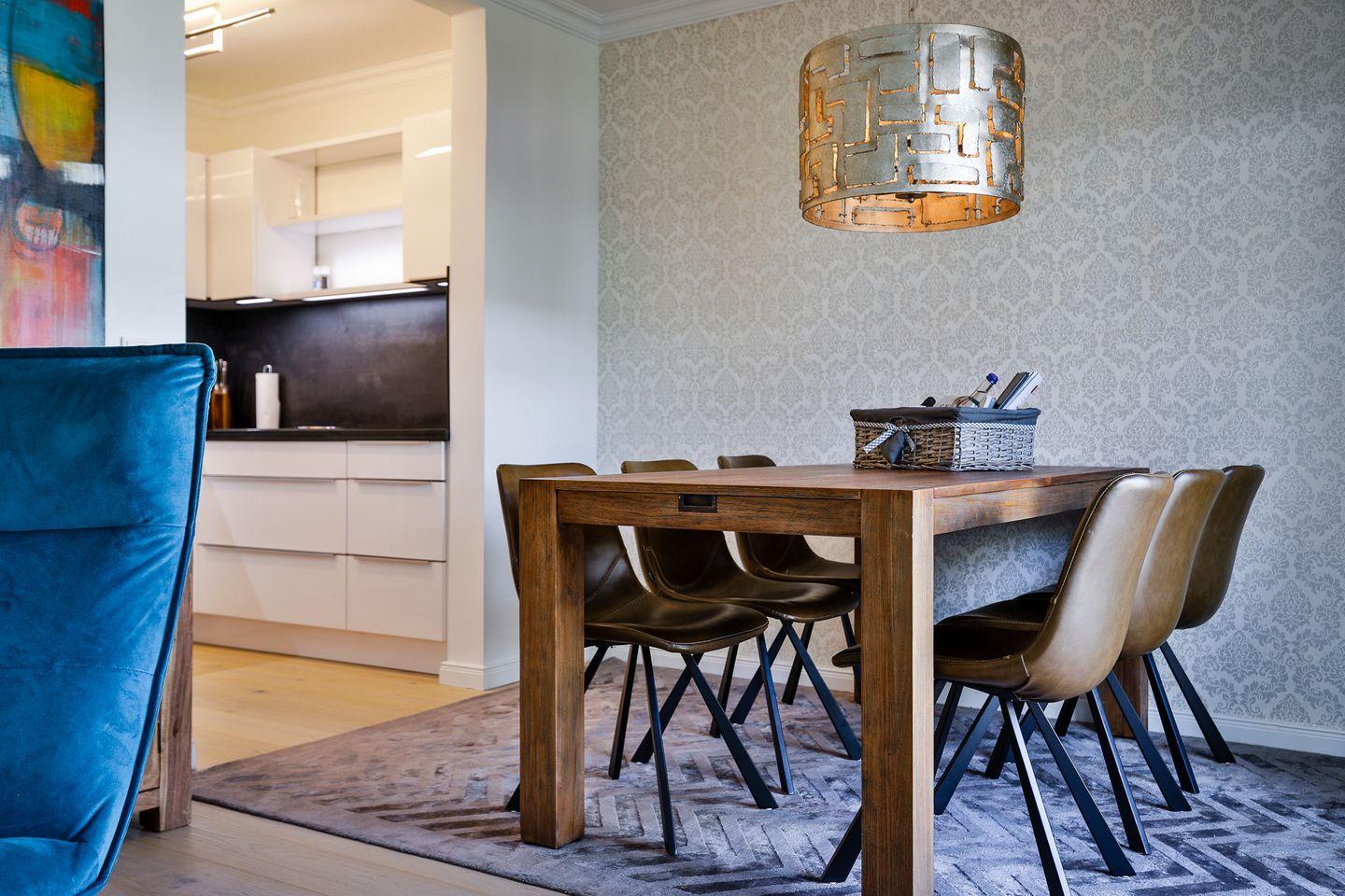 ausziehbarer Couch, offen gestaltetem Essbereich und voll ausgestatteter Küche.