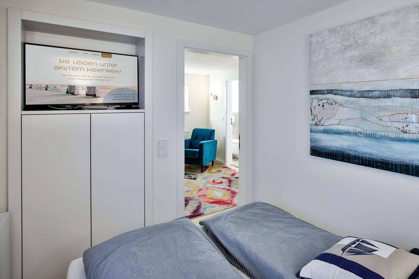 Schlafzimmer besteht aus einem Doppel-Boxspringbett, Einbauschränken sowie