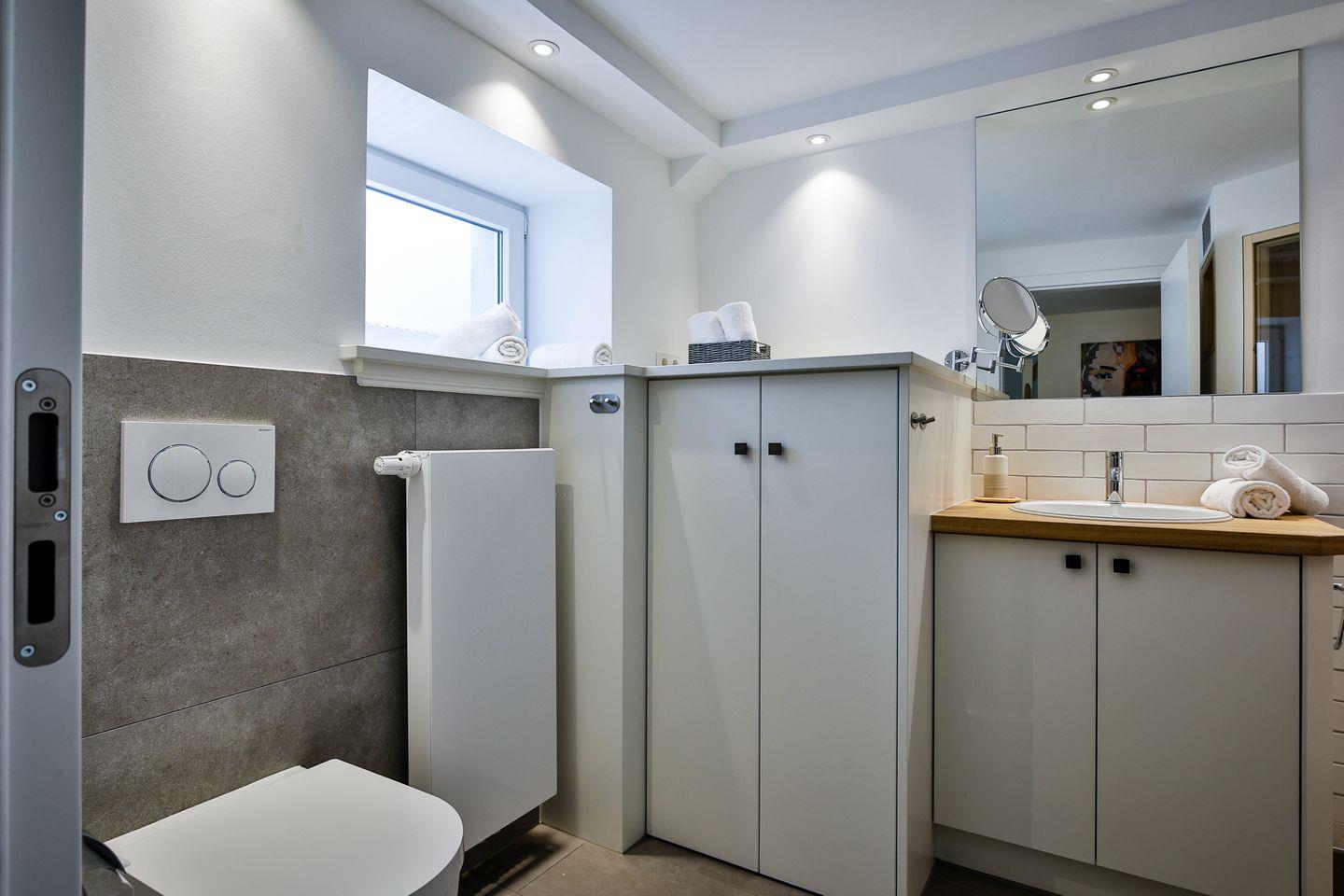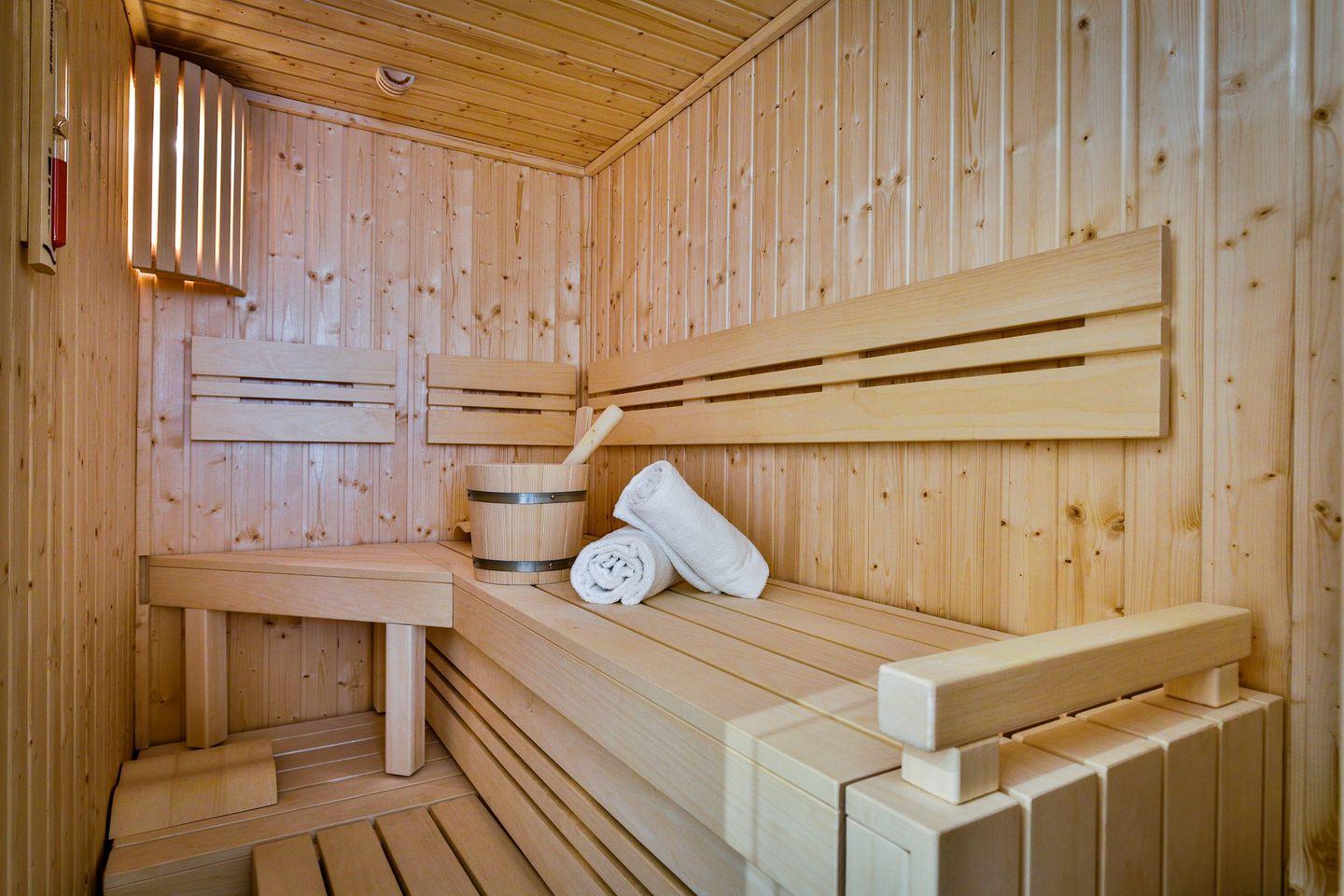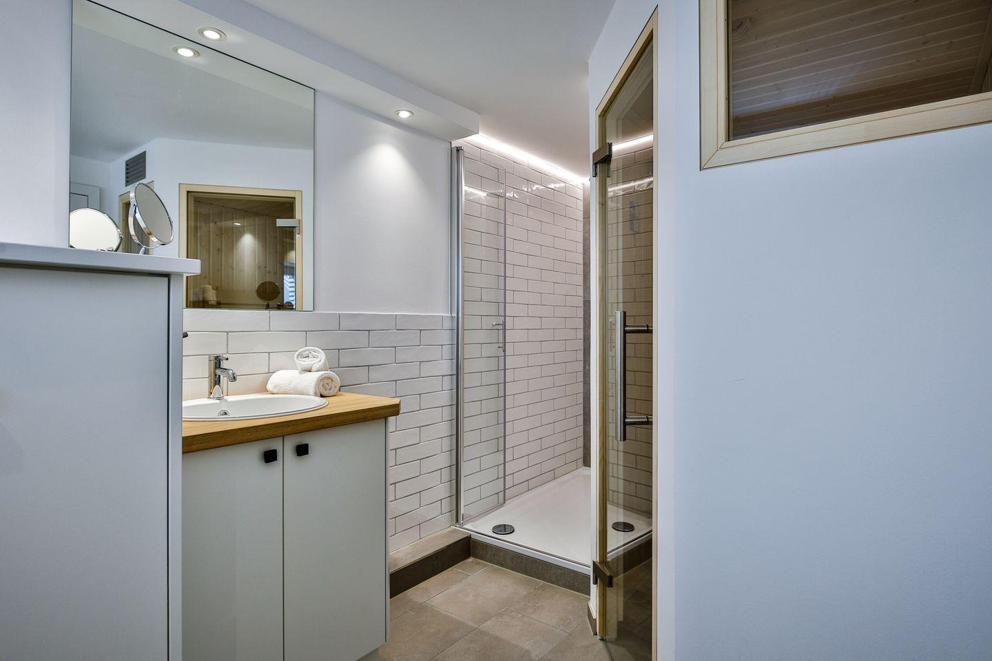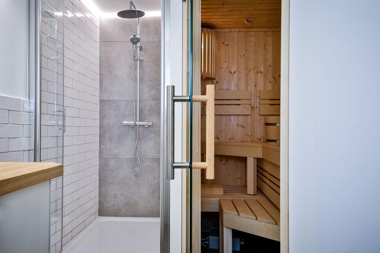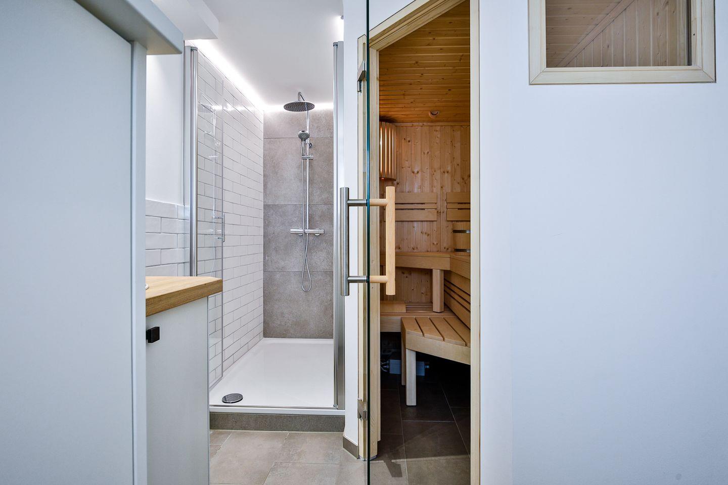 Vollbadezimmer besticht neben seiner bodentiefen Dusche mit einer eigenen Sauna