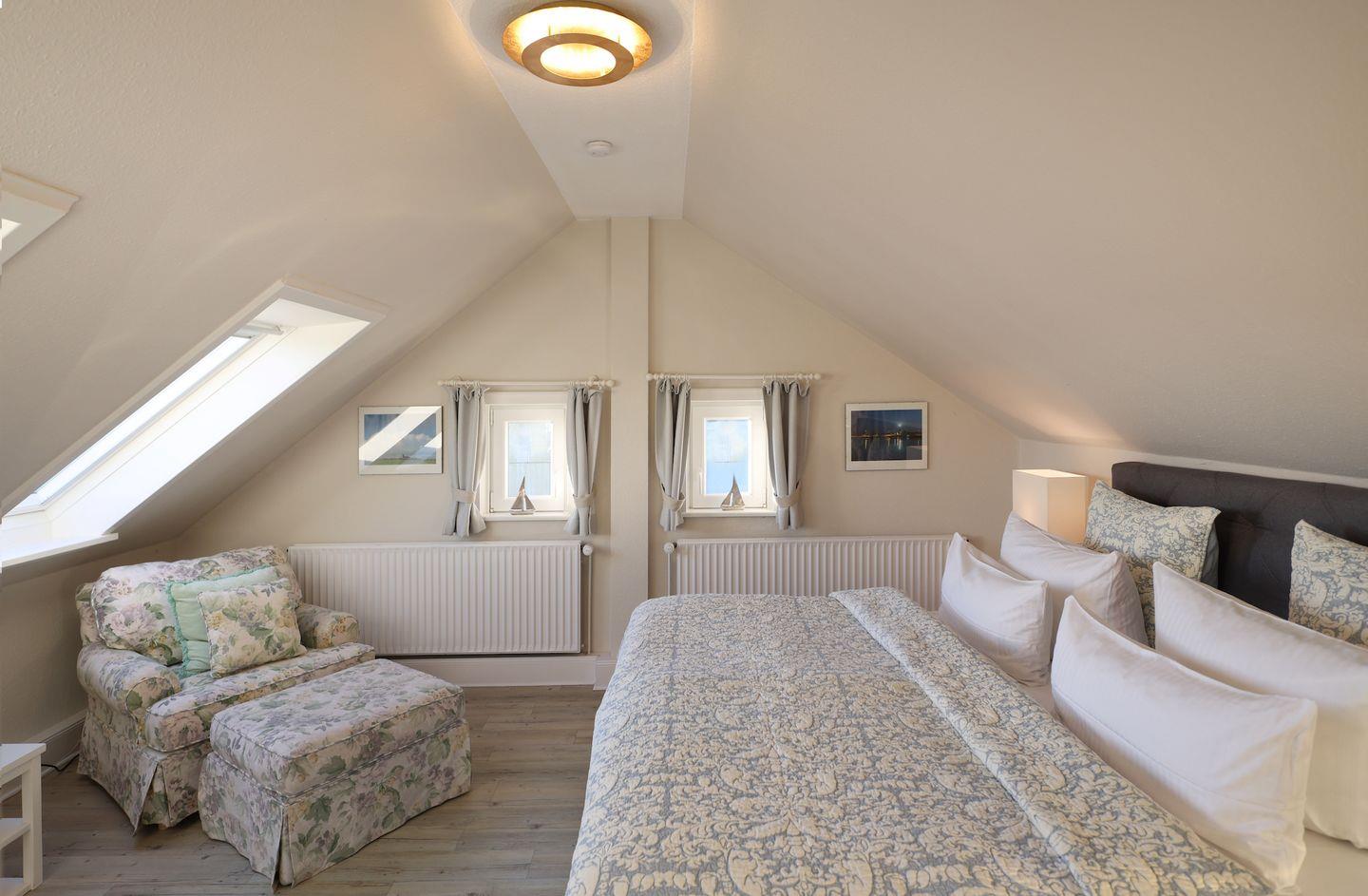 Im ersten Obergeschoss der Wohnung befinden sich zwei separate Alkoven-Schlafräume mit Einzelbett und hochwertigen Einbauschränken, die ausreichend Stauraum bieten. Im Dachgeschoss erwartet Sie das Hauptschlafzimmer mit Doppelbett und genügend Stauraum. Bei geöffnetem Fenster können Sie hier das beruhigende Meeresrauschen hören.