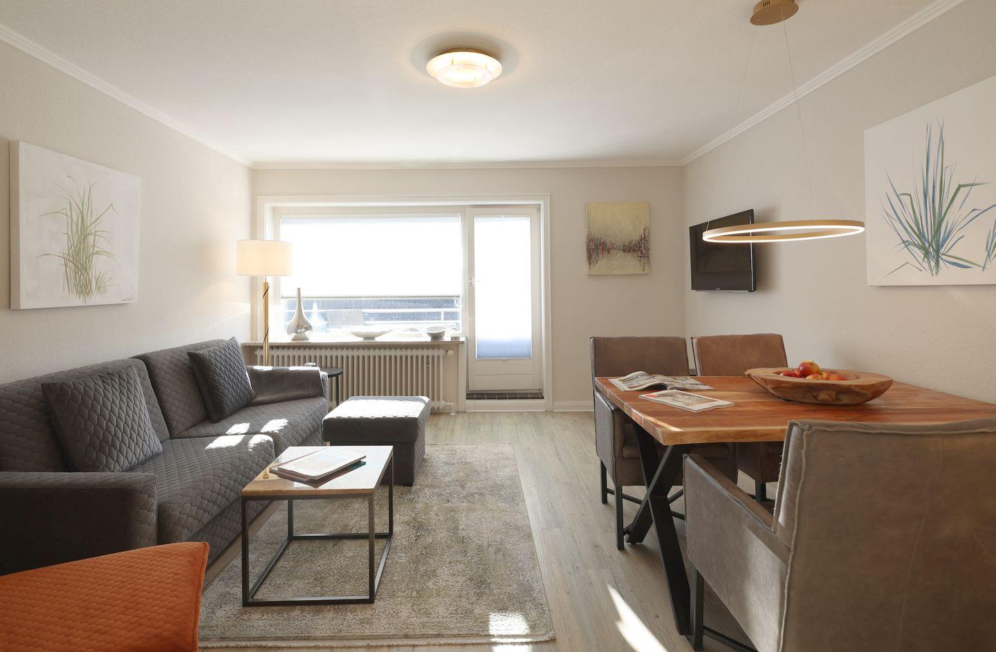Der lichtdurchflutete Wohnbereich lädt mit einem gemütlichen Sofa, das bei Bedarf für ein Kind aufgebettet werden kann, einem Sessel und einem Fernseher zum Verweilen ein. Der Südbalkon mit Sitzmöbeln, der über den Wohnbereich zugänglich ist, ermöglicht es Ihnen, das beruhigende Rauschen der Nordsee in vollen Zügen zu genießen.