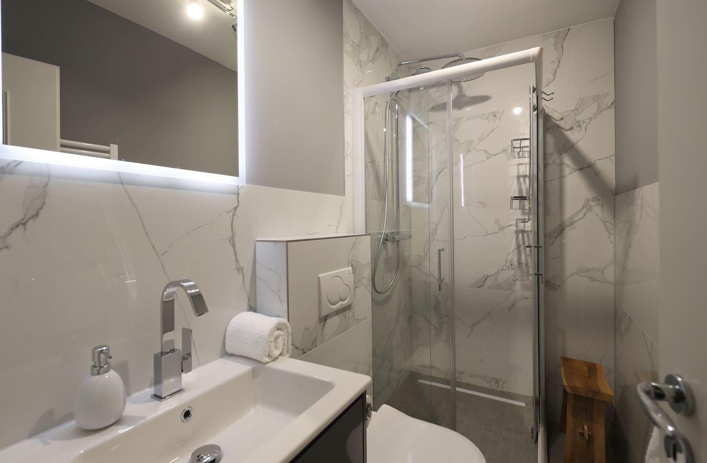 Das großzügige Badezimmer im Erdgeschoss bietet eine Dusche, einen Waschtisch und ein WC für Ihren Komfort.