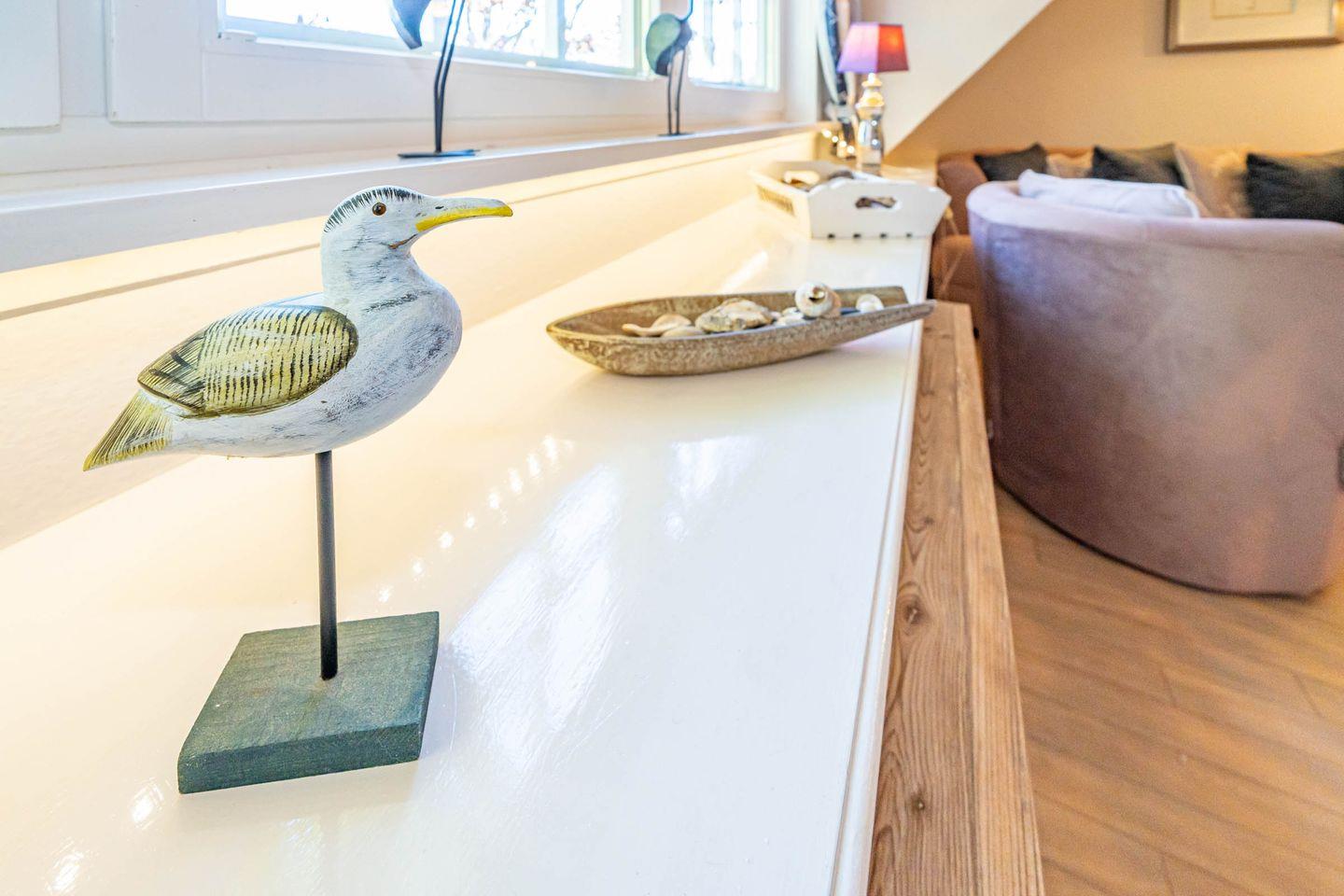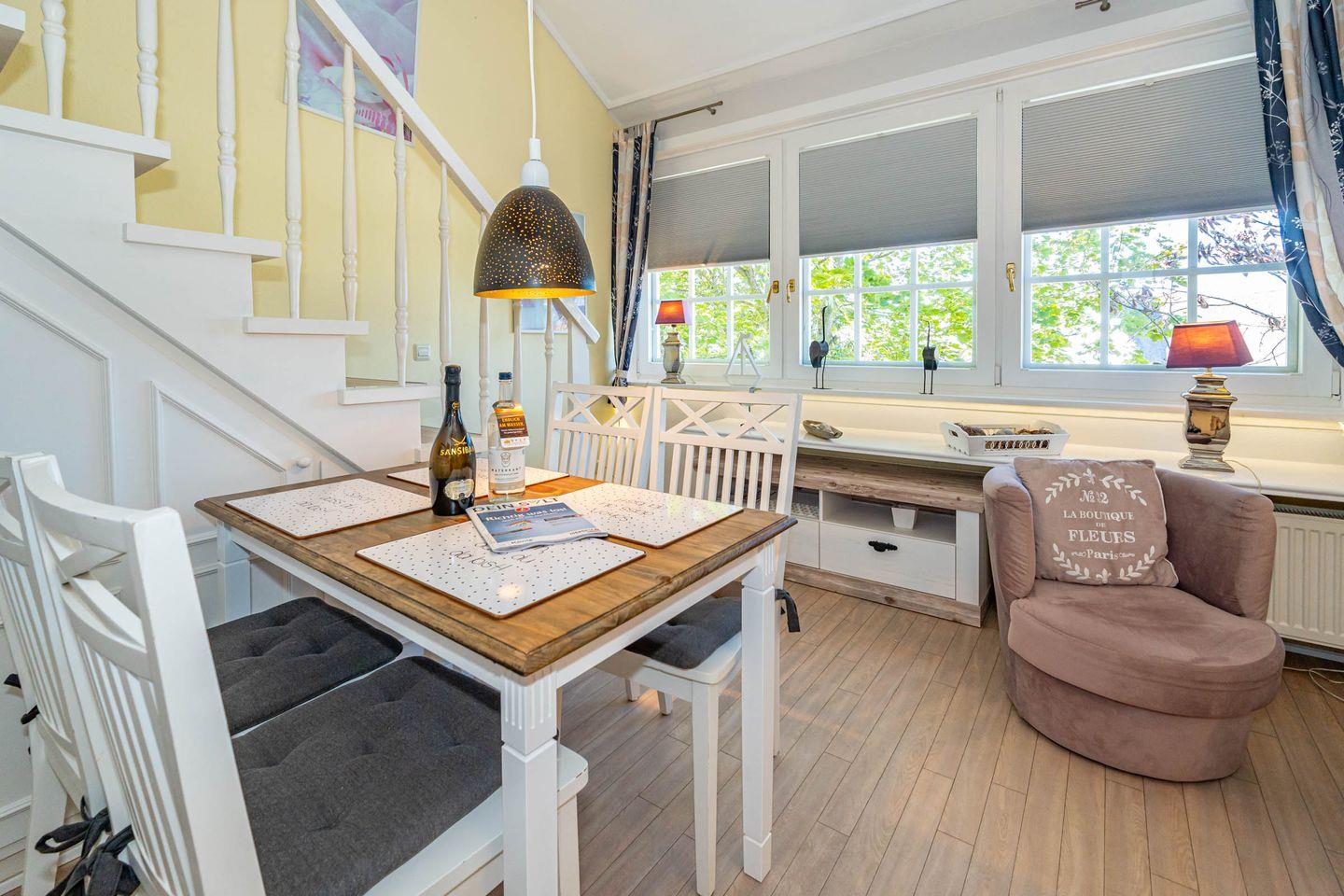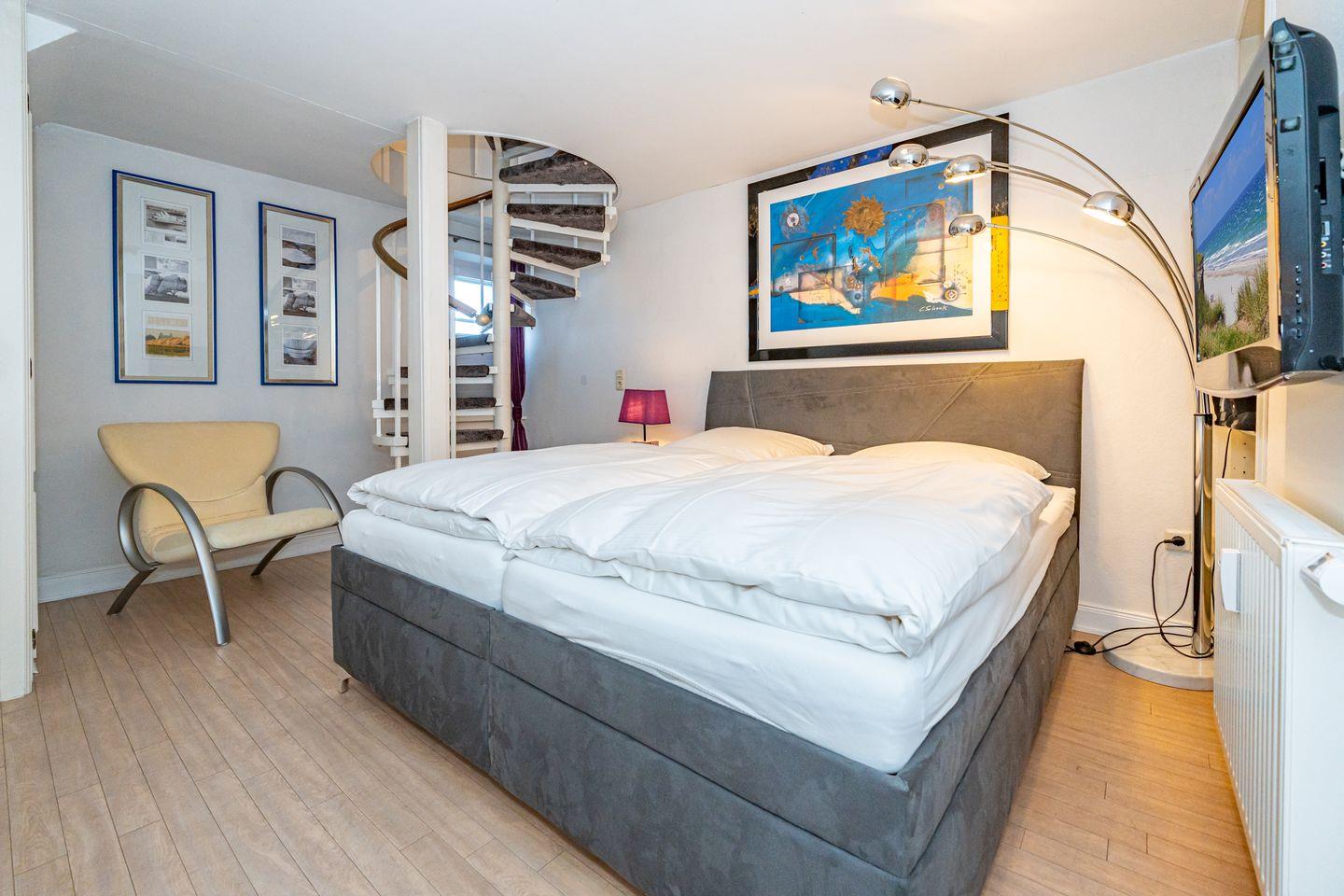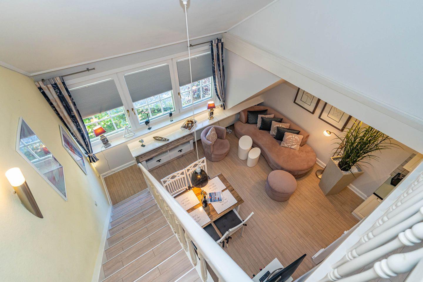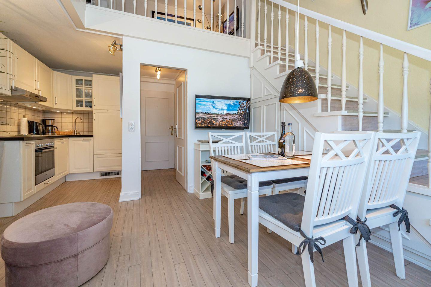 Diese Ferienwohnung befindet sich im 1 OG und erstreckt sich in offener Bauweise über zwei Ebenen. In der unteren Ebene befindet sich das Duschbad, die offene Einbauküche (Geschirrspüler, Kaffeefiltermaschine, Nespressomaschine, Gefrierfach, Toaster) mit einem Esstisch für vier Personen und dem Wohnbereich u.a. mit einem gemütlichen Sofa und Fernseher ausgestattet. Die Galerie-Ebene (offenes Schlafzimmer) erreichen Sie über eine Treppe, hier erwartet Sie ein gemütliches Boxspringbett und ein TV. Des Weiteren verfügt diese Ferienwohnung einen Blue-Ray-Player, einer CD-Musik- und Radioanlage sowie kostenloses WLAN.