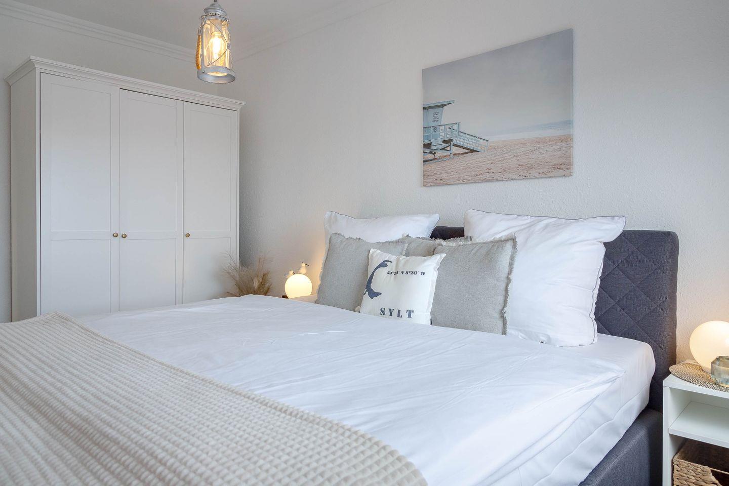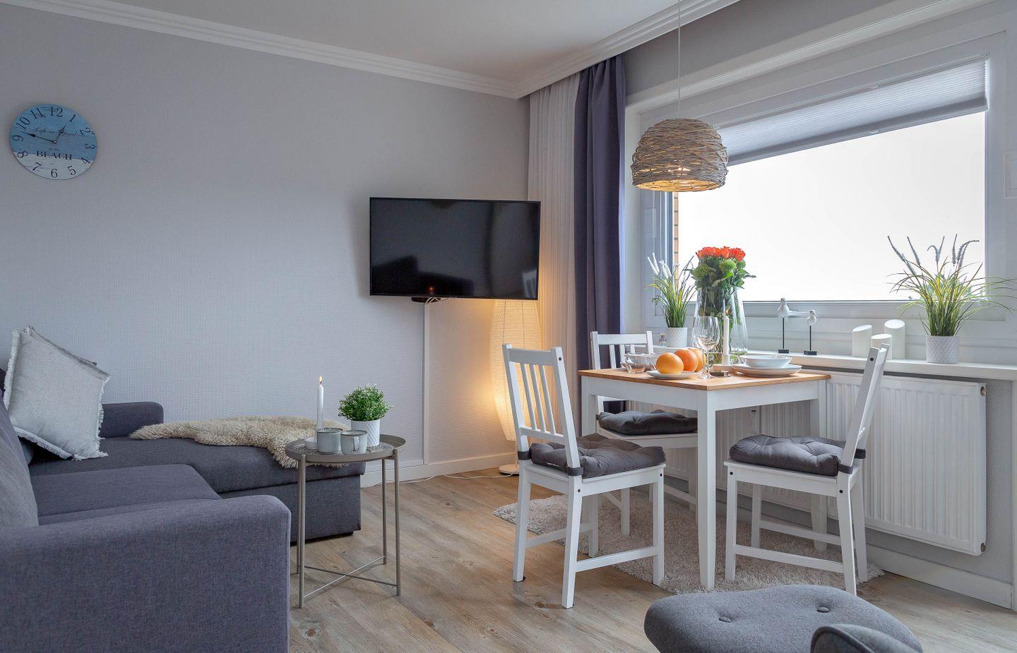 Der helle Wohnraum mit Schlafsofa ist mit Designboden ausgestattet und hat einen Südbalkon. Im Schlafzimmer befindet sich ein Kleiderschrank sowie ein Doppelbett.