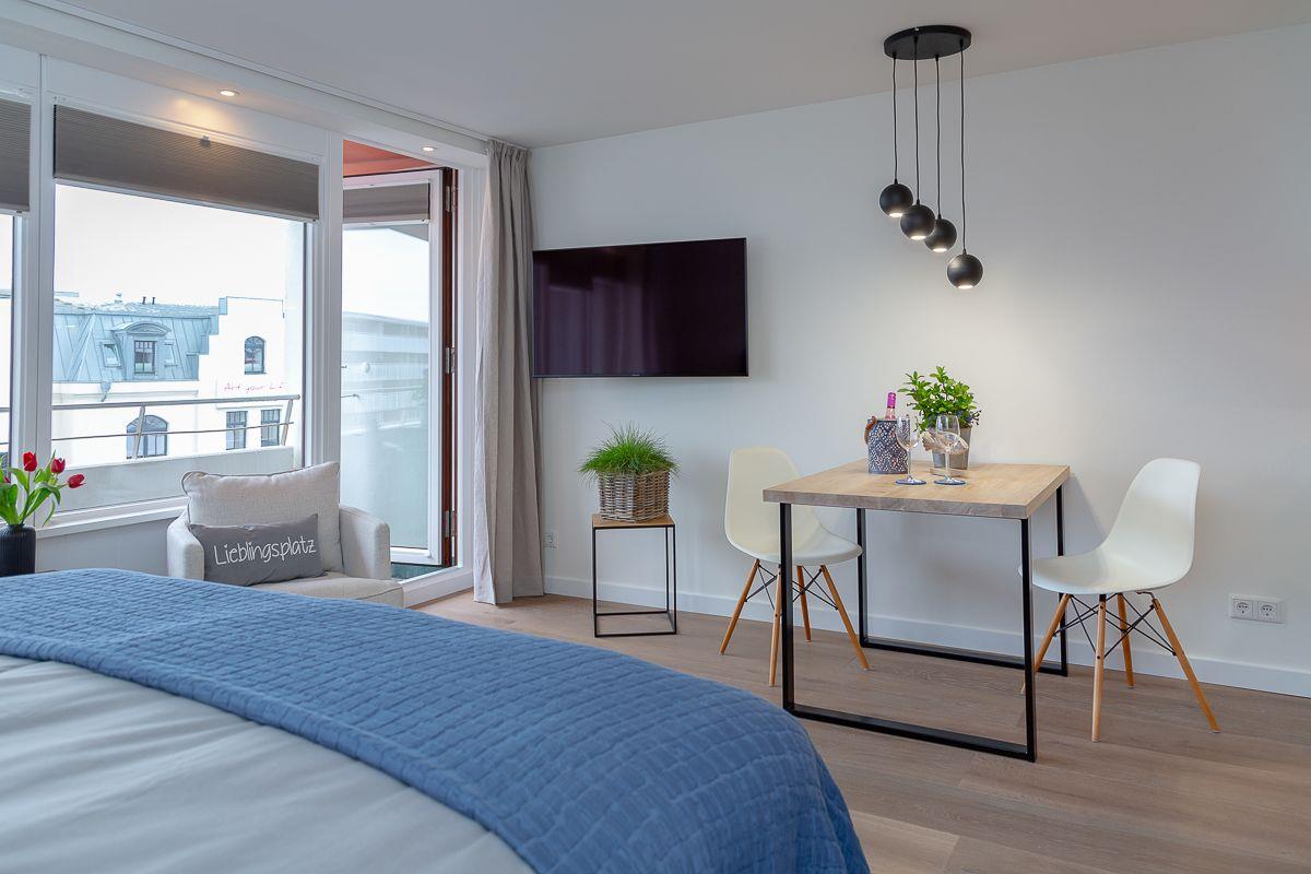 Wir freuen uns, Sie in unserem neuen Domizil Meeresbrise62 willkommen heißen zu dürfen. In diesem eleganten Appartement finden zwei Personen in bester Lage einen charmanten und gleichzeitig exklusiven Ort, um ihren Traumurlaub genießen zu können. Das Stadt-Appartement befindet sich in der 2. Etage, die über einen großzügigen Flur und einen Fahrstuhl mühelos zu erreichen ist. Waschmaschine & Trockner (gemeinschaftlich). Das helle Ambiente wird durch die gelungene Inszenierung von hochwertigem Mobiliar und farblich abgestimmten Accessoires zusätzlich unterstützt. Der Naturholz - Boden und die extra angefertigten Einbauten runden dieses Bild stimmig ab.