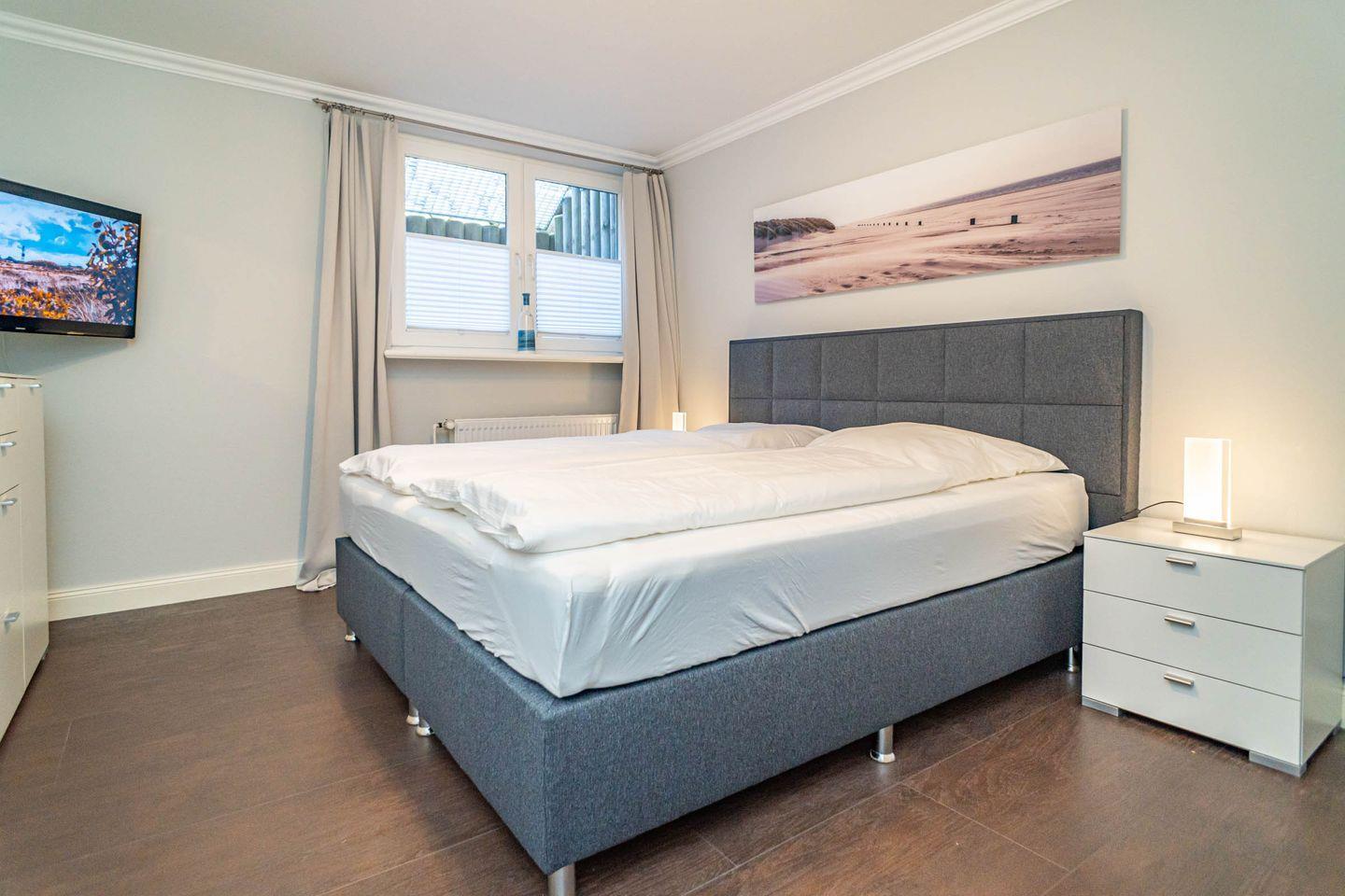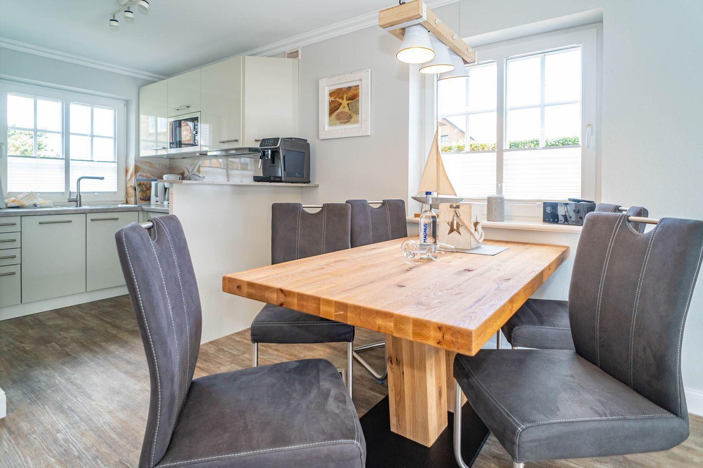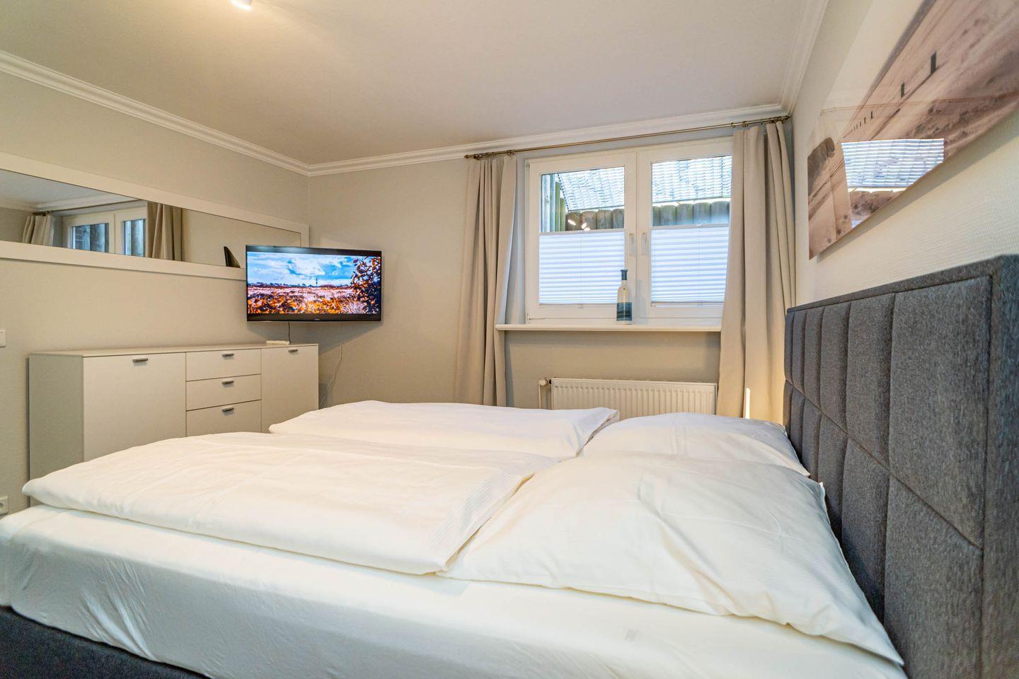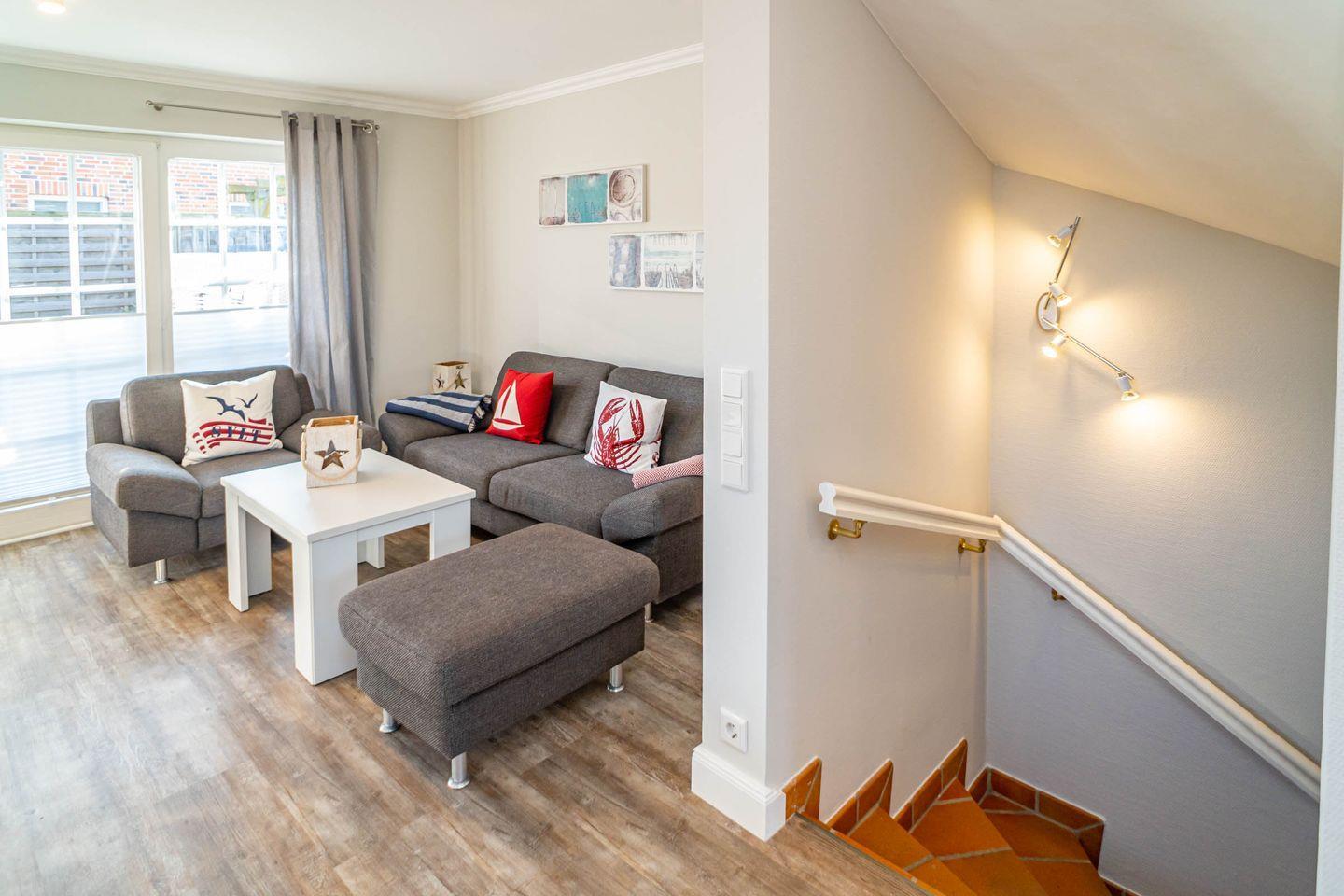 Im Erdgeschoss befindet sich ein gemütliches Wohn- und Esszimmer mit offener Küche. Vom Wohnzimmer mit Sofa, Sessel und TV haben Sie Zutritt zur nach Süden ausgerichteten Terrasse mit Gartenmöbeln und Strandkorb (saisonal). Im Garten befindet sich ebenfalls die Sauna. Die offene Küche ist ausgestattet mit einem Kühlschrank, Kaffeefiltermaschine, Kaffeevollautomaten, Gefrierfach, Toaster und Geschirrspüler. Über eine Treppe gelangen Sie in das Untergeschoss/Souterrain. Hier befindet sich ein Badezimmer mit Dusche, WC, Waschtisch, Handtuchtrockner und ein Waschtrockner. Ebenso ein Schlafzimmer mit Boxspringbett, TV, Spiegel und Kleiderschrank. Im ersten Obergeschoss finden Sie das 2. Schlafzimmer mit Doppelbett, TV, Kleiderschrank und Südbalkon auch hier gibt es ein Badezimmer mit Dusche, WC und Handtuchtrockner. Im Dachgeschoss befindet sich das 3. Schlafzimmer mit einem Doppelbett und TV. Ein PKW Stellplatz steht Ihnen am Haus zur Verfügung. Sollten Sie mit mehreren Autos anreisen, besteht die Möglichkeit kostenfrei in der Straße an der Seite zu parken.