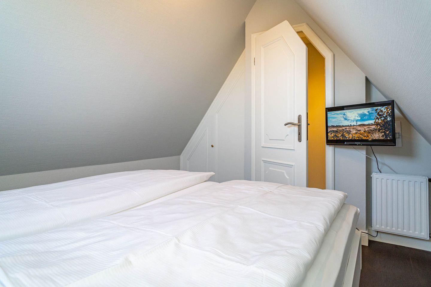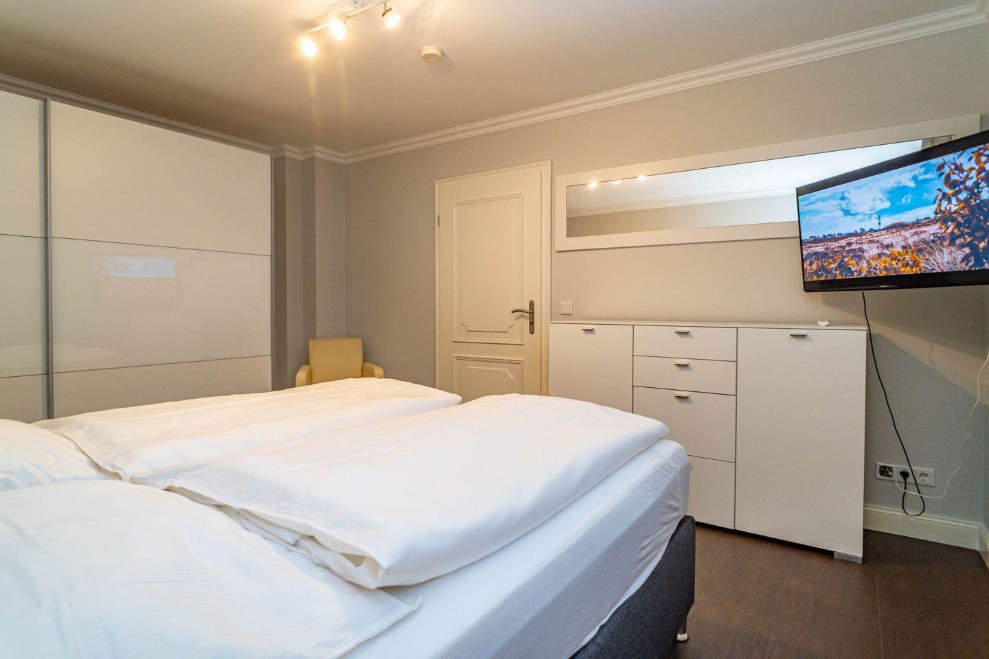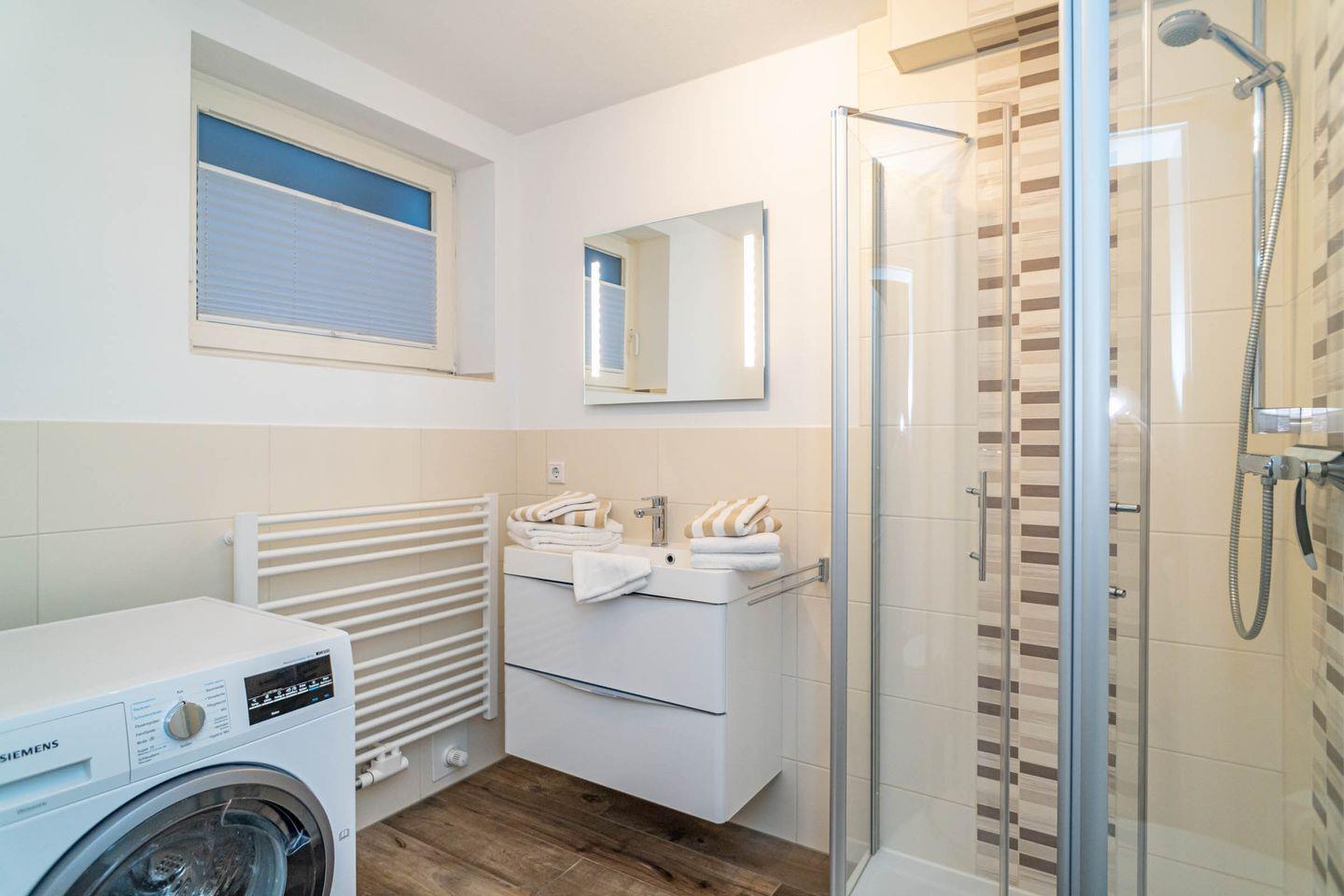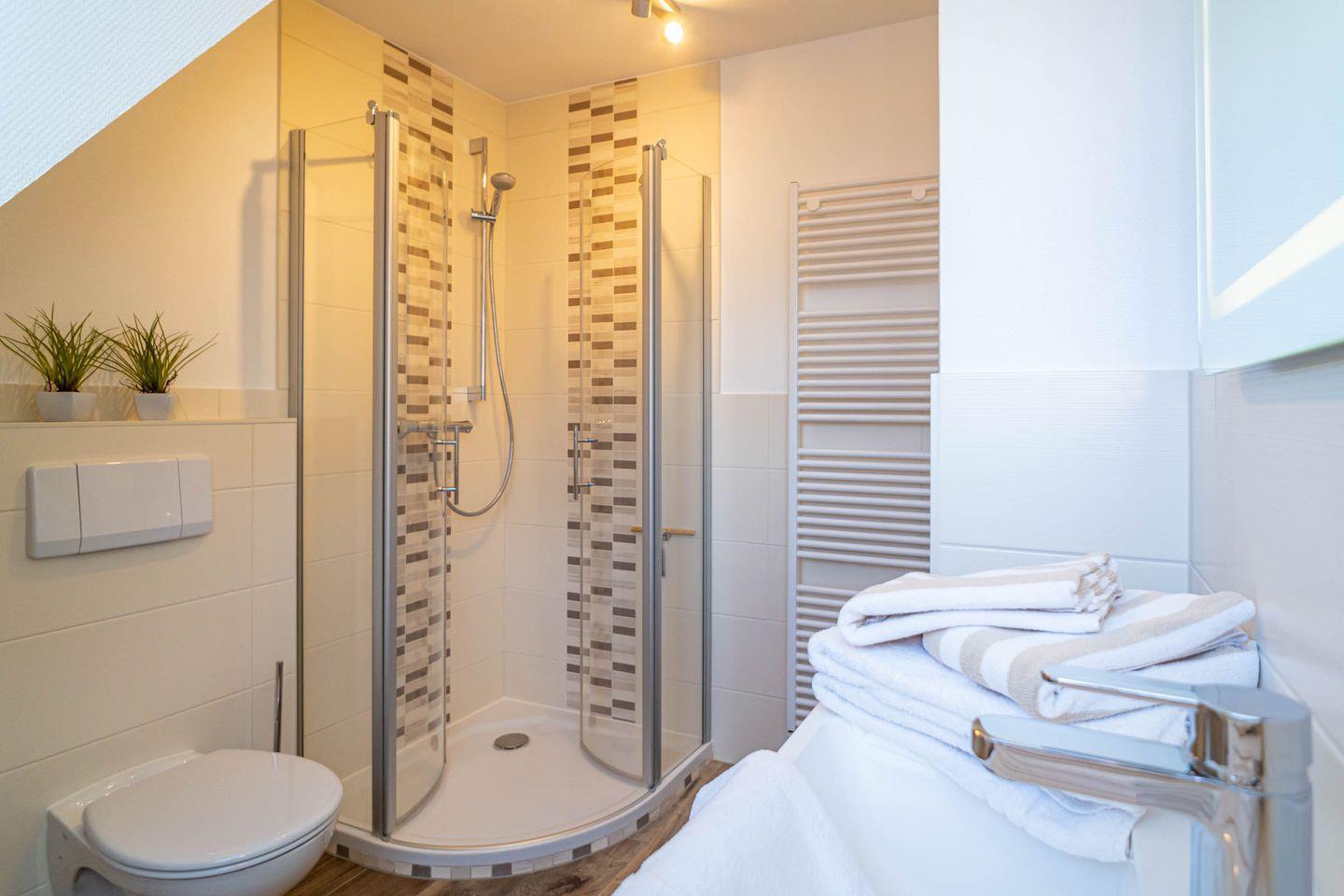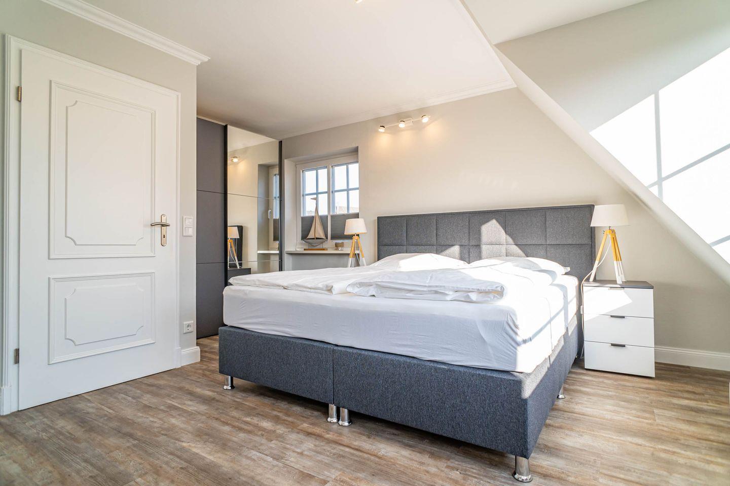 Im Erdgeschoss befindet sich ein gemütliches Wohn- und Esszimmer mit offener Küche. Vom Wohnzimmer mit Sofa, Sessel und TV haben Sie Zutritt zur nach Süden ausgerichteten Terrasse mit Gartenmöbeln und Strandkorb (saisonal). Im Garten befindet sich ebenfalls die Sauna. Die offene Küche ist ausgestattet mit einem Kühlschrank, Kaffeefiltermaschine, Kaffeevollautomaten, Gefrierfach, Toaster und Geschirrspüler. Über eine Treppe gelangen Sie in das Untergeschoss/Souterrain. Hier befindet sich ein Badezimmer mit Dusche, WC, Waschtisch, Handtuchtrockner und ein Waschtrockner. Ebenso ein Schlafzimmer mit Boxspringbett, TV, Spiegel und Kleiderschrank. Im ersten Obergeschoss finden Sie das 2. Schlafzimmer mit Doppelbett, TV, Kleiderschrank und Südbalkon auch hier gibt es ein Badezimmer mit Dusche, WC und Handtuchtrockner. Im Dachgeschoss befindet sich das 3. Schlafzimmer mit einem Doppelbett und TV. Ein PKW Stellplatz steht Ihnen am Haus zur Verfügung. Sollten Sie mit mehreren Autos anreisen, besteht die Möglichkeit kostenfrei in der Straße an der Seite zu parken.