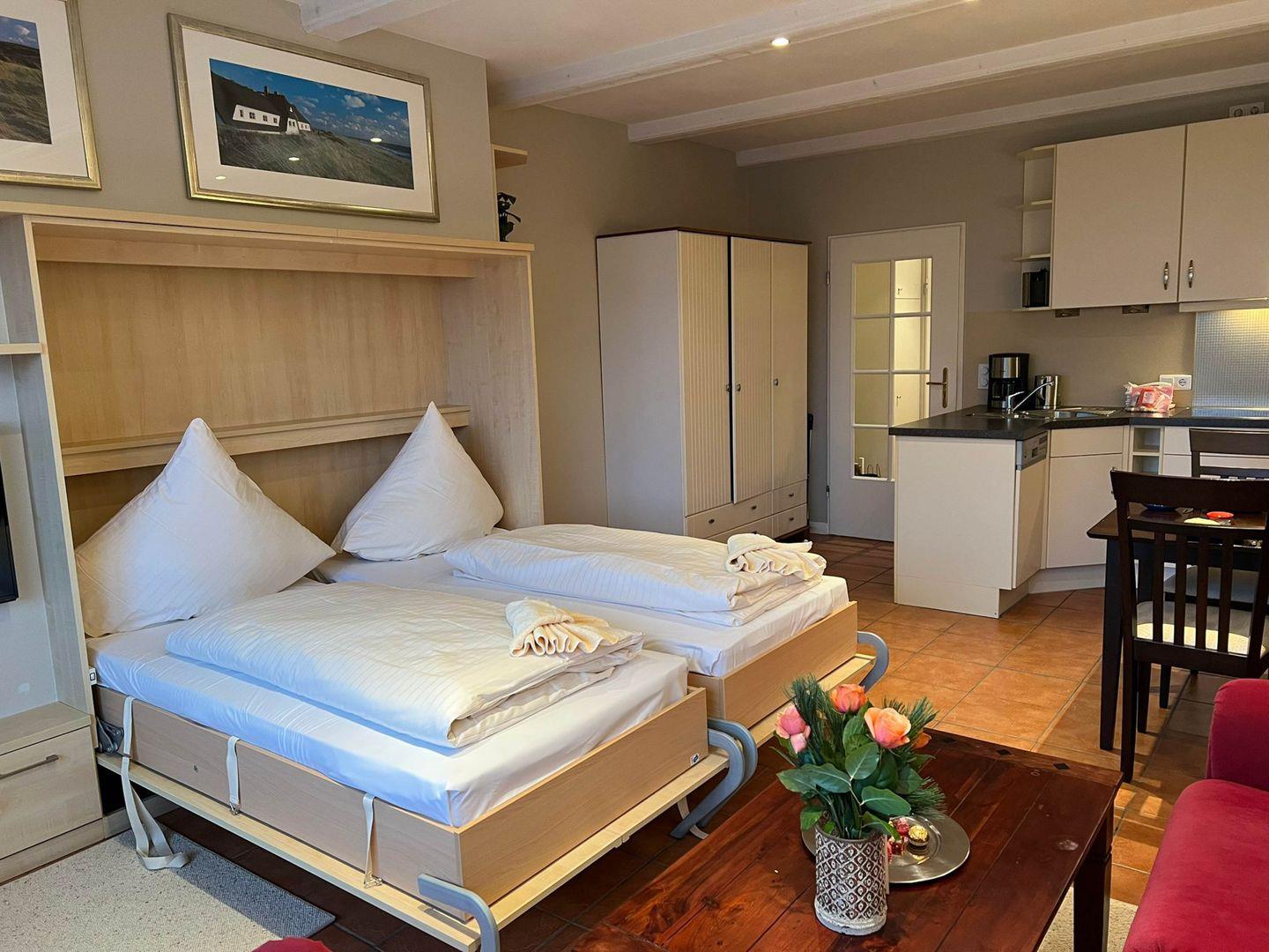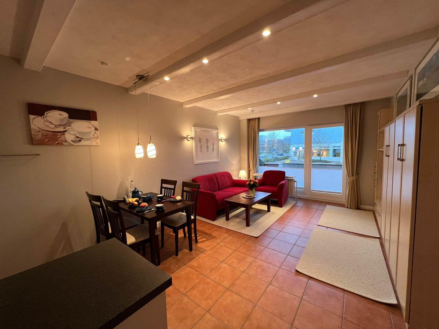 Das 1-Zimmer-Ferienappartement liegt superzentral in der lebendigen Inselhauptstadt Westerland, aber etwas abseits des ganz wilden Getümmels. Zum Supermarkt um die Ecke und zum Bäcker nebenan ist es jeweils nur ein Katzensprung, auch der Strand, der Bahnhof und Busse sind zu Fuß nur wenigen Minuten entfernt. Die „Robbe“ ist umsichtig und mit Sinn für alles Nötige ausgestattet, rund 37 Quadratmeter groß und auch noch rollatorfreundlich. Ein eigener Parkplatz, das ist nicht unwichtig so zentral, wenn man gern mit dem Auto anreist, gehört auch noch dazu.