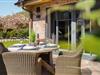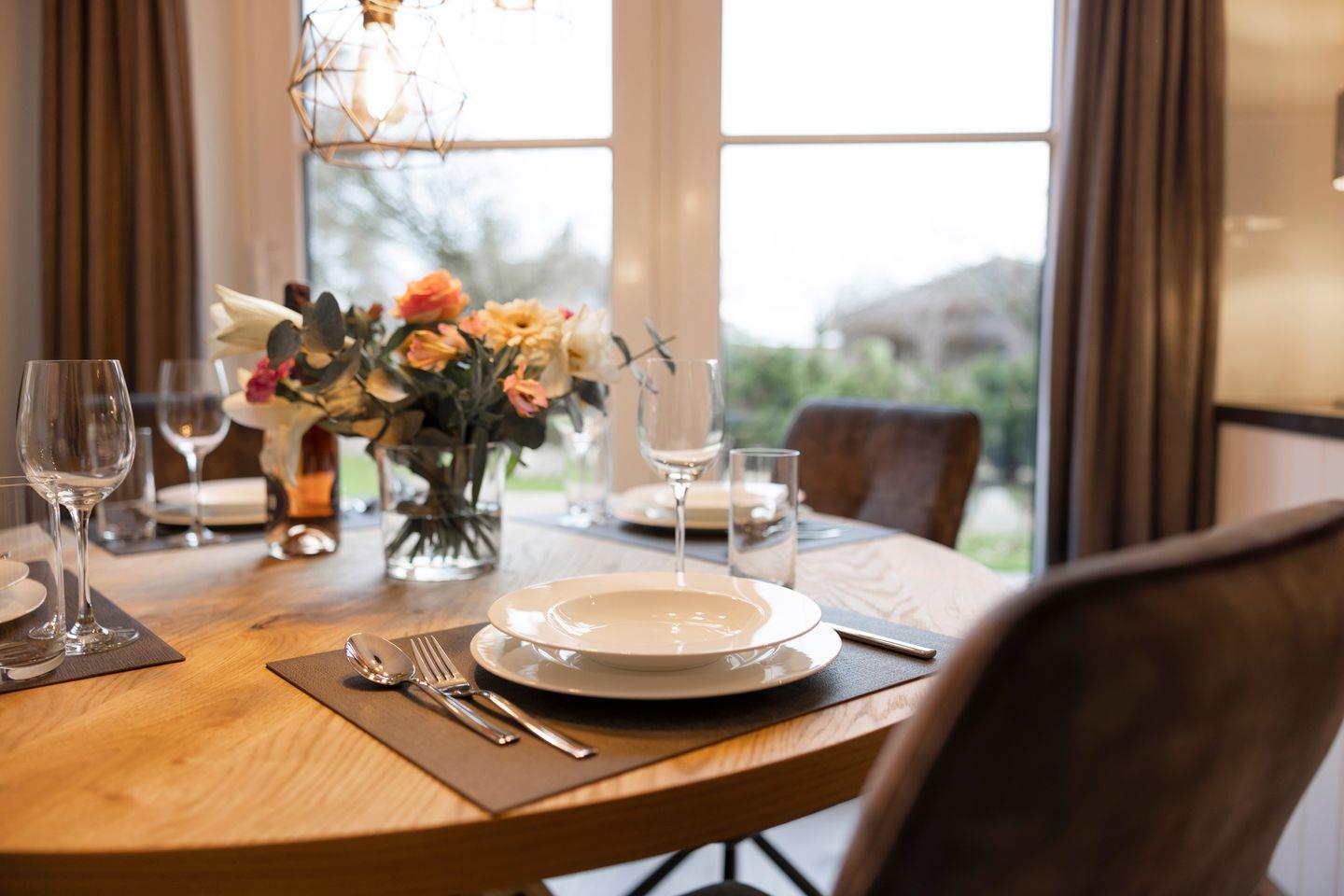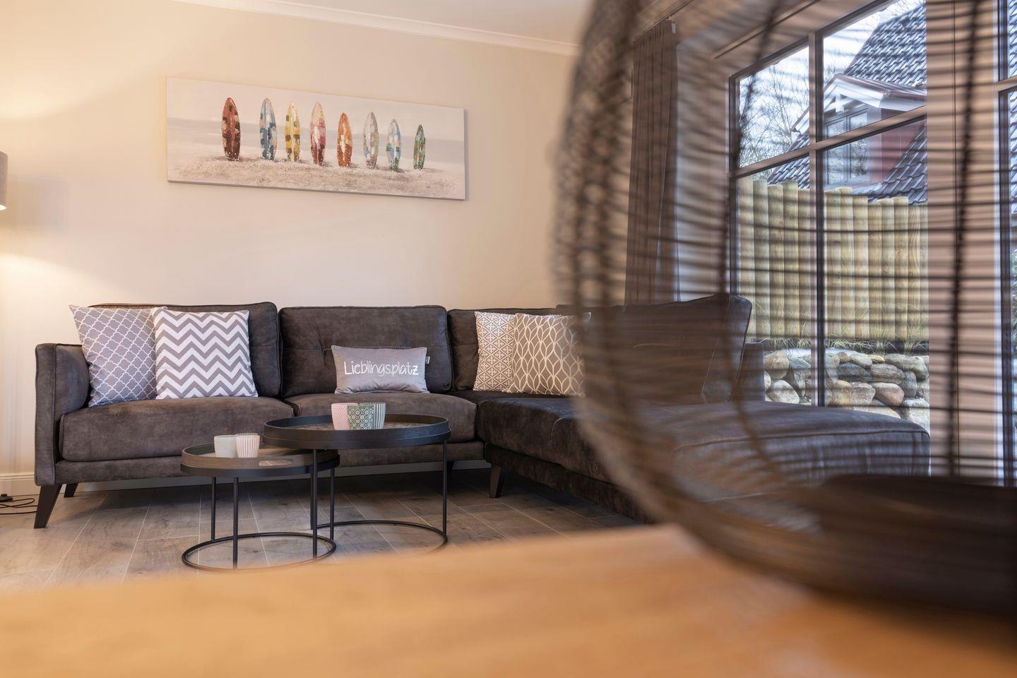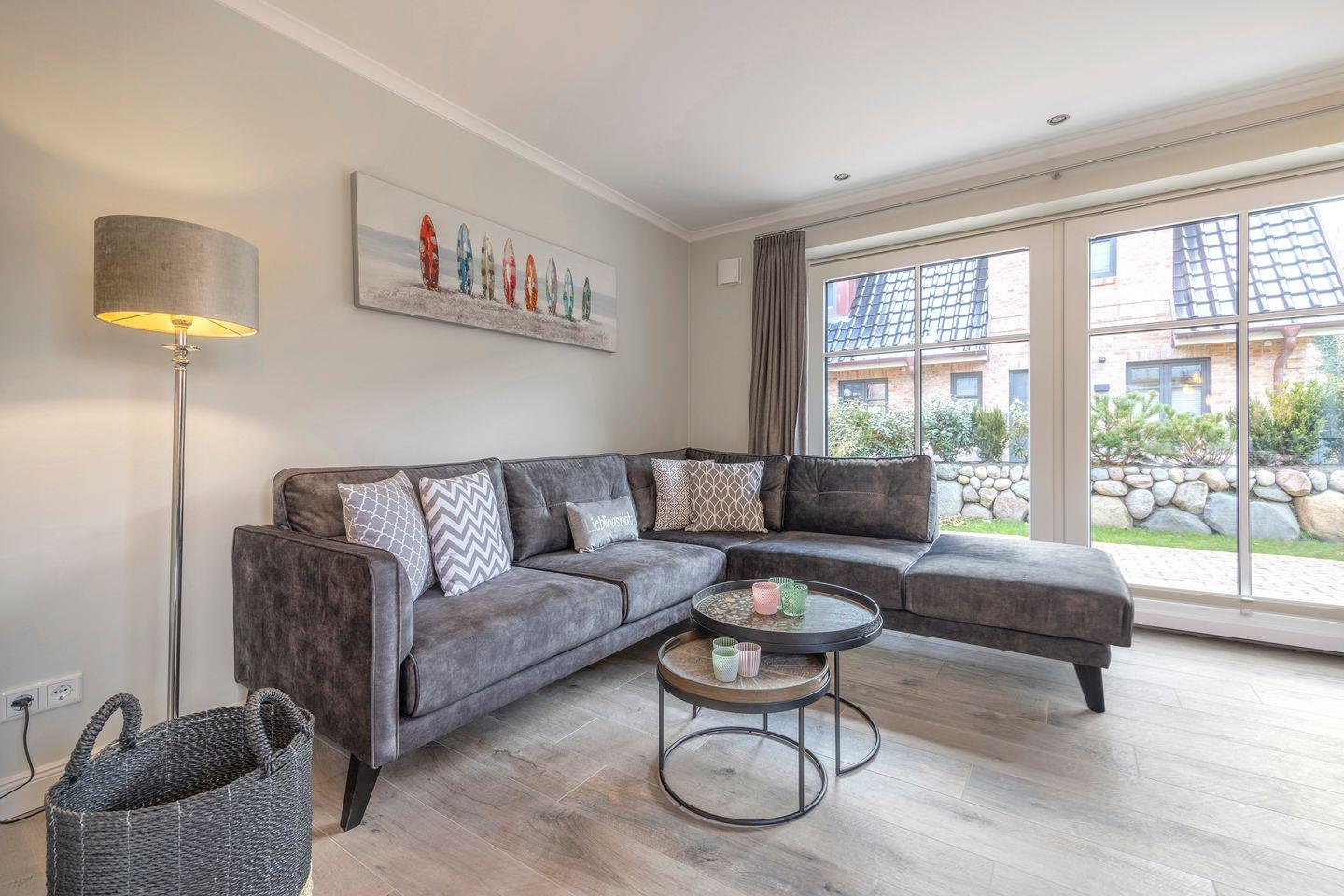 Das einladende Wohnzimmer ist mit einer komfortablen Sofaecke, einem großen Esstisch für 4 Personen und einem TV ausgestattet. Von hier aus haben Sie direkten Zugang zur möblierten Gartenterrasse, die nach Süden und Westen ausgerichtet ist und zu entspannten Stunden im Freien einlädt.