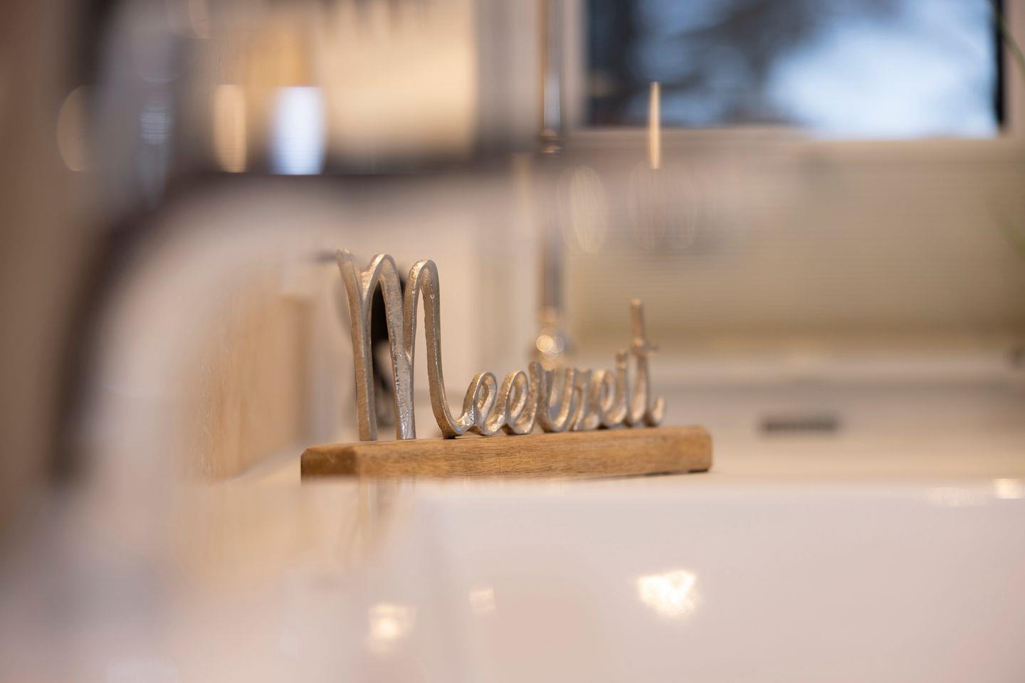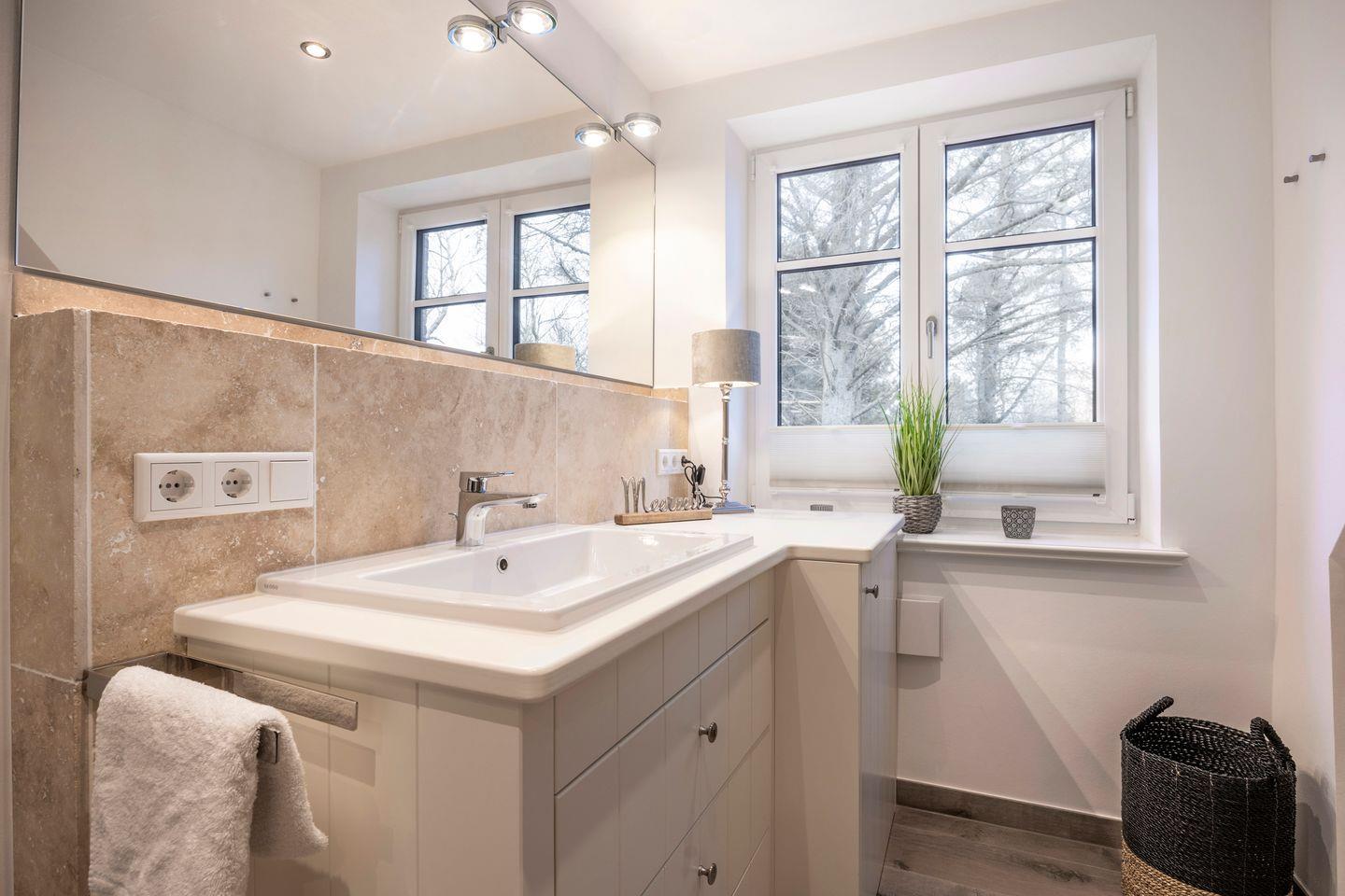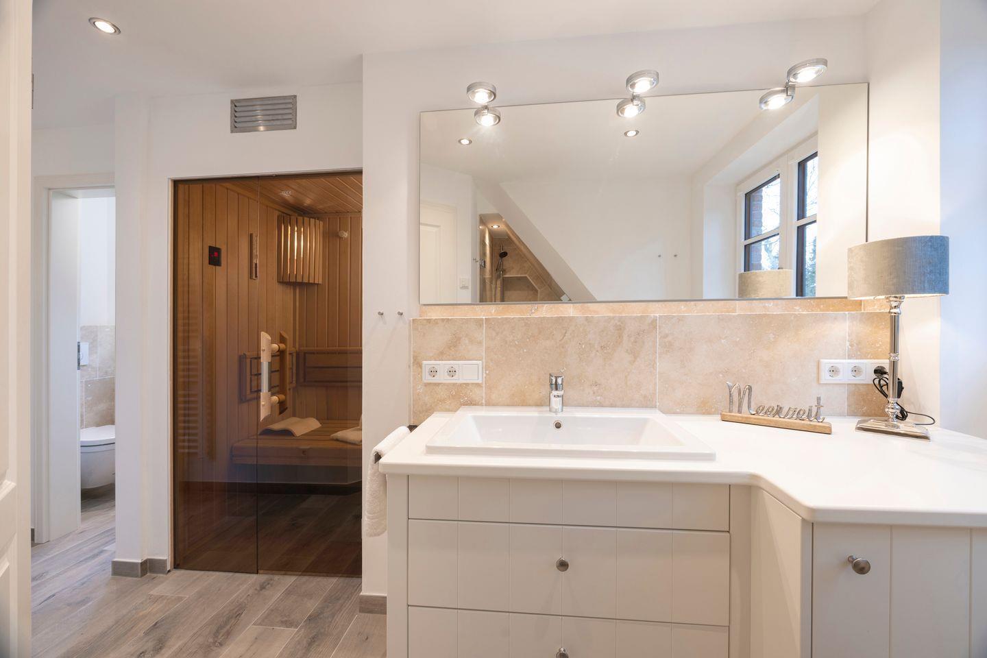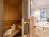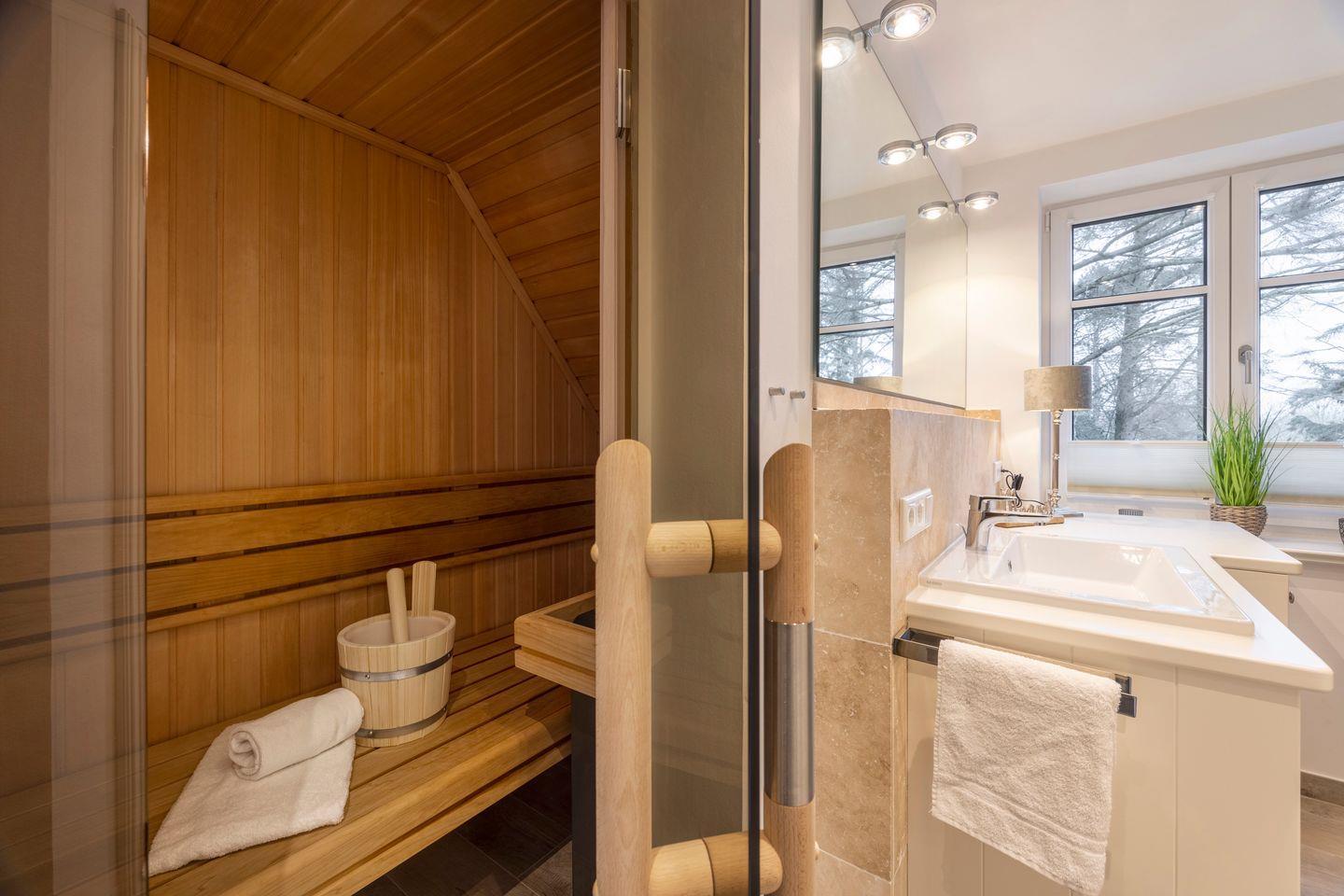 Das Hauptbadezimmer im Erdgeschoss ist ein besonderes Highlight mit einer ebenerdigen Dusche, WC, Handtuchwärmer, Föhn und Waschtrockner. Die private Sauna lädt zum Entspannen und Wohlfühlen ein.