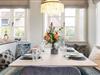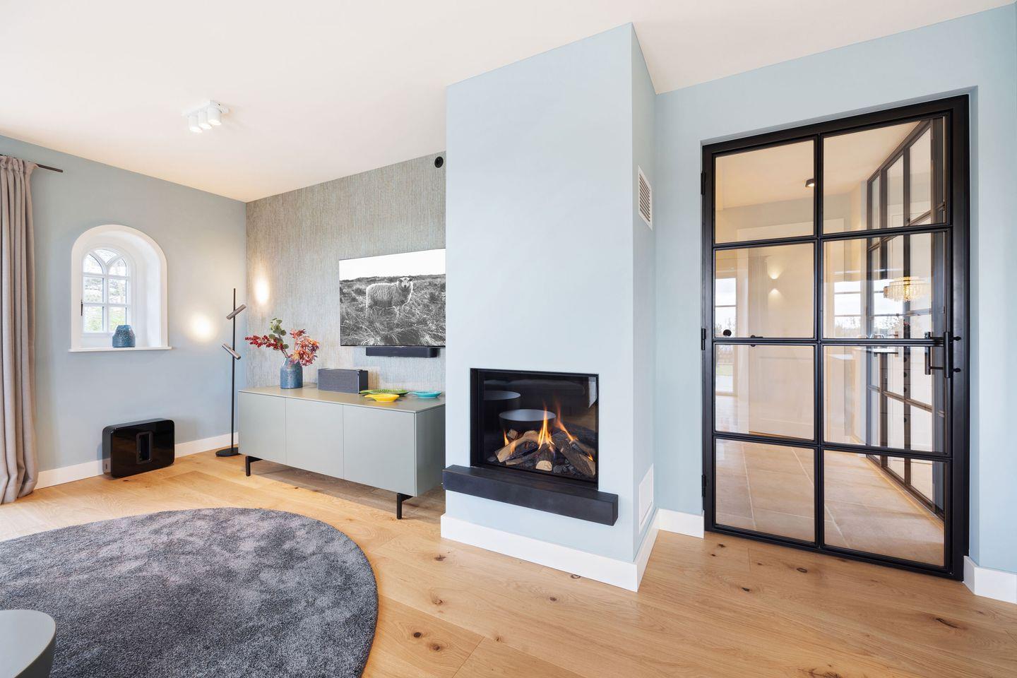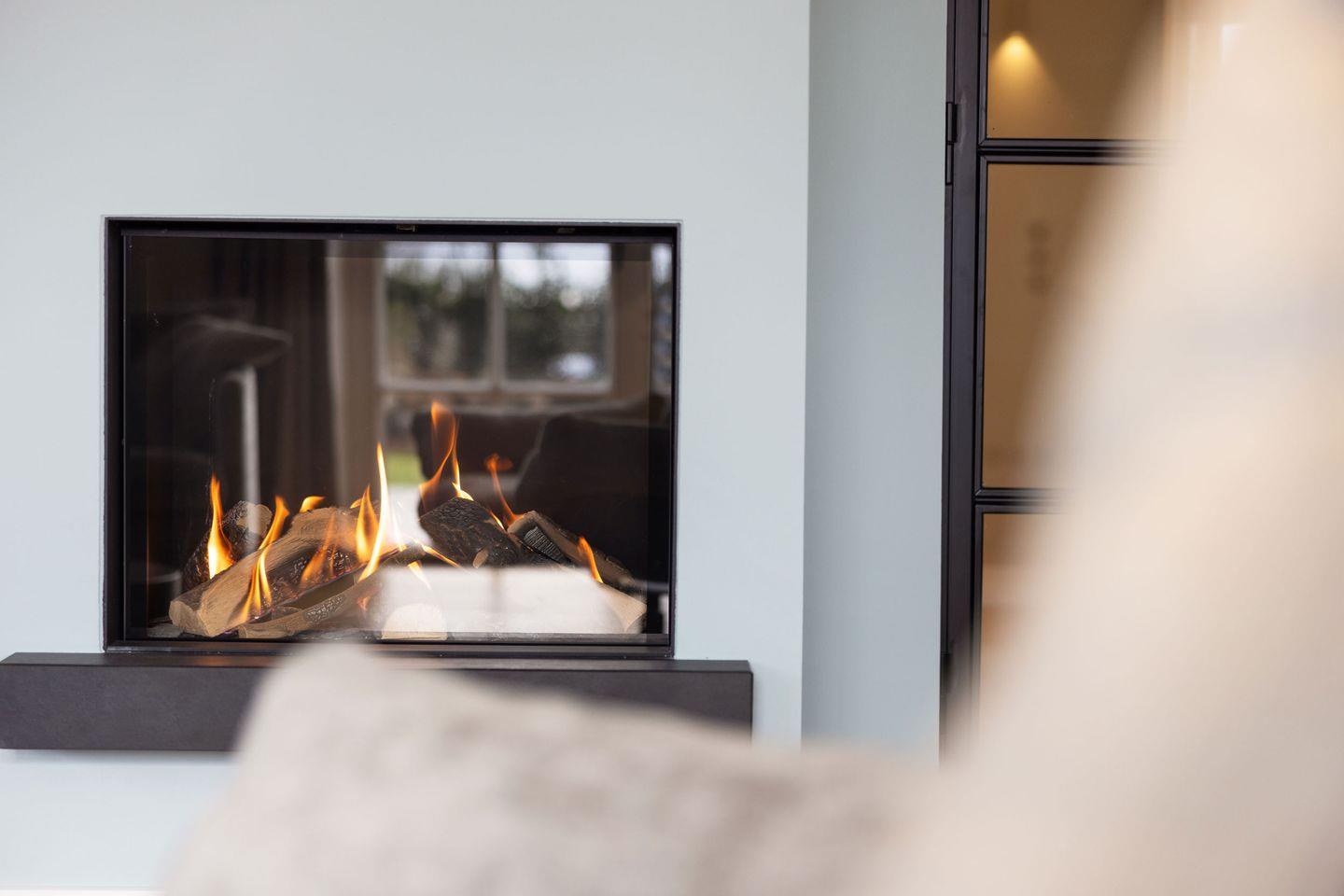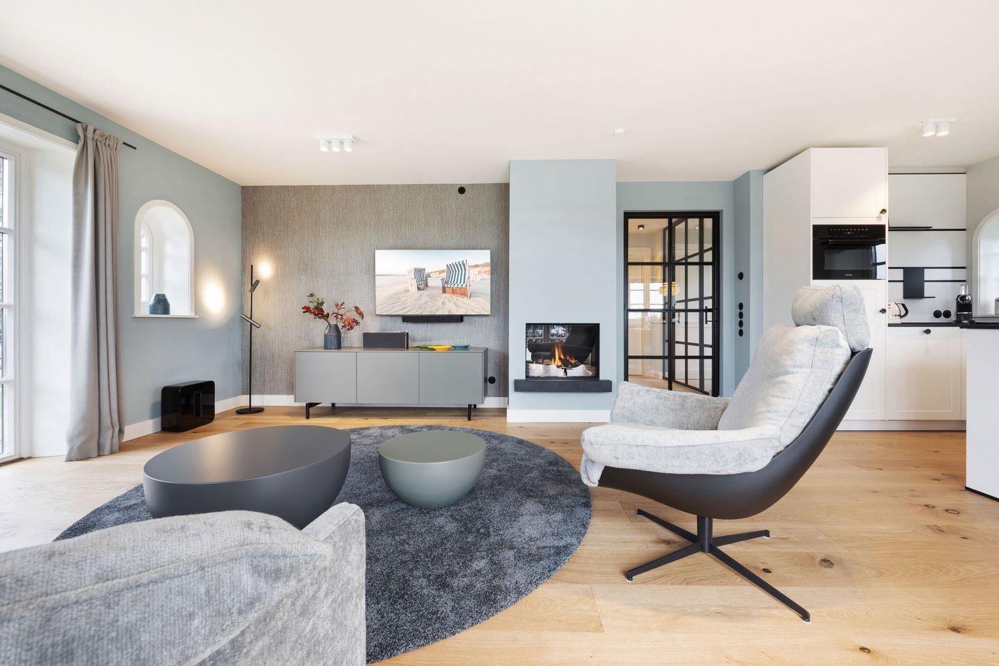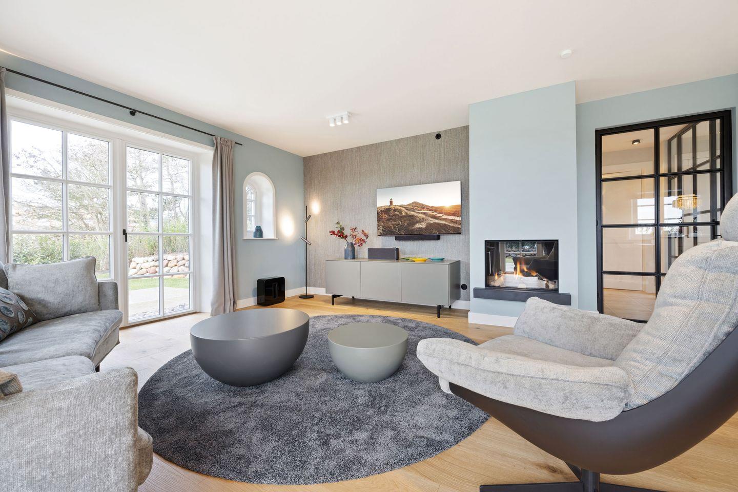 Der lichtdurchflutete Wohnbereich besticht durch seine moderne, hochwertige Einrichtung und den gemütlichen Gaskamin, der eine warme Atmosphäre schafft. Die komfortable Couch lädt zum Verweilen ein, während der großzügige Esstisch, direkt am Kamin, Platz für gesellige Mahlzeiten bietet. Vom Wohnzimmer aus gelangen Sie direkt in den schönen Garten mit zwei sonnigen Terrassen – ideal für entspannte Stunden im Freien.
