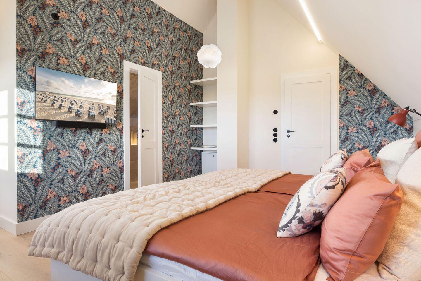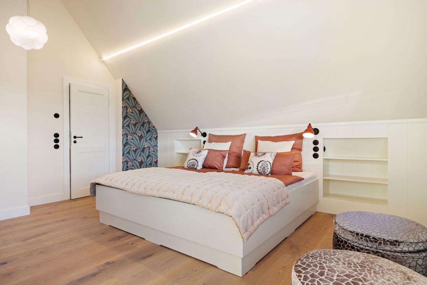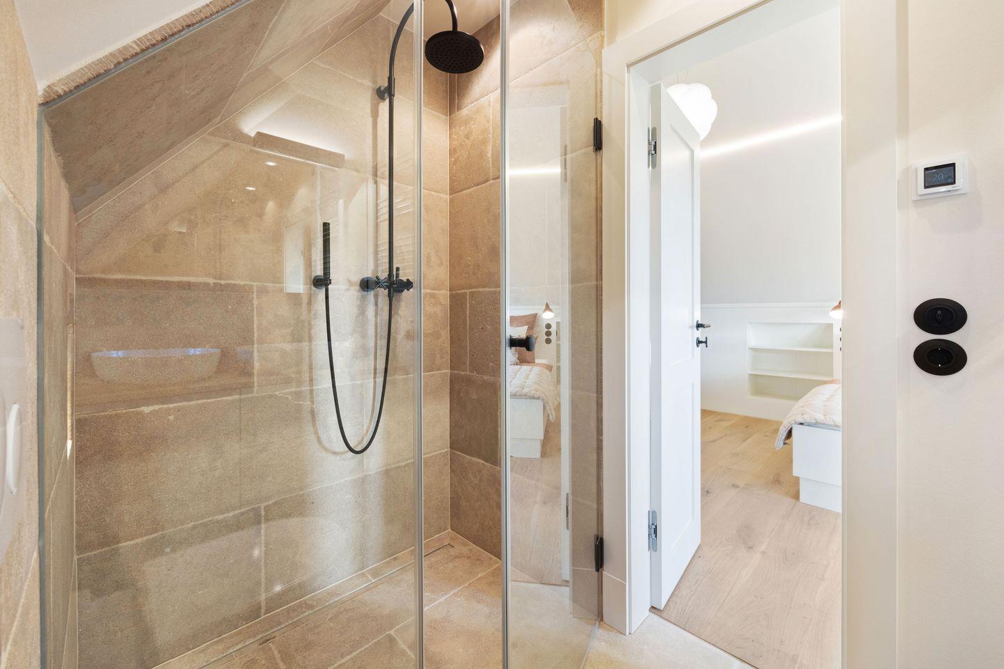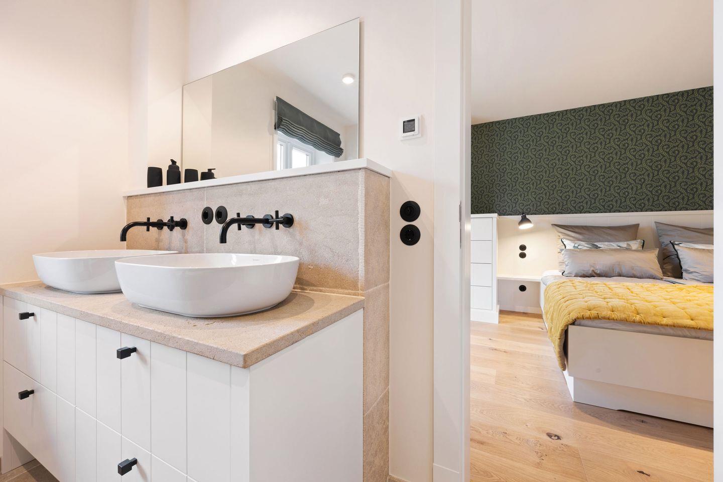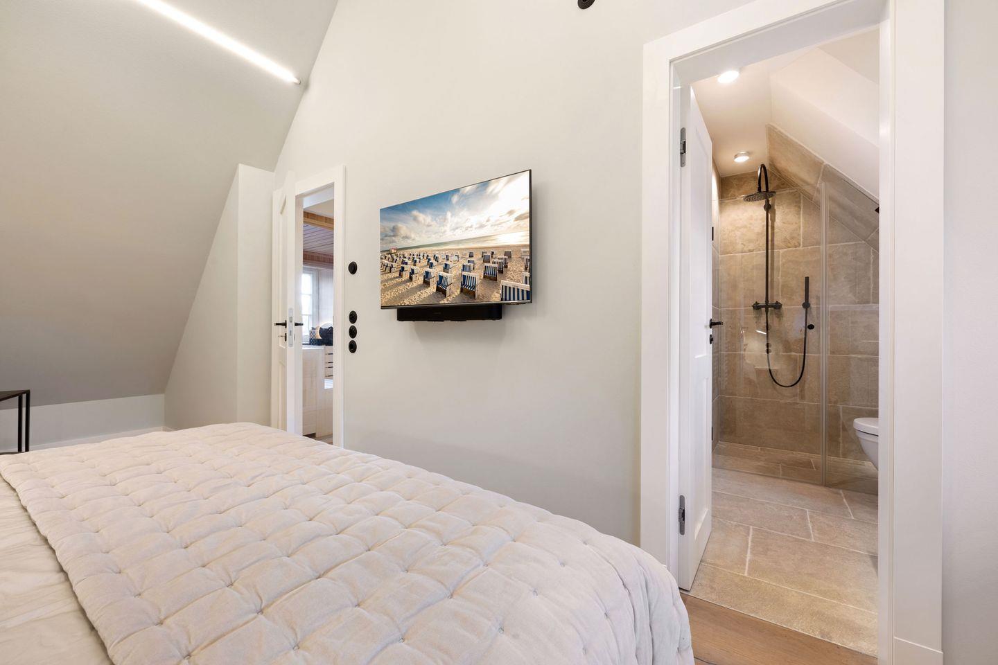 Alle drei Schlafzimmer sind mit luxuriösen Boxspring-Doppelbetten (180x200 cm) und Einbauschränken ausgestattet und bieten höchsten Schlafkomfort. Jedes Schlafzimmer verfügt über ein angrenzendes Badezimmer, das mit Tageslicht, Fußbodenheizung und Föhn ausgestattet ist und Ihnen ein kleines Wellness-Erlebnis bietet. Die Bäder verfügen über bodengleiche Duschen und eine Badewanne – perfekt für entspannte Momente.