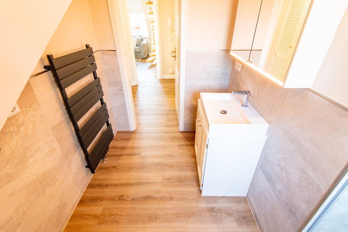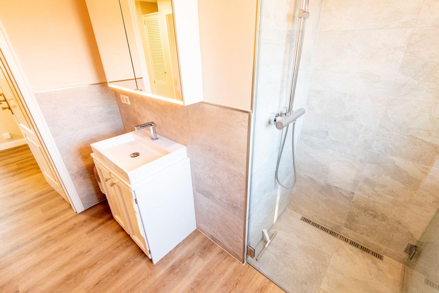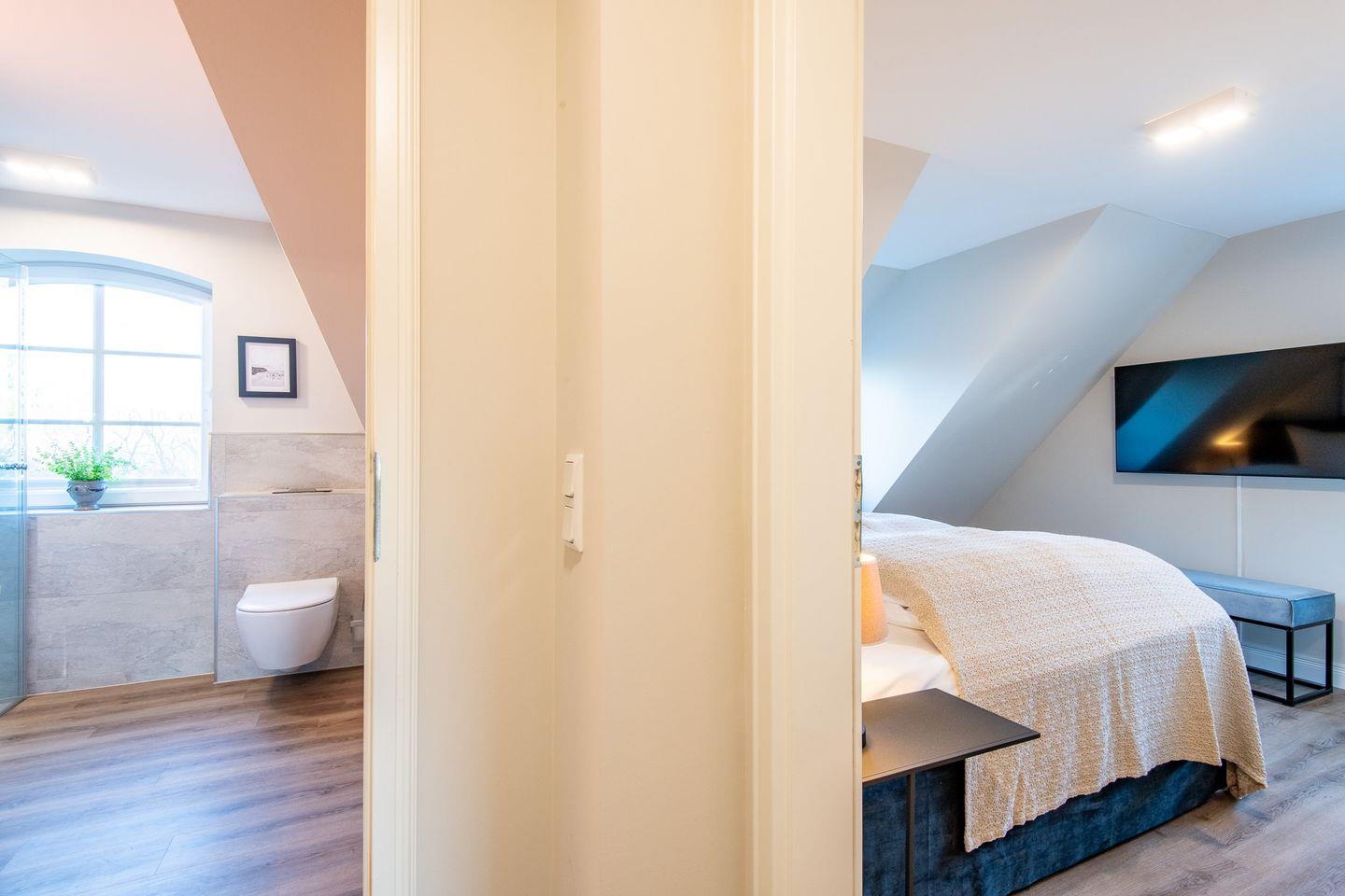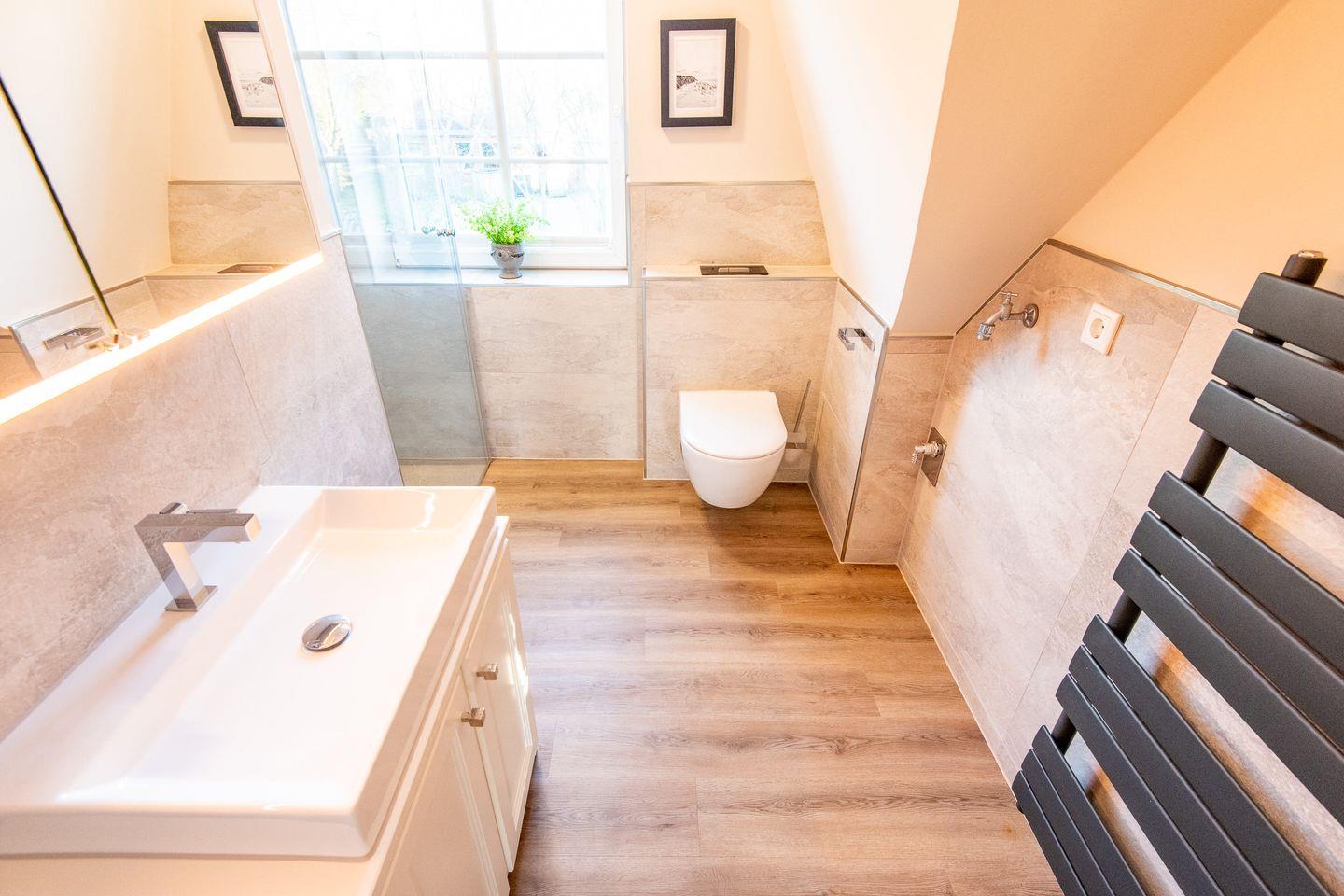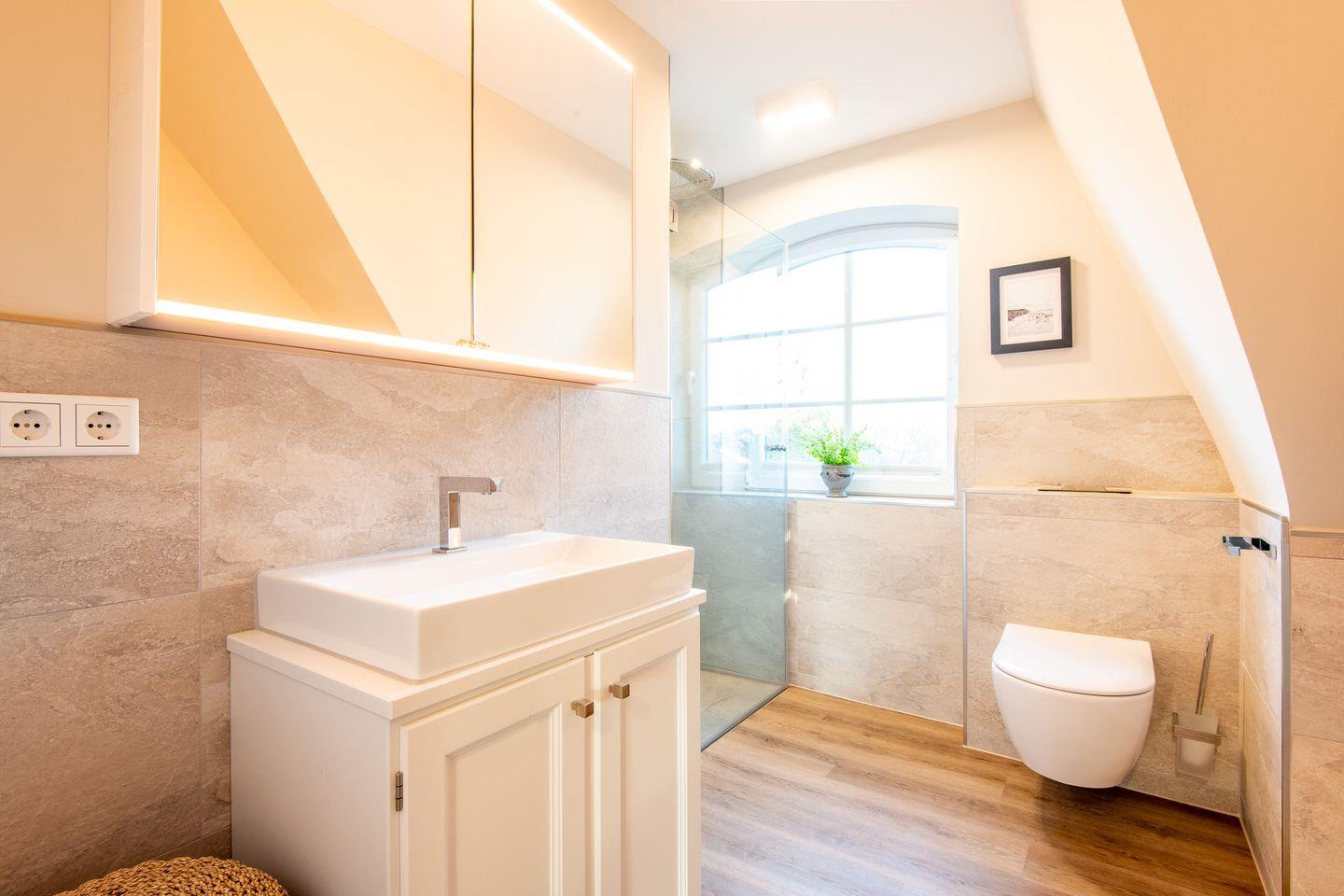 Das Badezimmer überzeugt durch modernes Design und bietet eine ebenerdige Regendusche, WC und zusätzliche Annehmlichkeiten, die einen entspannten Start in den Tag ermöglichen.