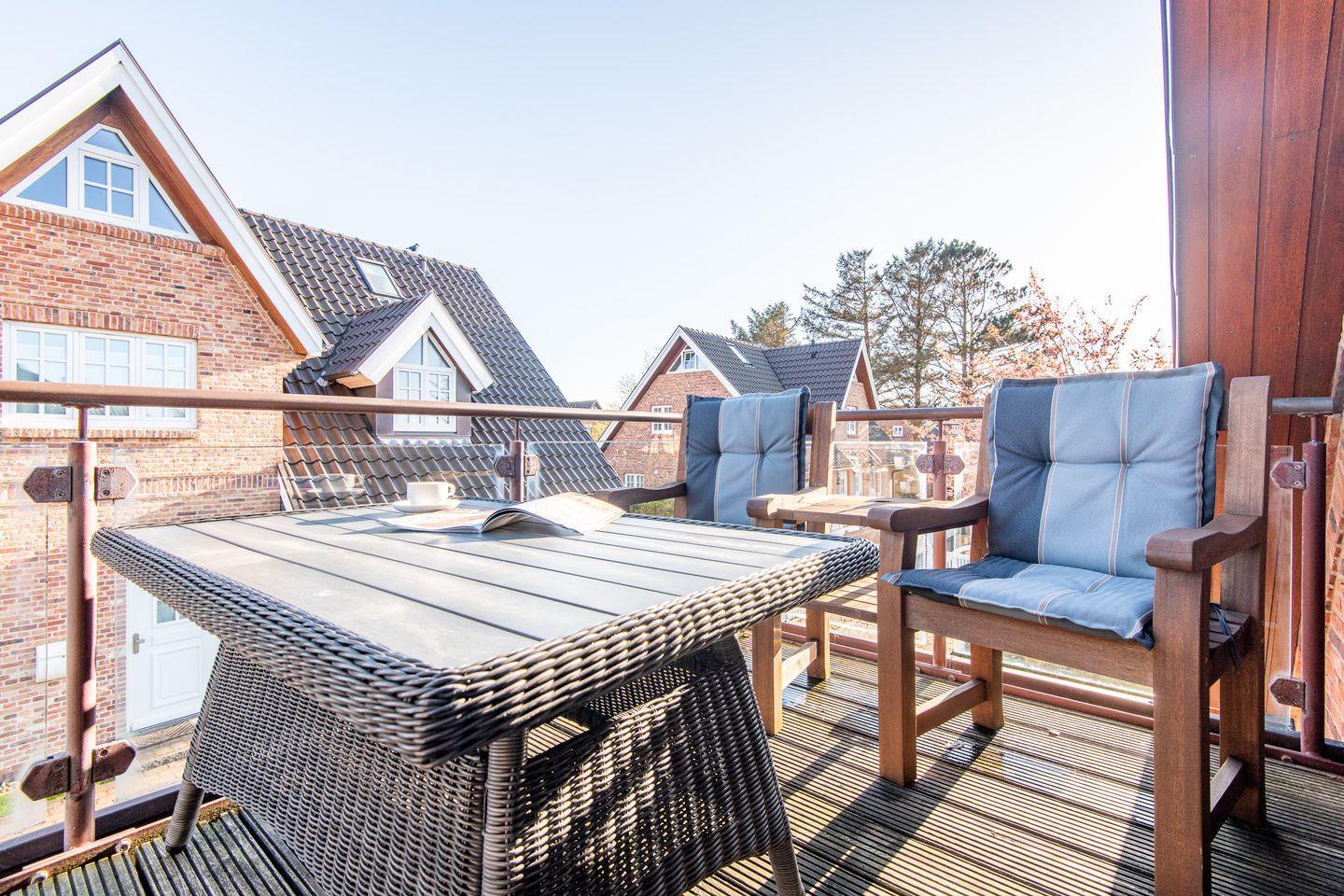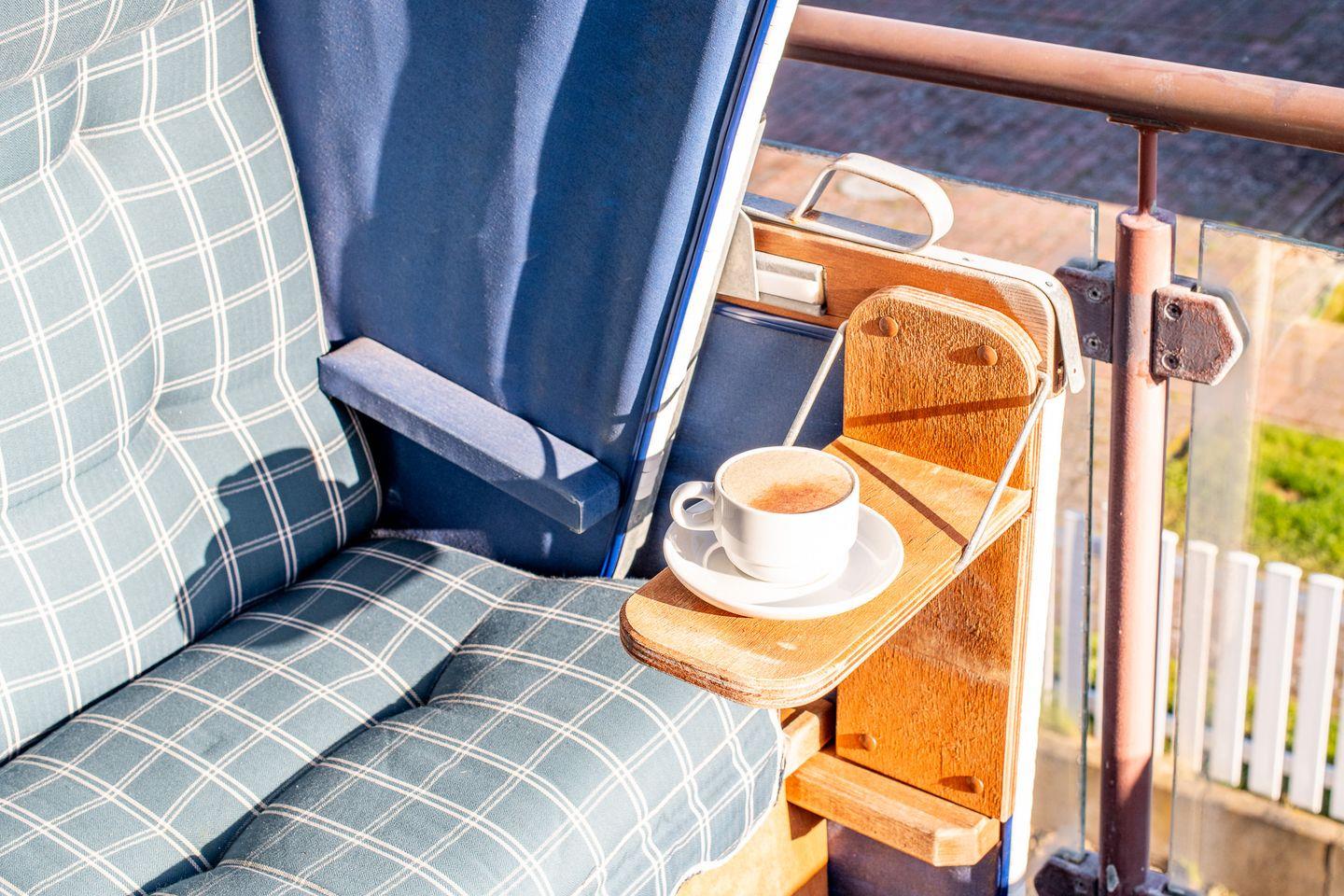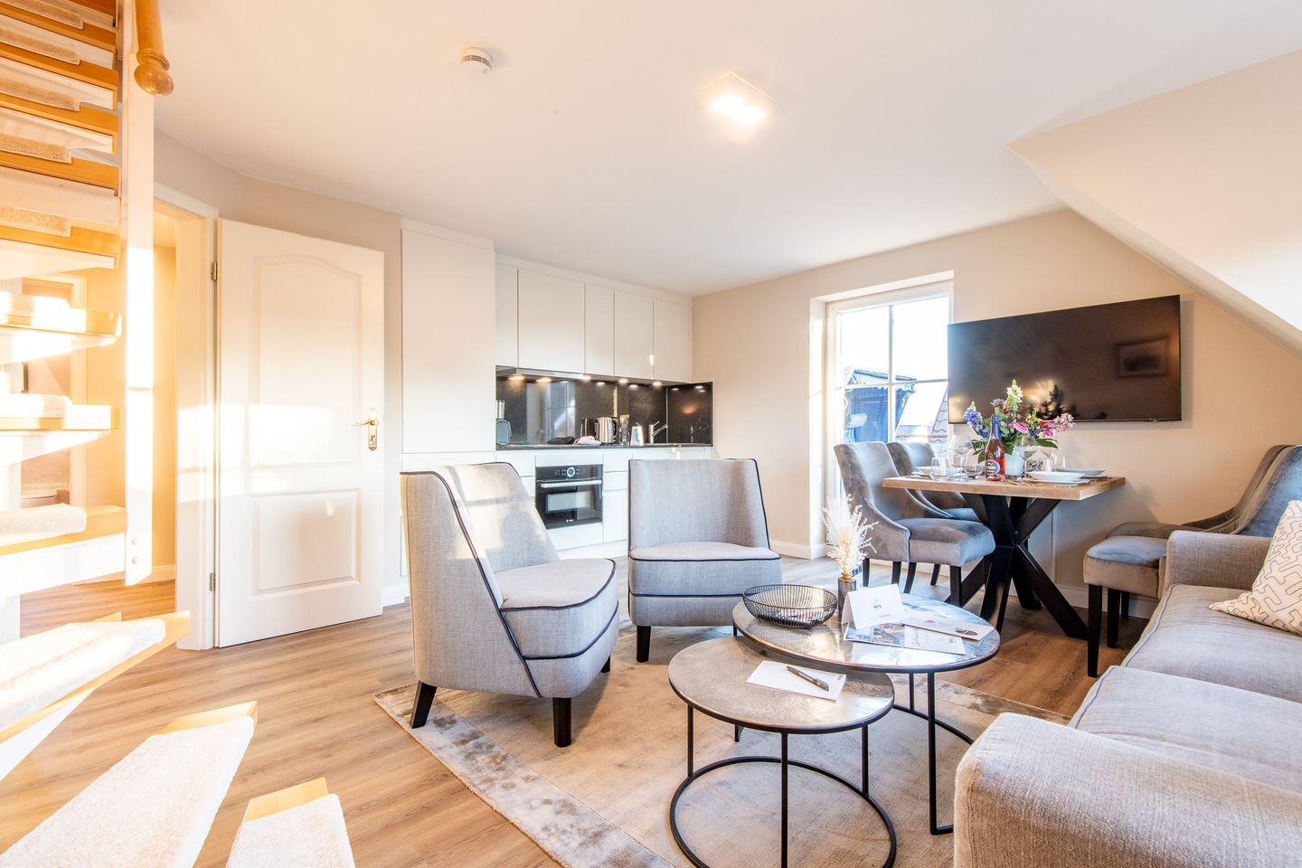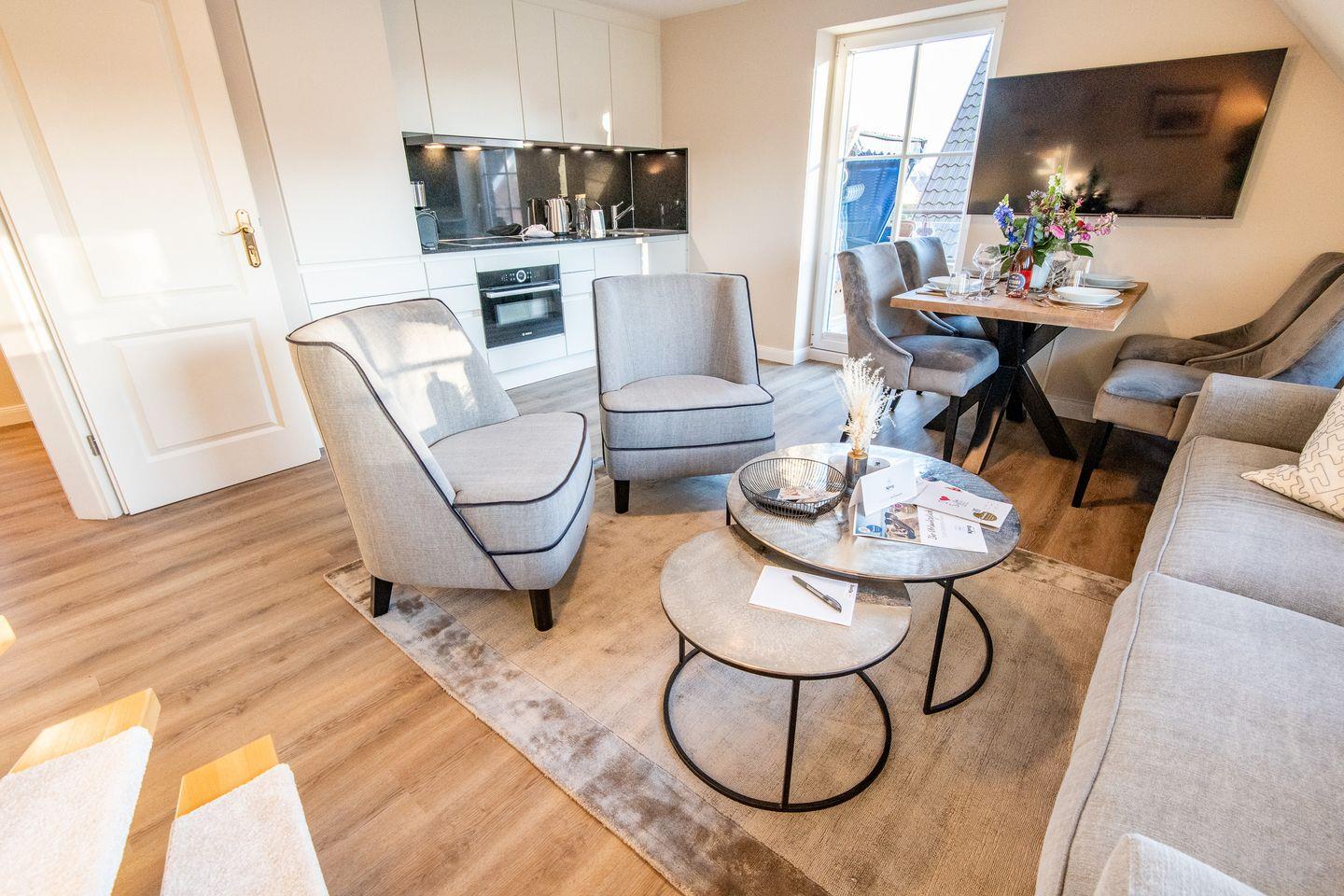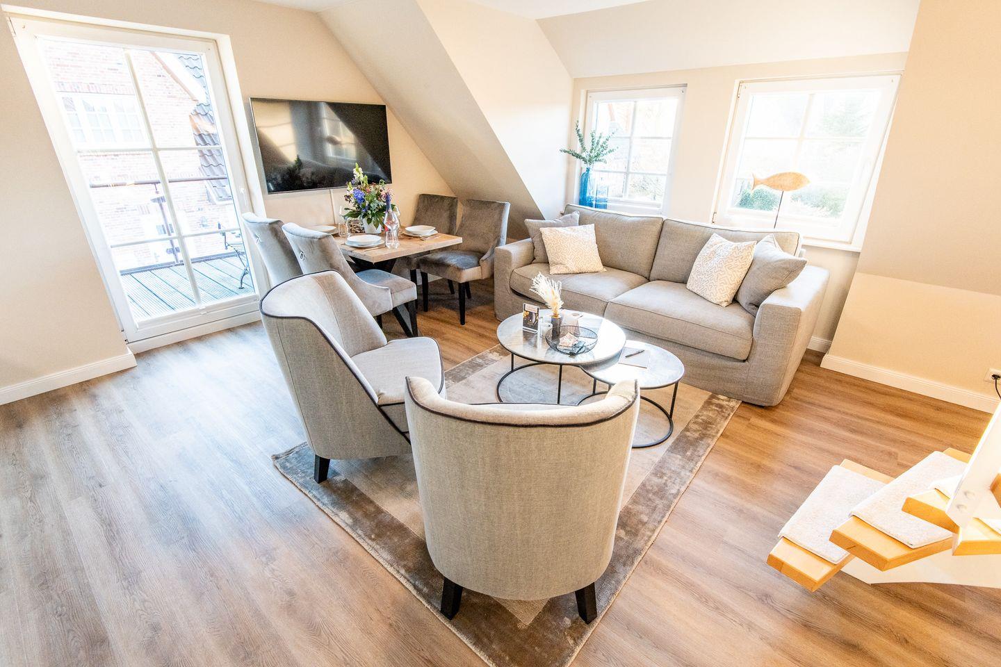 Das gemütliche Wohnzimmer ist mit einem komfortablen Sofa und einem Smart TV ausgestattet und lädt zum Entspannen ein. Vom Wohnzimmer aus haben Sie direkten Zugang zum Balkon, der nach Westen ausgerichtet ist und mit hochwertigen Gartenmöbeln und einem Strandkorb ausgestattet ist – ideal, um die Sylter Sonnenstunden und frische Luft zu genießen.