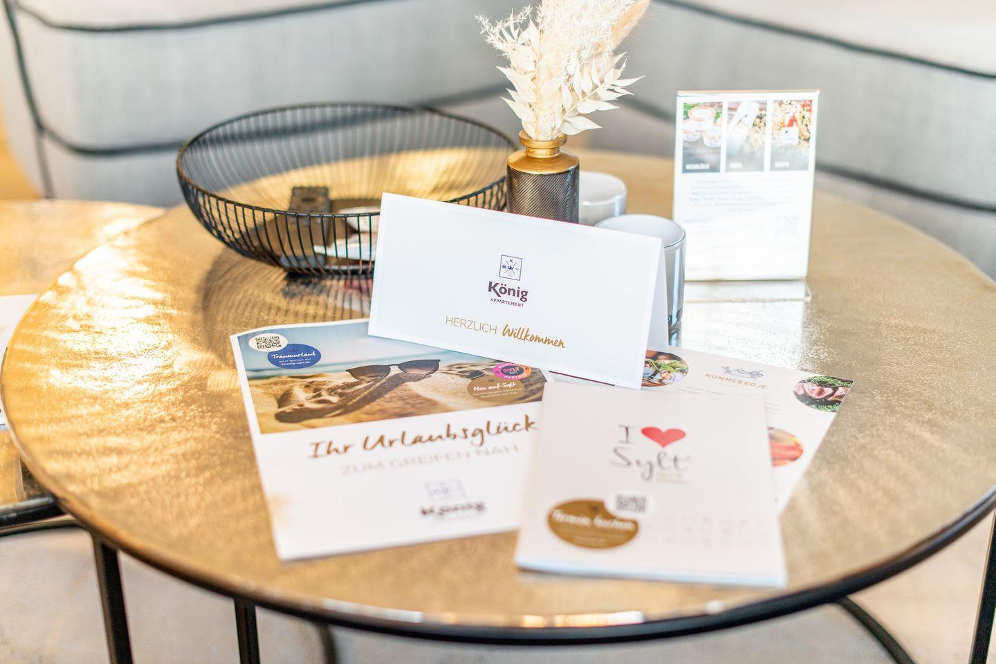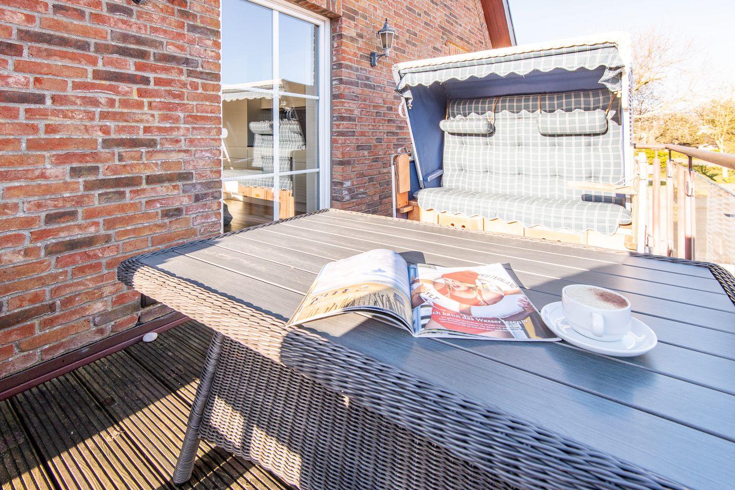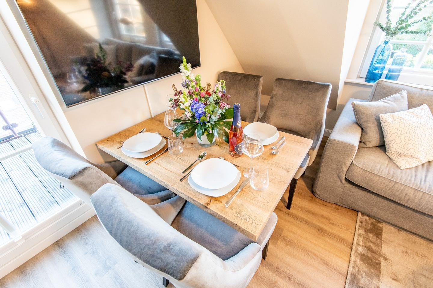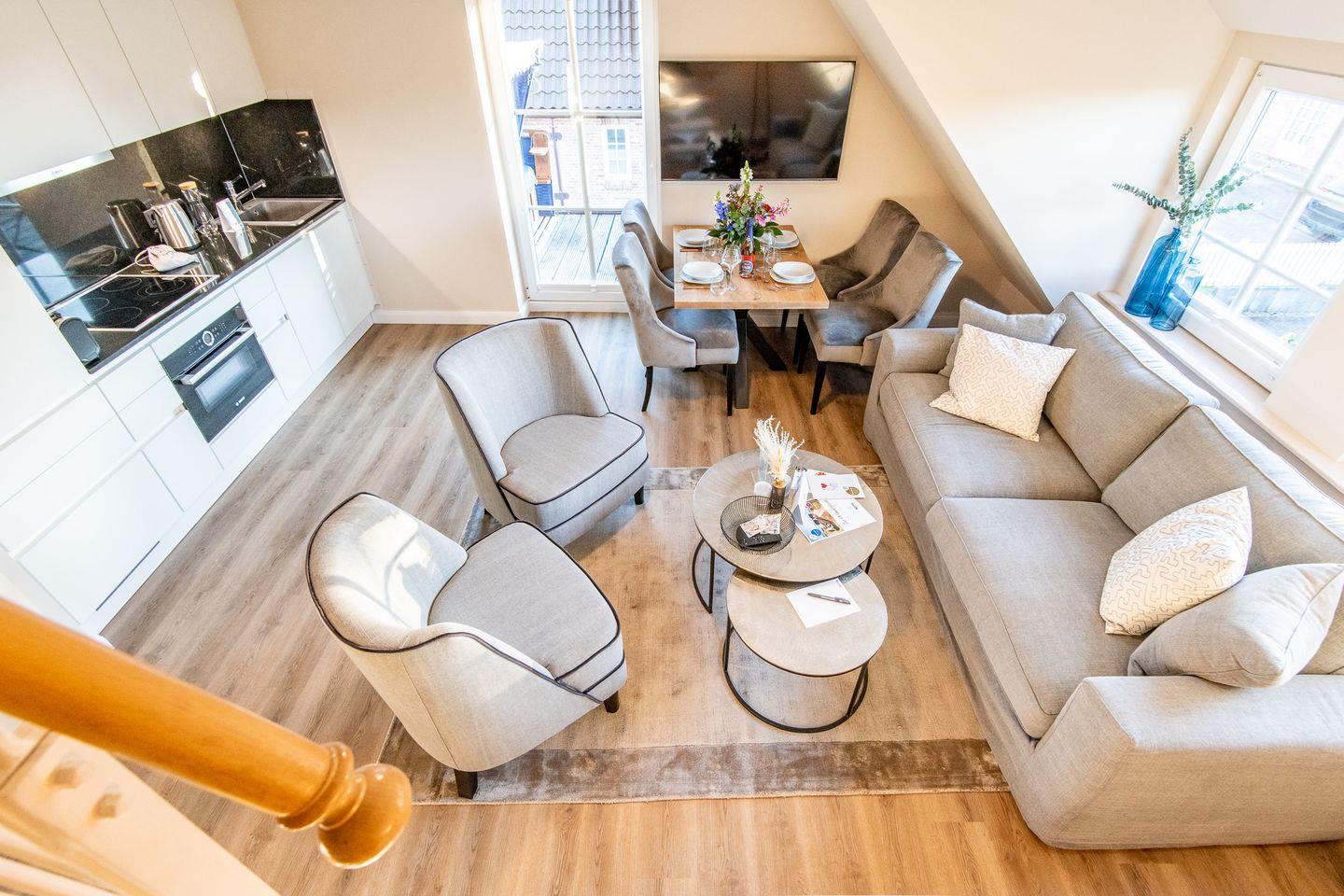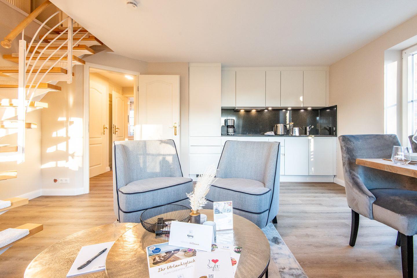 Das gemütliche Wohnzimmer ist mit einem komfortablen Sofa und einem Smart TV ausgestattet und lädt zum Entspannen ein. Vom Wohnzimmer aus haben Sie direkten Zugang zum Balkon, der nach Westen ausgerichtet ist und mit hochwertigen Gartenmöbeln und einem Strandkorb ausgestattet ist – ideal, um die Sylter Sonnenstunden und frische Luft zu genießen.
