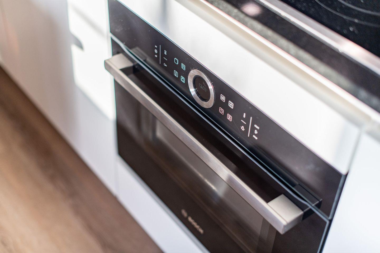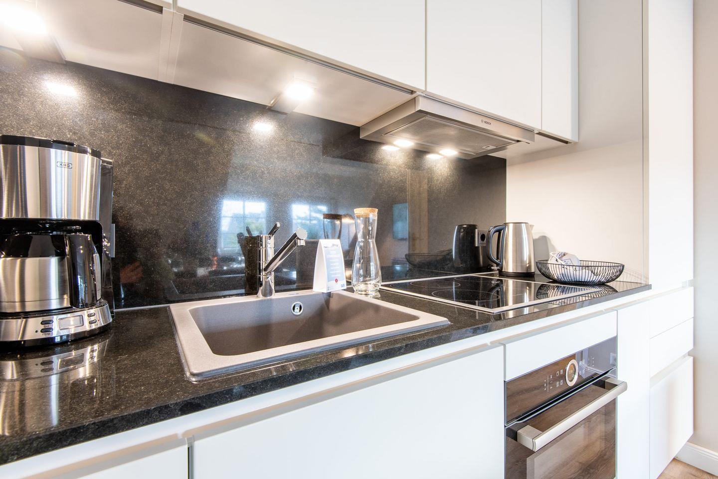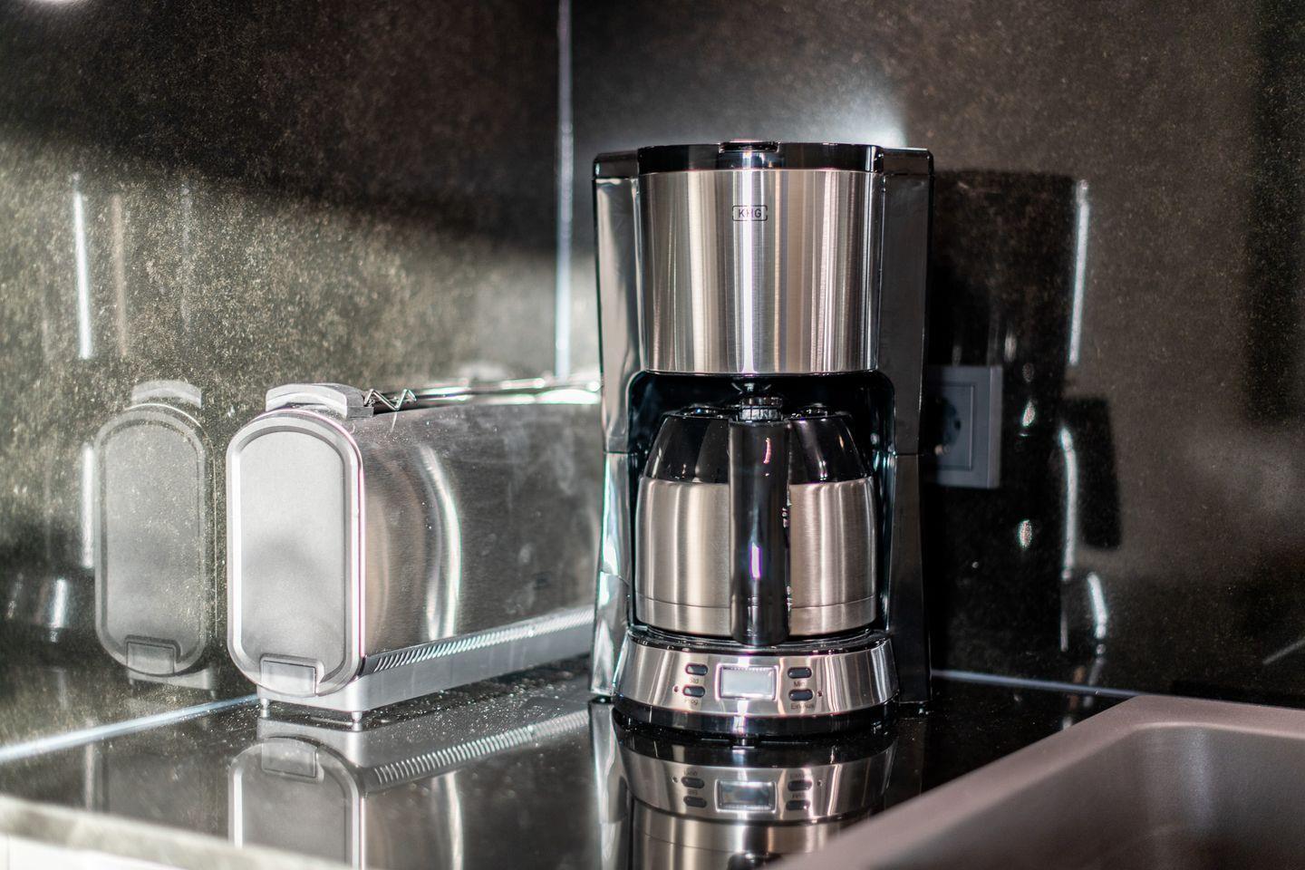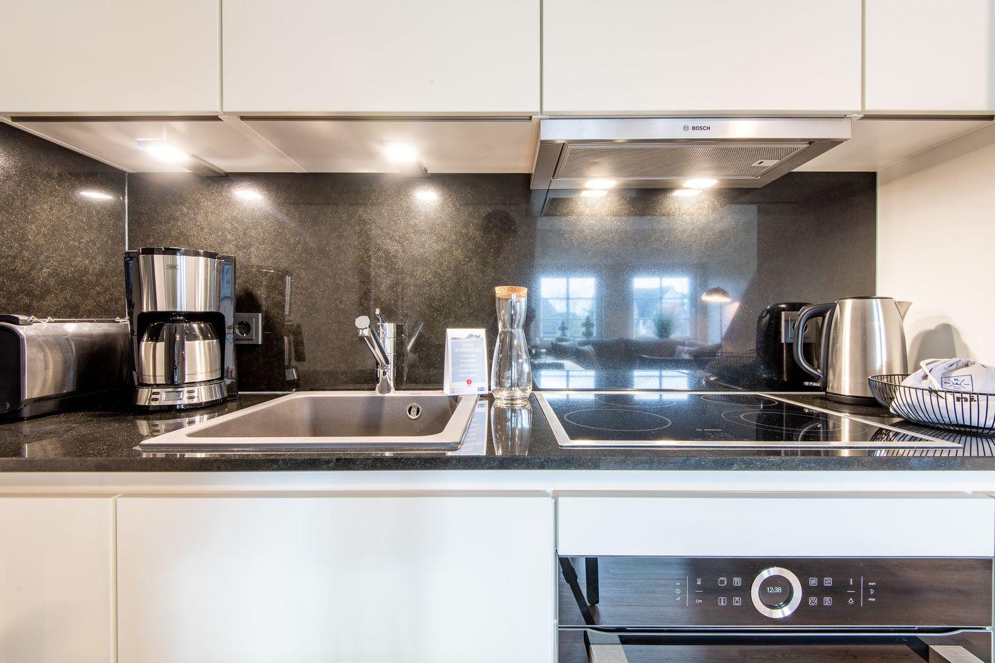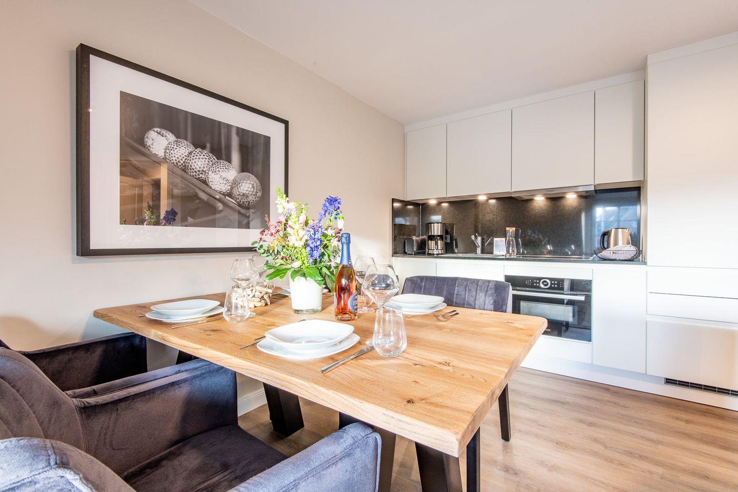 Das gemütliche Wohnzimmer mit einem komfortablen Sofa und Smart TV lädt nach einem erlebnisreichen Tag zum Entspannen ein. Die offene Küche ist stilvoll gestaltet und vollständig ausgestattet – mit Cerankochfeld, Geschirrspüler und Filterkaffeemaschine bleiben keine Wünsche offen. Im angrenzenden Essbereich finden bis zu vier Personen Platz für gemeinsame Mahlzeiten in angenehmer Atmosphäre.