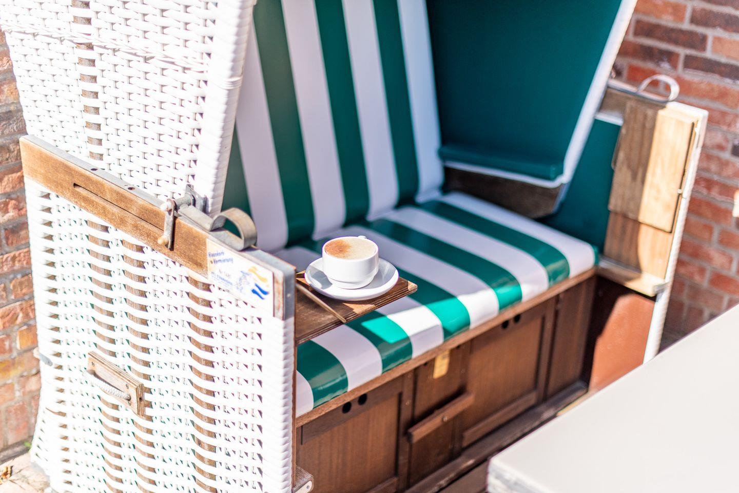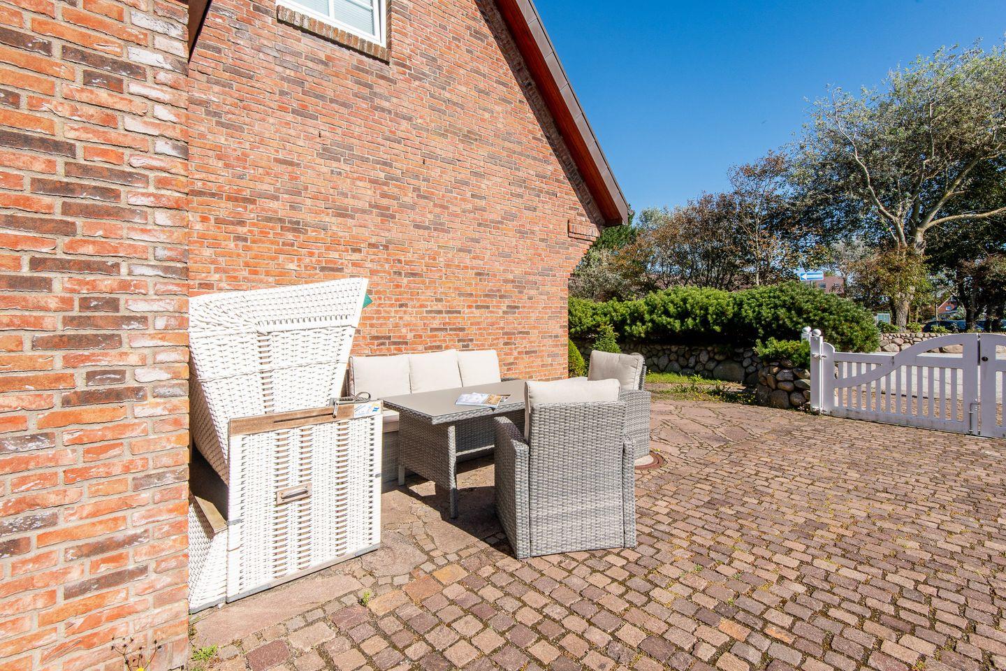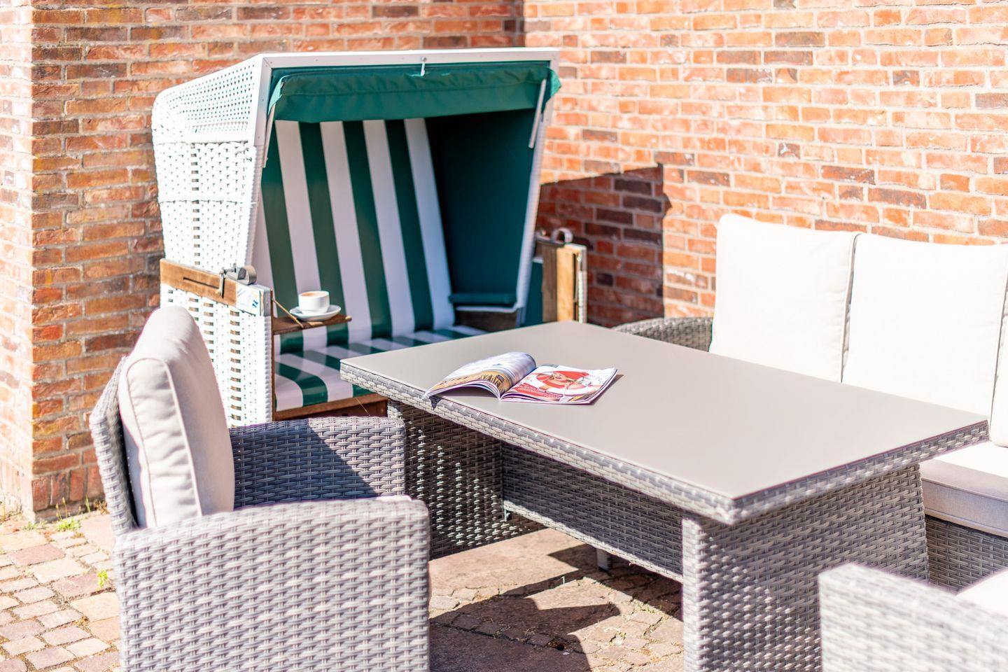 Ein besonderes Highlight ist der Sonnenfreisitz auf der Südseite des Hauses, ausgestattet mit hochwertigen Gartenmöbeln und einem Strandkorb. Hier können Sie die Sylter Sonne genießen und den Tag entspannt ausklingen lassen.