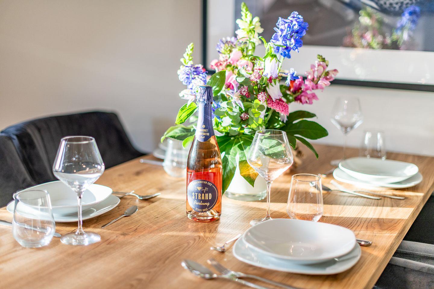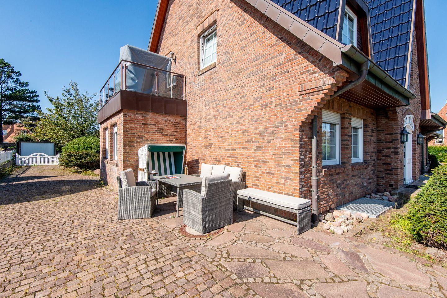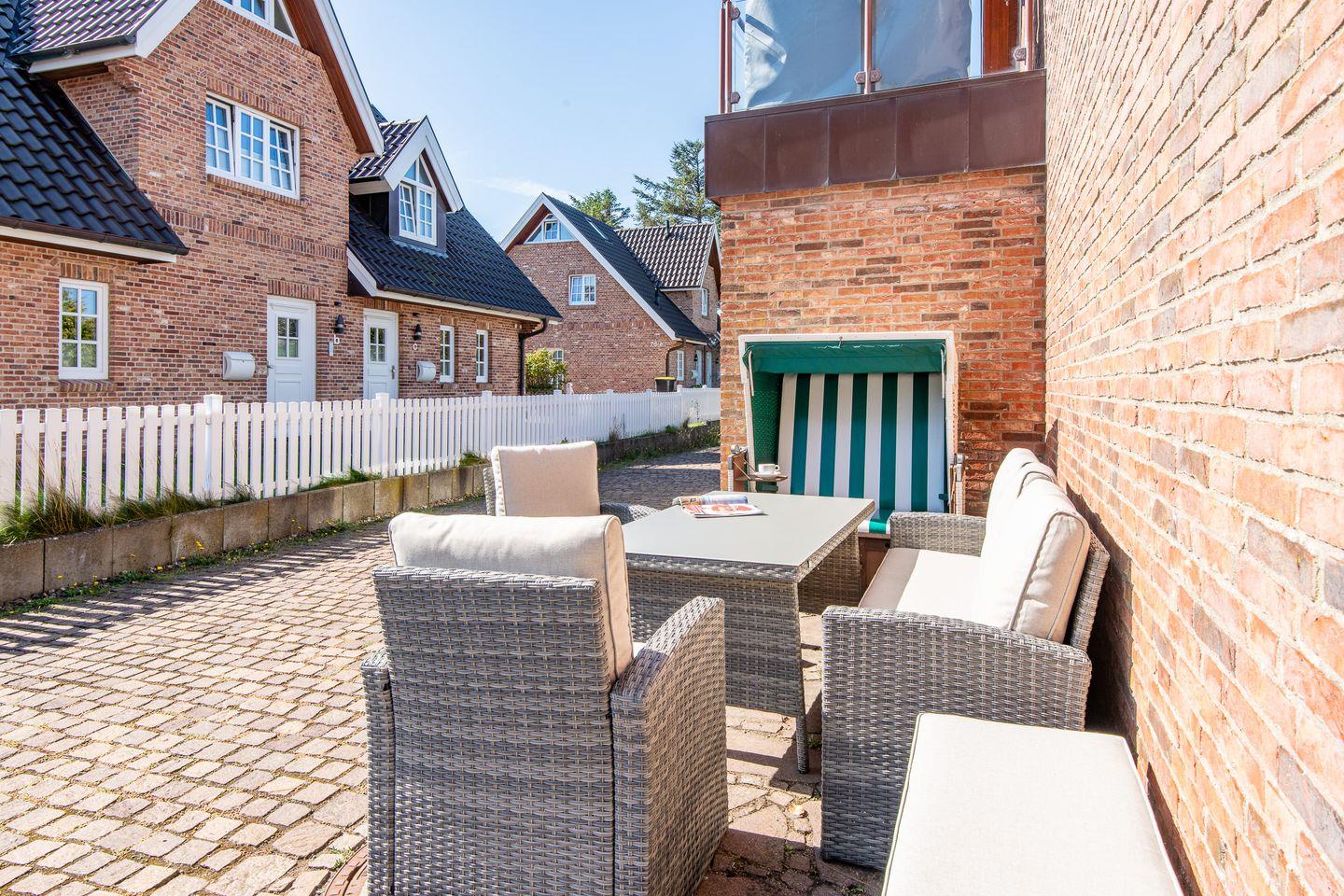 Ein besonderes Highlight ist der Sonnenfreisitz auf der Südseite des Hauses, ausgestattet mit hochwertigen Gartenmöbeln und einem Strandkorb. Hier können Sie die Sylter Sonne genießen und den Tag entspannt ausklingen lassen.