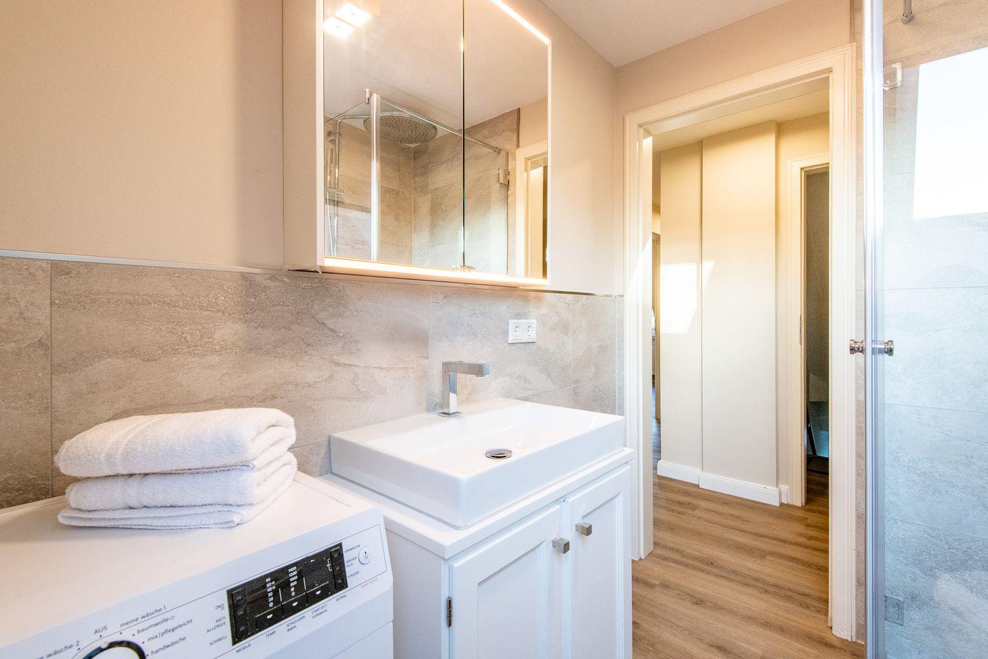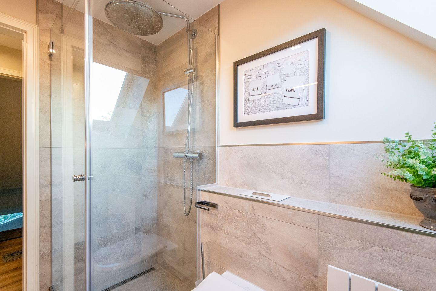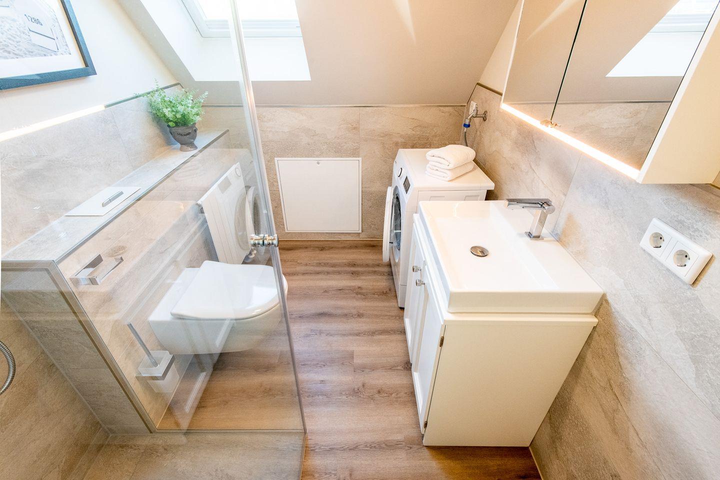 Das moderne Badezimmer ist mit einer ebenerdigen Regendusche und WC ausgestattet und bietet Ihnen erfrischenden Komfort in stilvollem Ambiente.